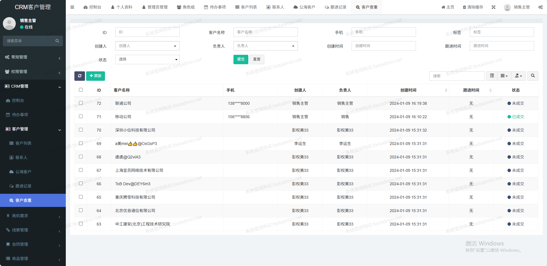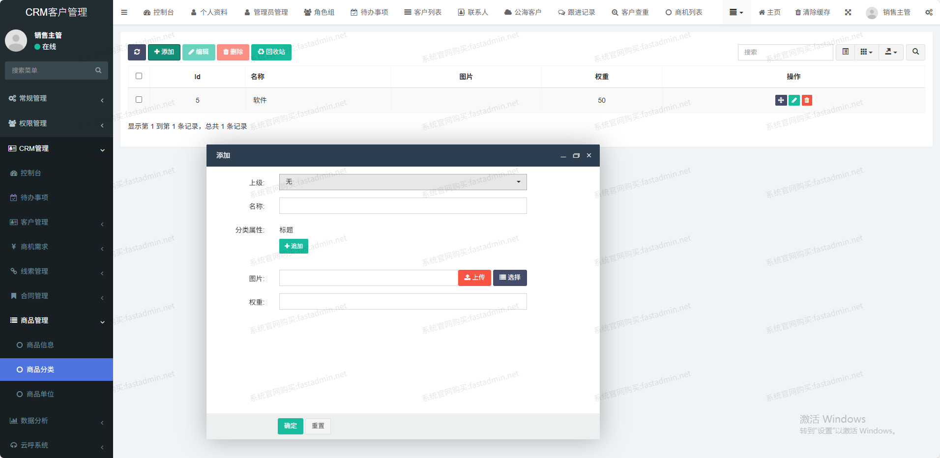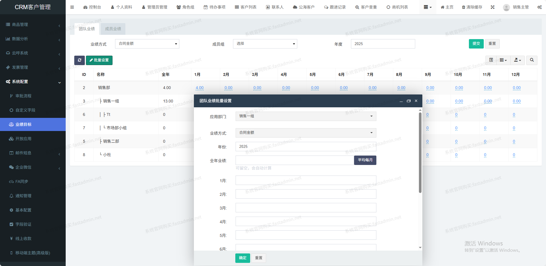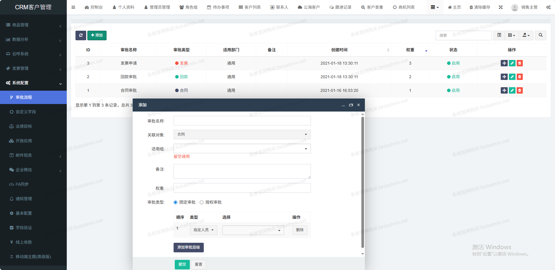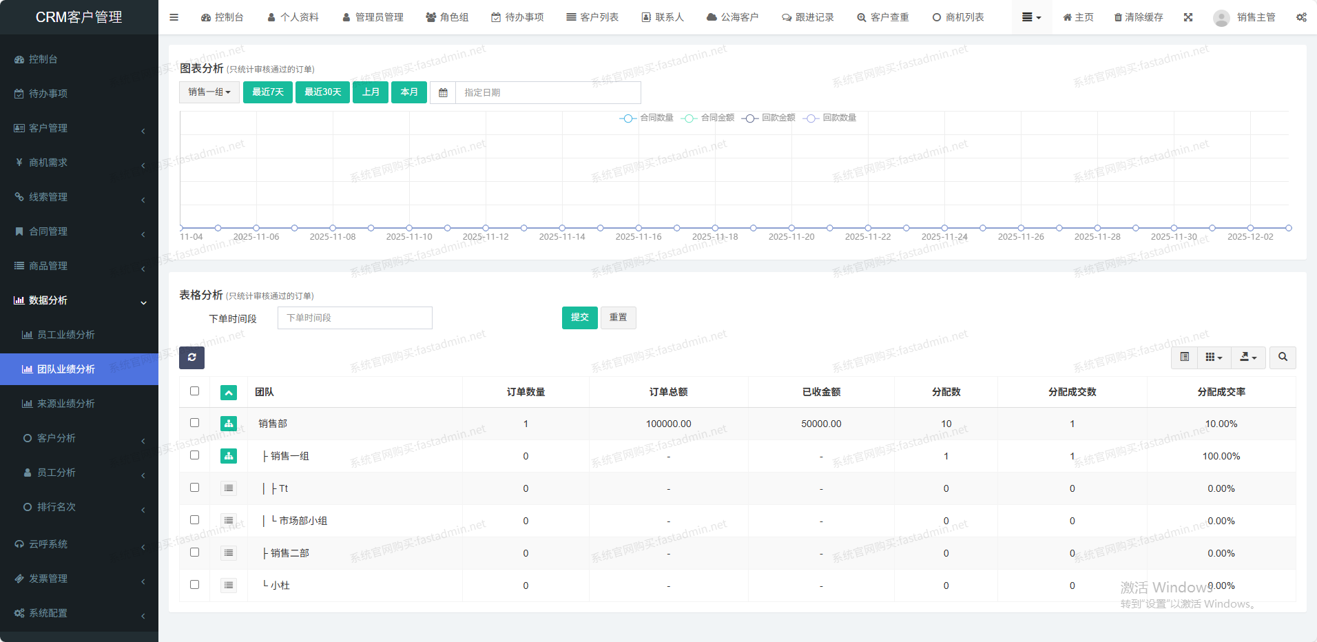 (1)客户管理支持客户跟进、放进公海、公海领取等操作,支持管理联系人信息(2)商机需求支持后台自由添加修改商机需求,支持关联客户、产品等信息(3)合同管理支持后台添加编辑合同,支持设定合同的关联商机和商品,支持添加回款(4)商品管理支持后台添加商品分类、商品单位,录入商品信息等功能(5)自定义字段支持自定义客户字段,支持自定义联系人字段(6)业绩设定支持业绩目标按月的设定,支持团队业绩和成员业绩(7)审批流程支持自定义合同审批流程和自定义回款审批流程(8)数据分析