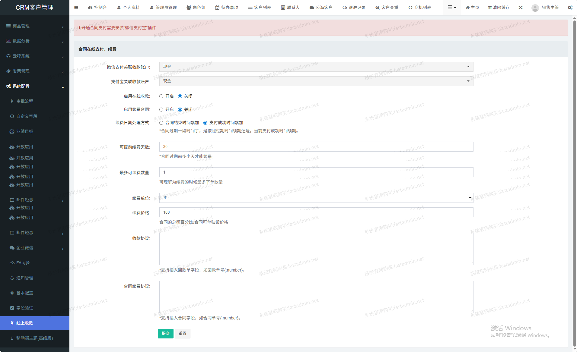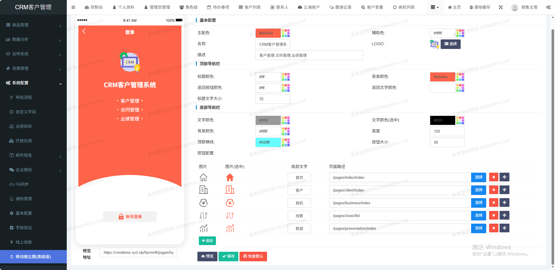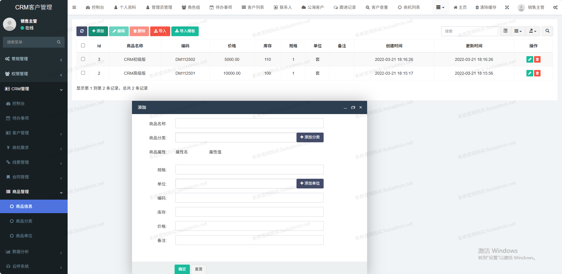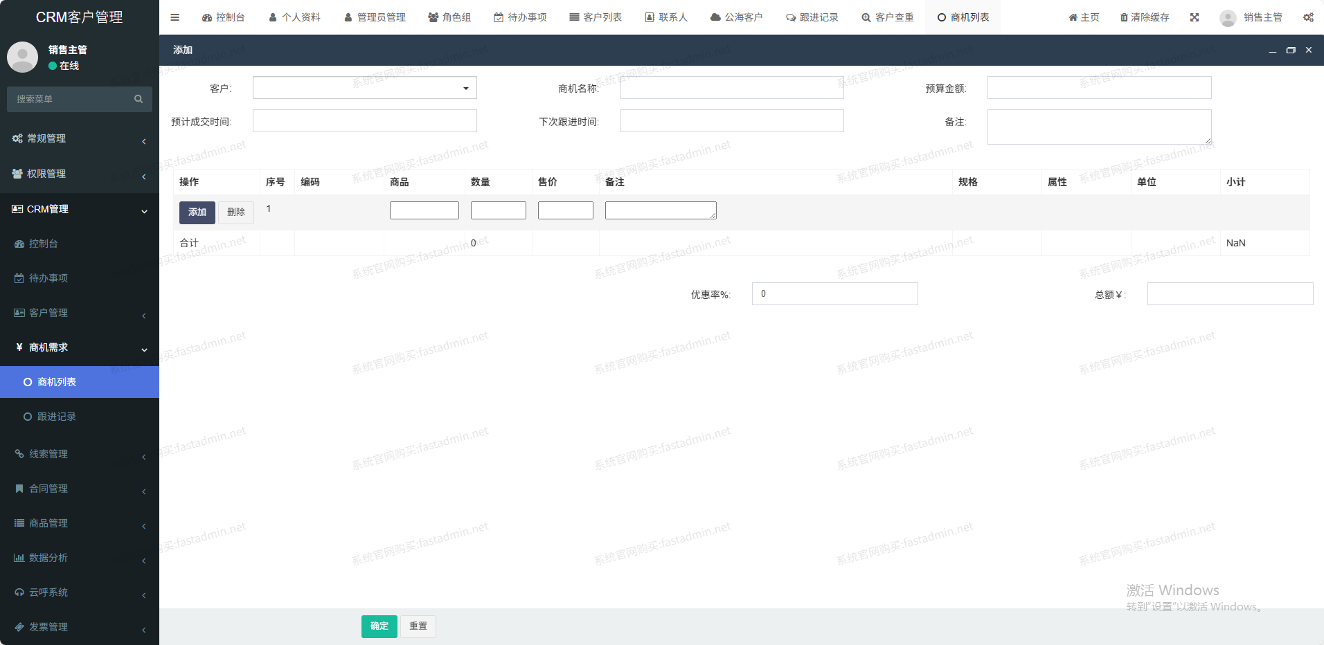 (1)客户管理支持客户跟进、放进公海、公海领取等操作,支持管理联系人信息(2)商机需求支持后台自由添加修改商机需求,支持关联客户、产品等信息(3)合同管理支持后台添加编辑合同,支持设定合同的关联商机和商品,支持添加回款(4)商品管理支持后台添加商品分类、商品单位,录入商品信息等功能(5)自定义字段支持自定义客户字段,支持自定义联系人字段(6)业绩设定支持业绩目标按月的设定,支持团队业绩和成员业绩(7)审批流程支持自定义合同审批流程和自定义回款审批流程(8)数据分析