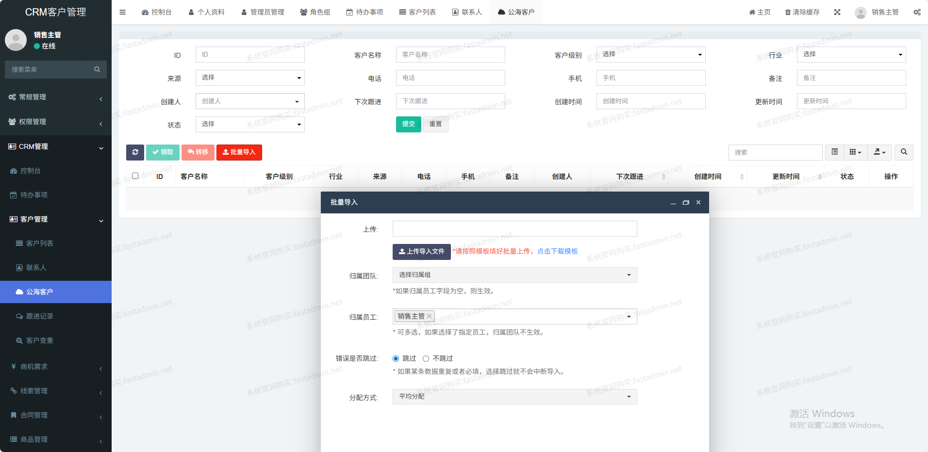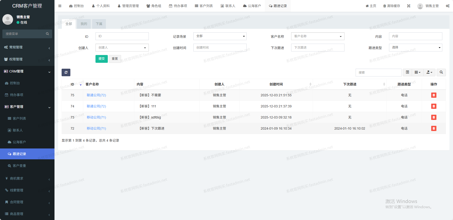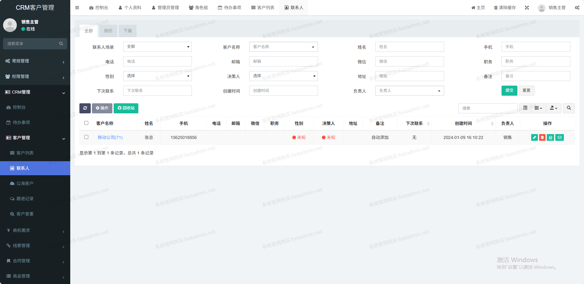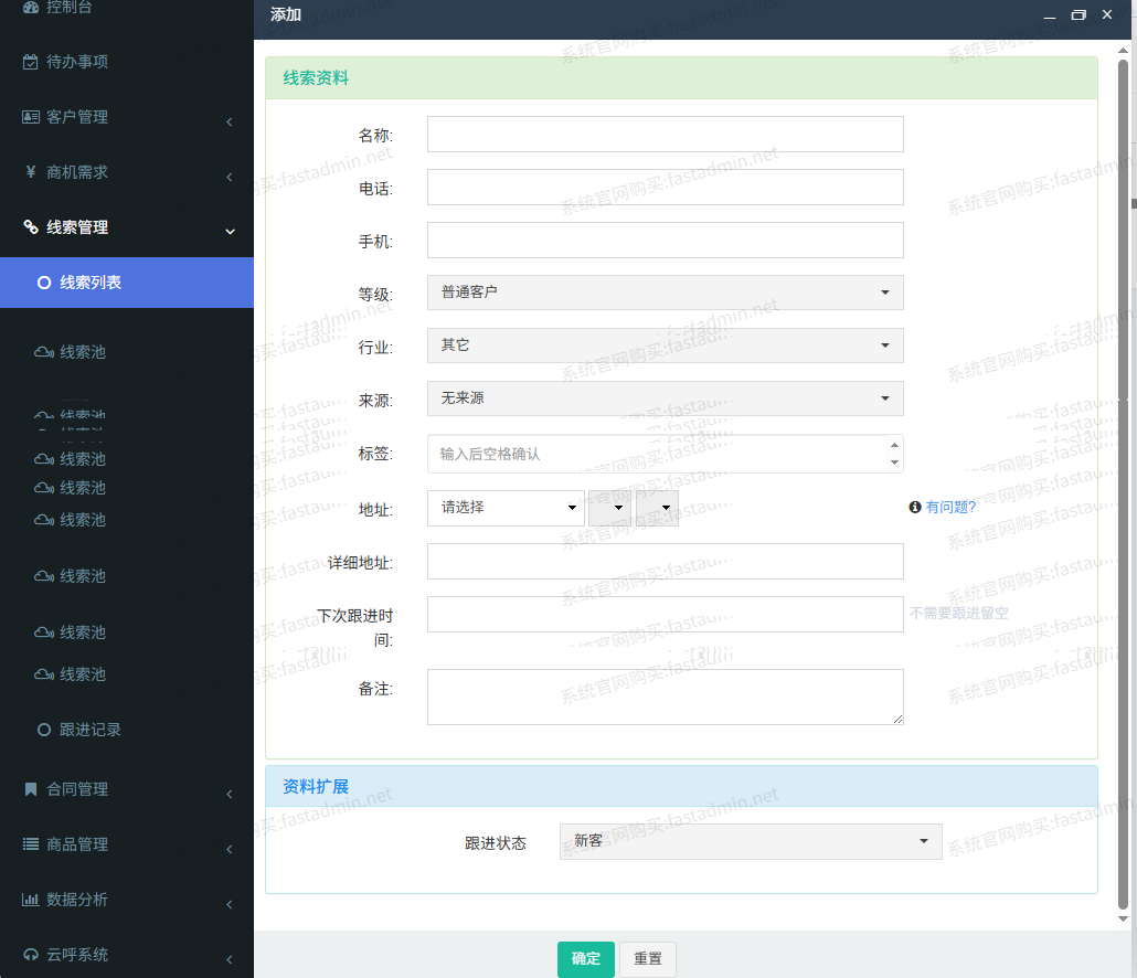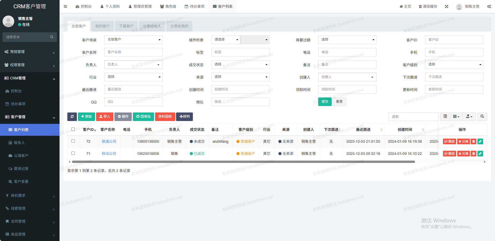 (1)客户管理支持客户跟进、放进公海、公海领取等操作,支持管理联系人信息(2)商机需求支持后台自由添加修改商机需求,支持关联客户、产品等信息(3)合同管理支持后台添加编辑合同,支持设定合同的关联商机和商品,支持添加回款(4)商品管理支持后台添加商品分类、商品单位,录入商品信息等功能(5)自定义字段支持自定义客户字段,支持自定义联系人字段(6)业绩设定支持业绩目标按月的设定,支持团队业绩和成员业绩(7)审批流程支持自定义合同审批流程和自定义回款审批流程(8)数据分析