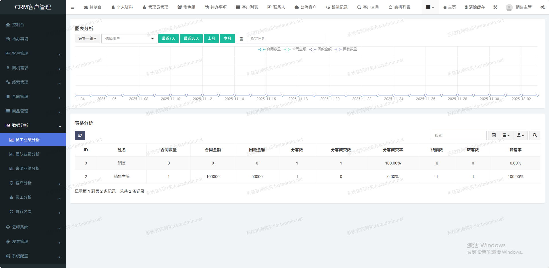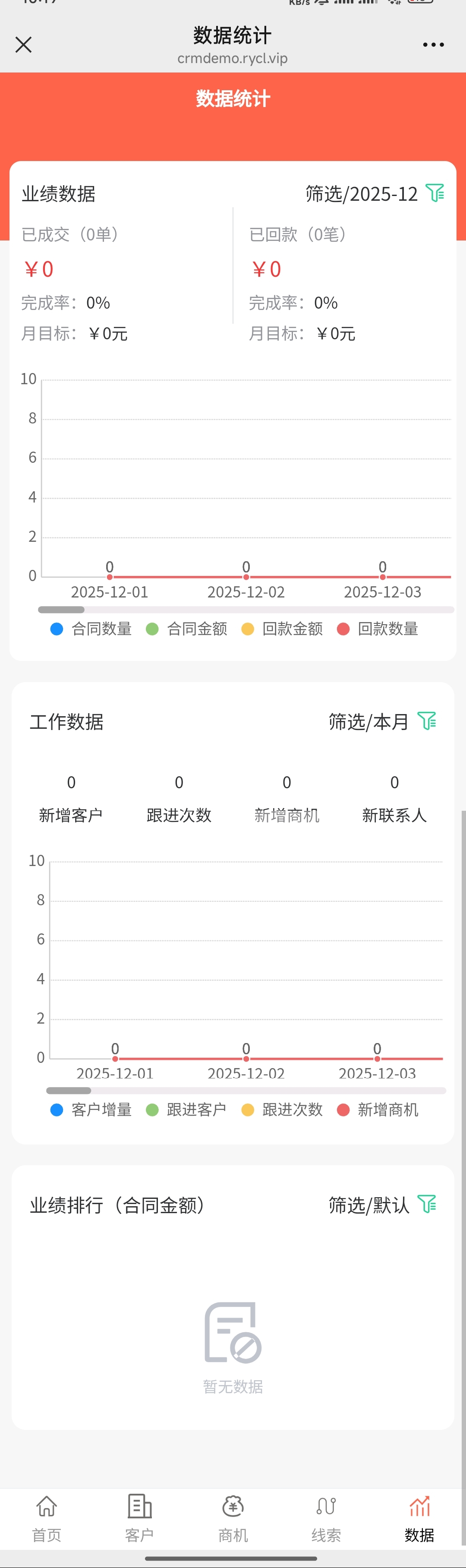 支持客户分析(地区、来源)、员工分析(客户量、业绩)、排行(跟进、新客)