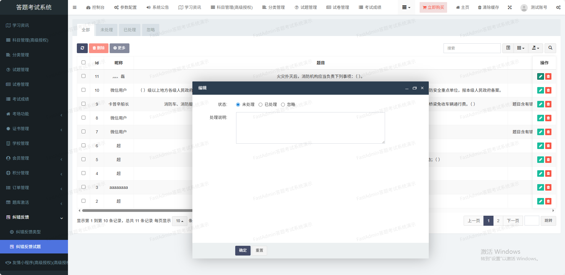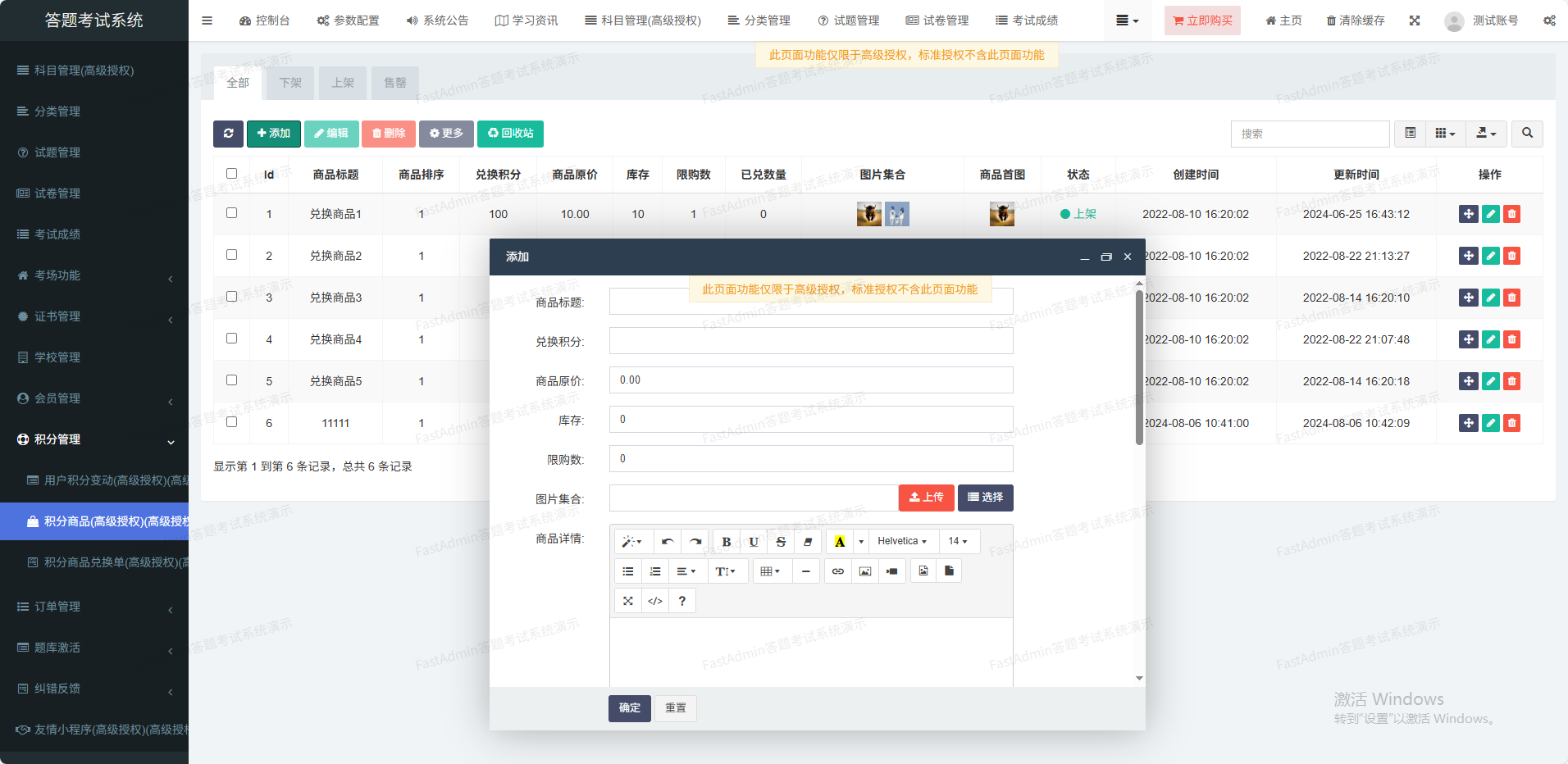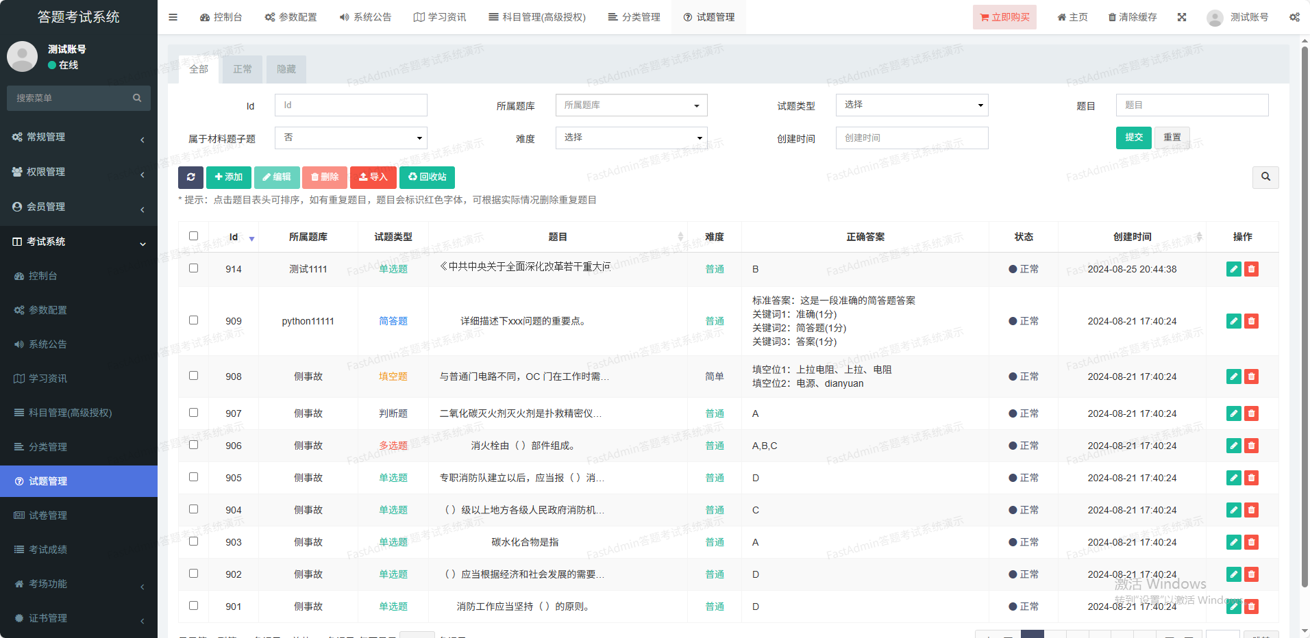 支持判断题、单选题、多选题、填空题、简答题、材料题六种试题类型