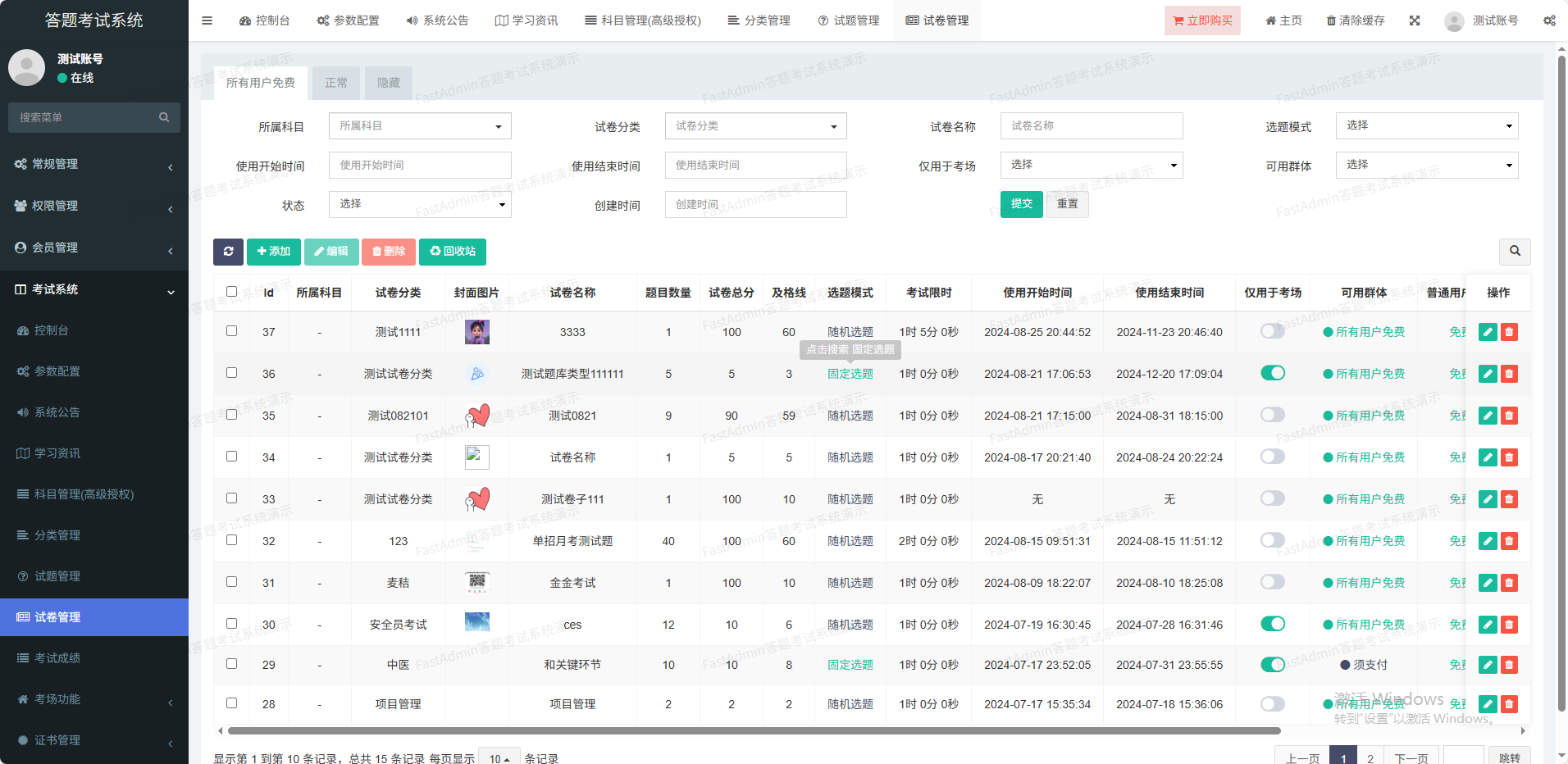 设置考场考卷,进入考场按统一考卷考试