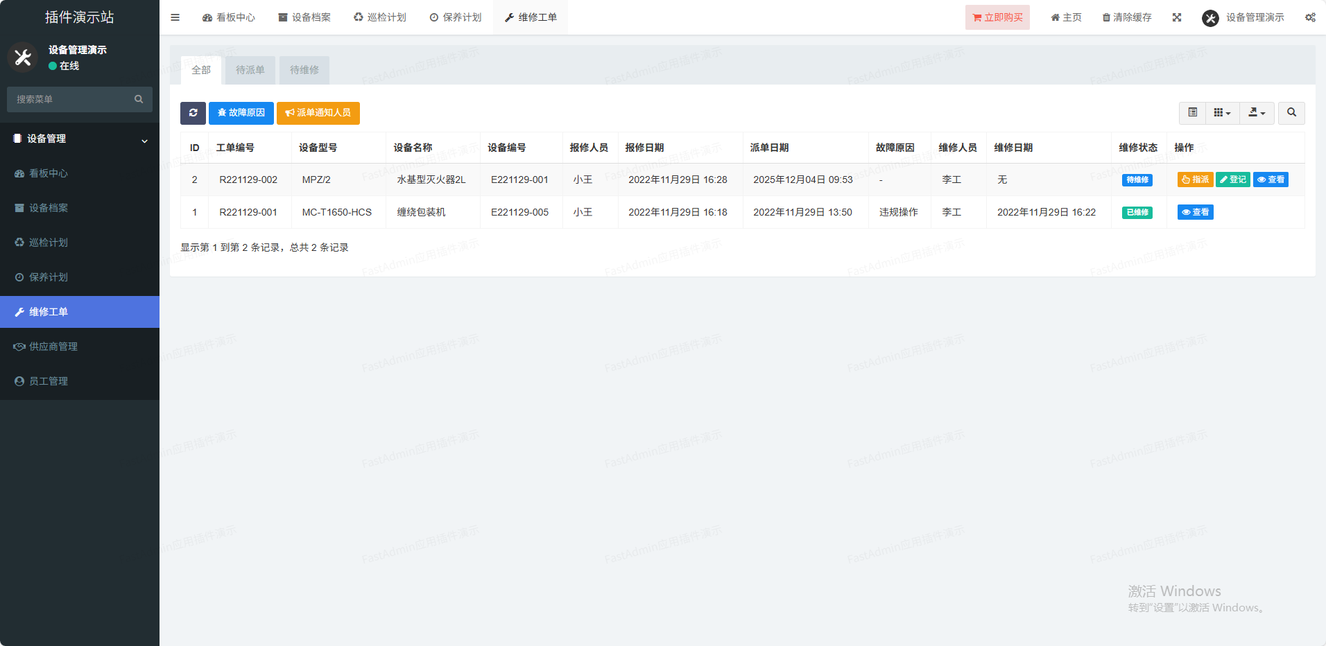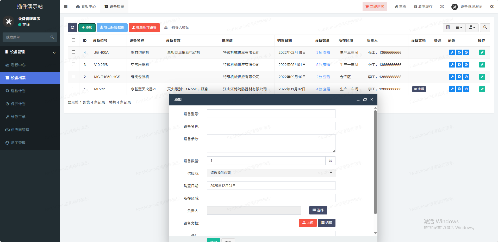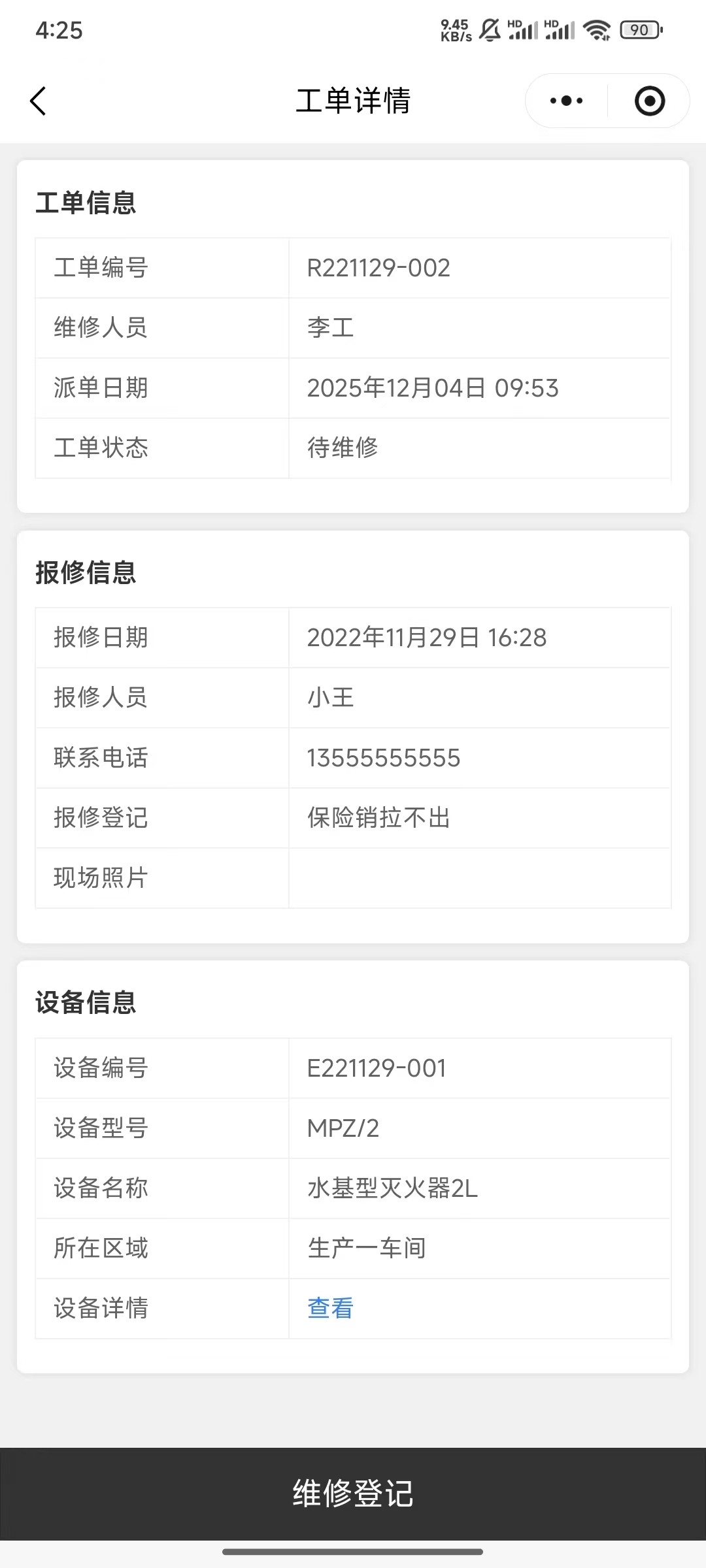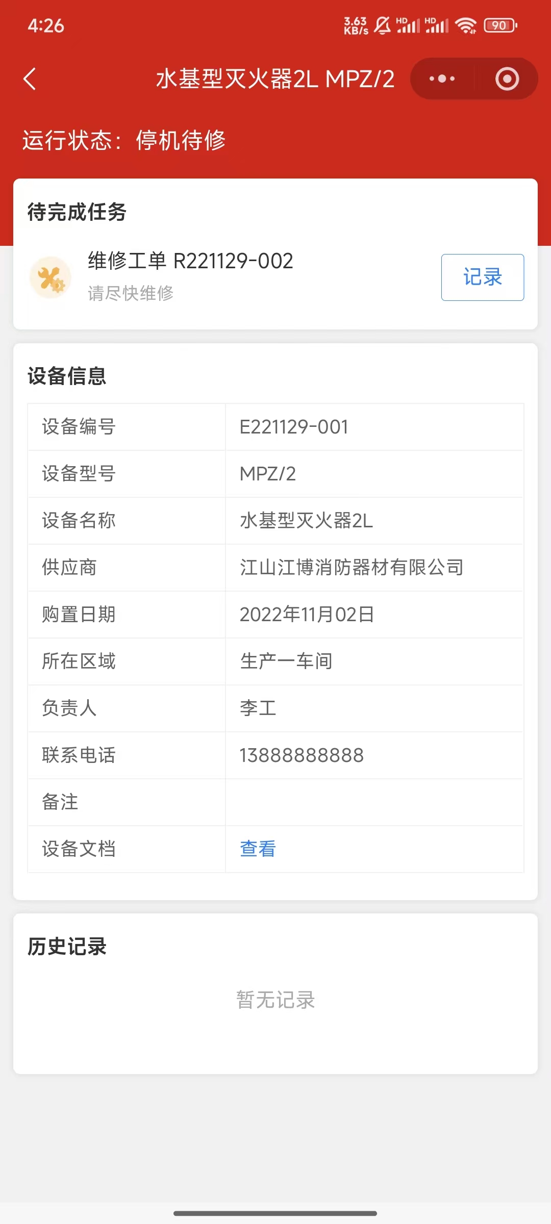 (1)一物一码每个设备都有专属二维码,设备信息扫码即得(2)设备标签自定义打印标签样式提供设备标签数据导出,(3)设备档案以档案为维度精益化管理多类型设备(4)设备维修现场无纸化工单提交,随时提交随时响应(5)巡检计划支持自定义巡检项,多种字段类型选择配置(6)保养计划支持自定义保养项,多种字段类型选择配置(7)设备记录支持查看设备全生命周期内操作日志,从源头追湖问题(8)员工管理支持按部门分配设备管理权限,员工管理设备更方便(9)工作台支持查看所负责管理的设备状态及进度(10)批量导入支持批量导入初期设备数据(11)响应式PC端响应式布局,手机、平板、PC端界面自适应匹配