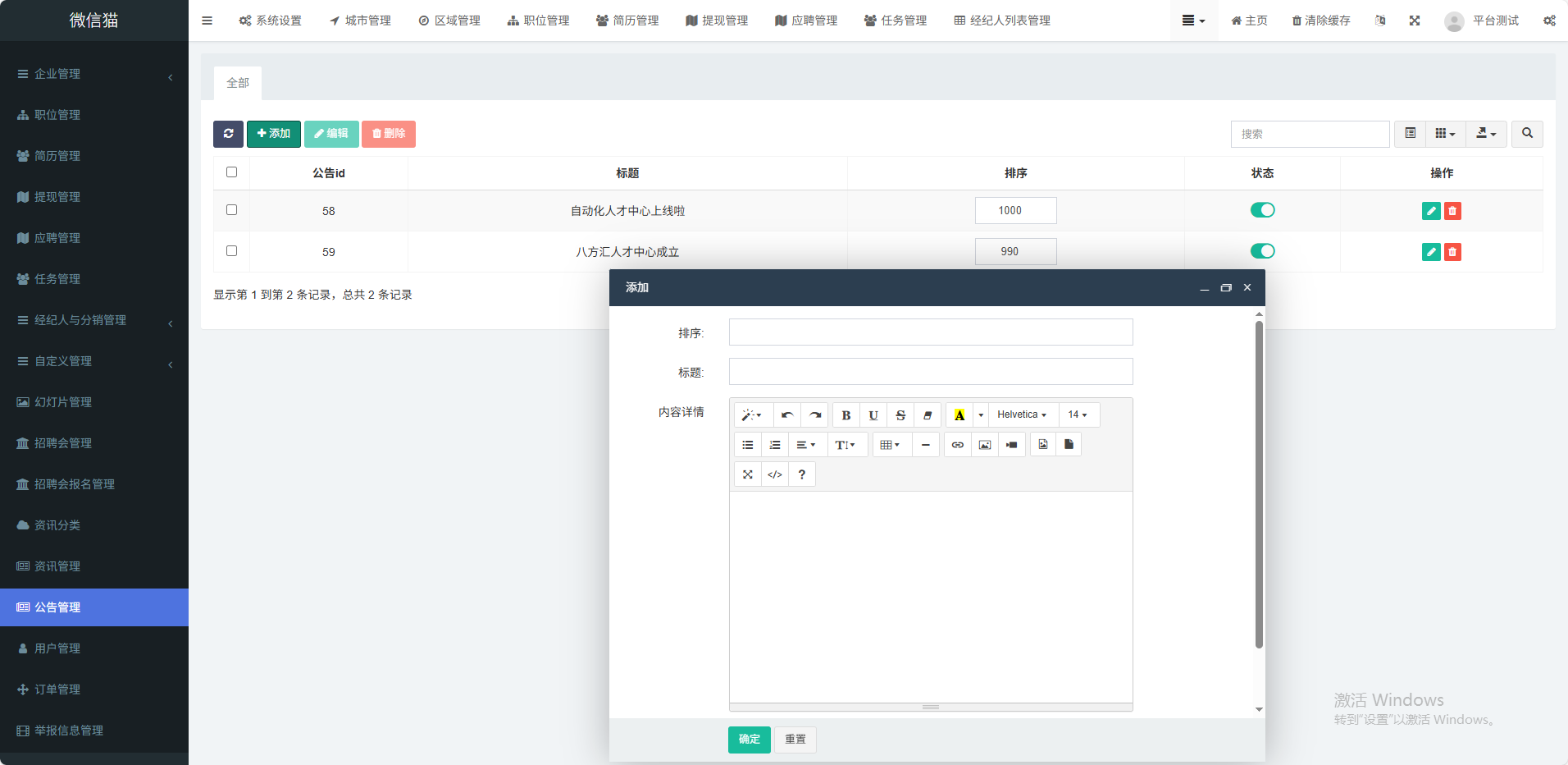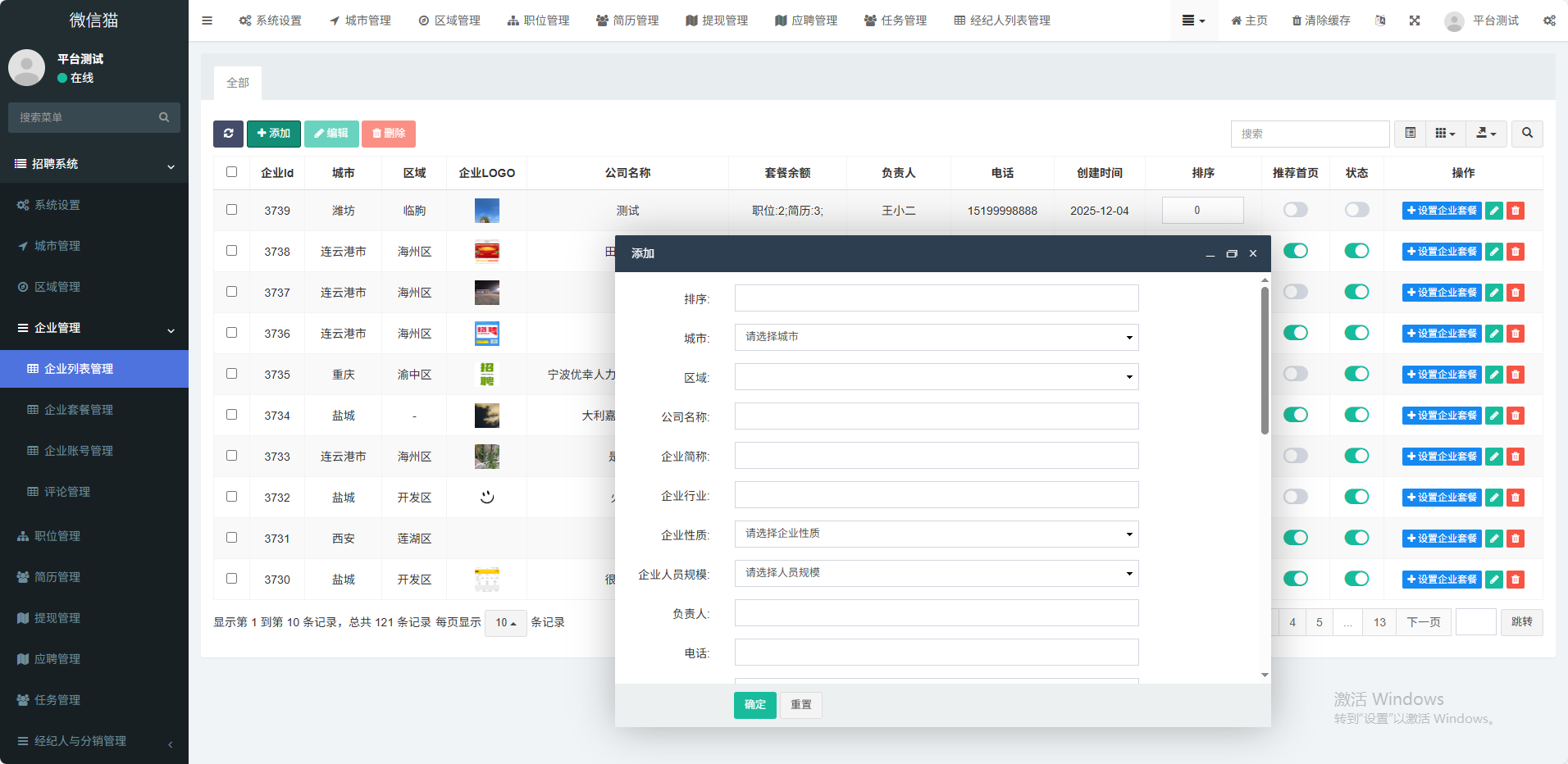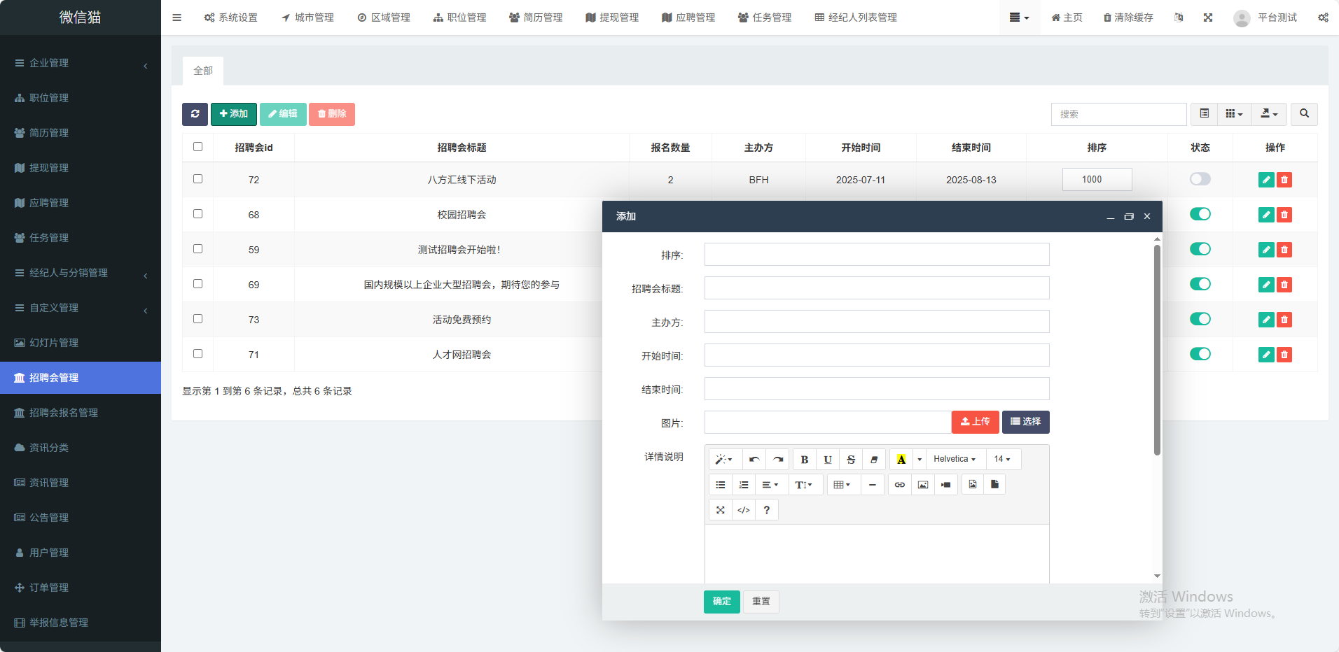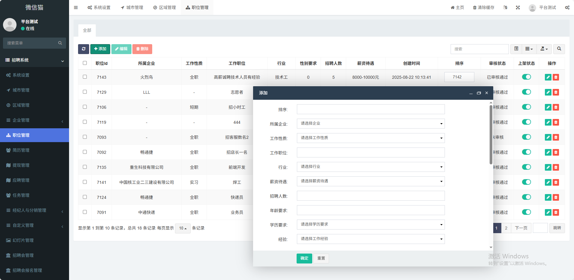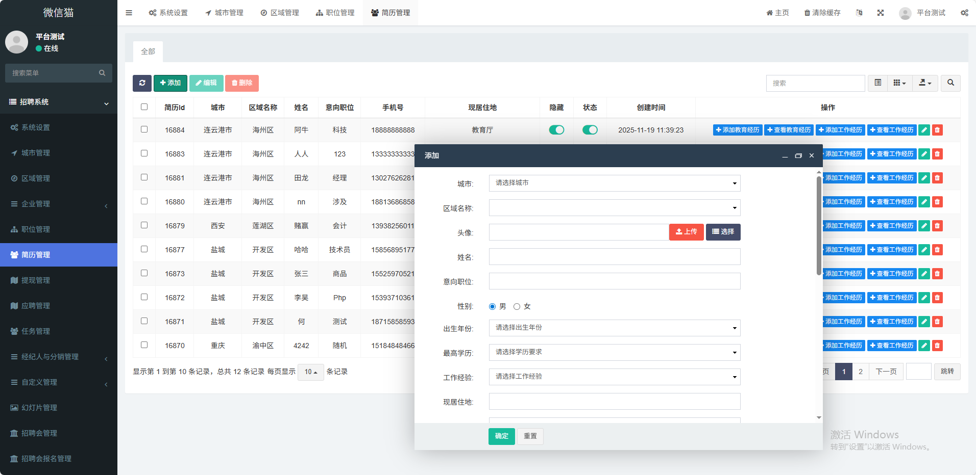 (1)多城市支持用户根据不同地区显示不同招聘信息(2)职位版块展示最新企业招聘信息(3)人才版块展示最新求职者列表信息(4)招聘会支持企业在线报名参加招聘会(5)职场资讯展示平台公告、行业信息等(6)企业登录在手机端可操作企业信息编辑、发布职位、查收简历、通知面试(7)企业VIP套餐支持企业在线购买套餐 如月卡、季卡、年(8)会员中心在手机端 投送简历、收藏职位、填写简历、刷新简历等功能(9)职位海报支持职位详情生成海报功能(10)附近职位支持根据用户定位功能展示附近职位(11)经纪人入驻支持经纪人入驻平台,向企业派送人才任务(12)分销功能支持推荐人才有佣金功能