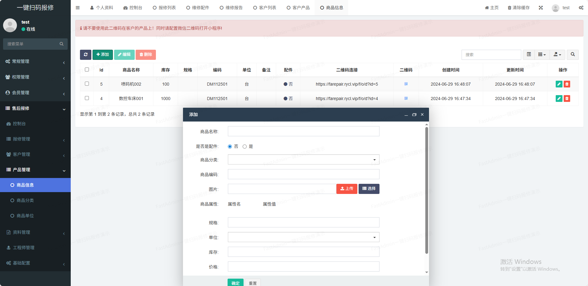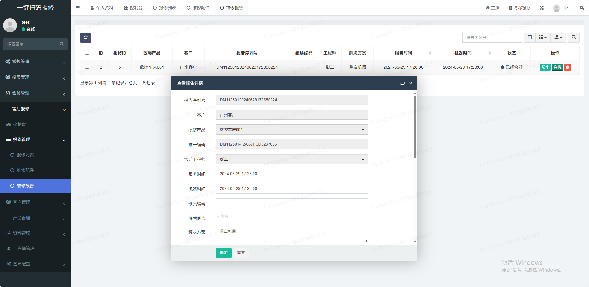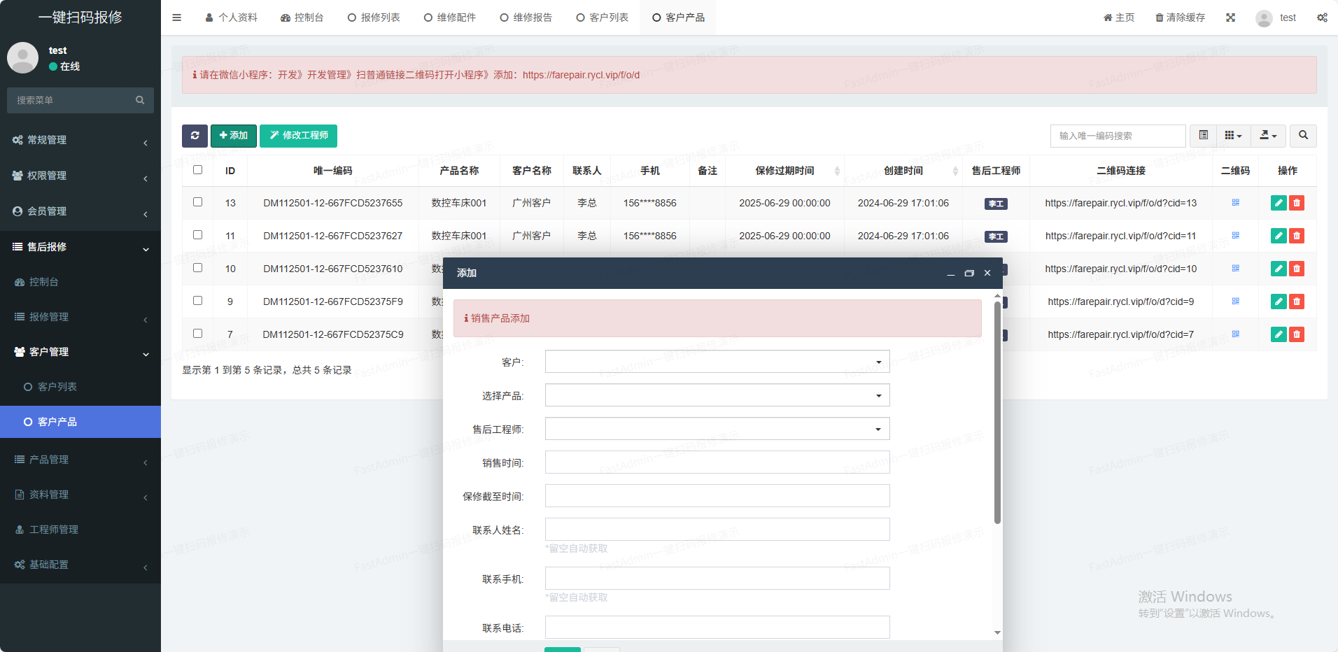 (1)产品管理支持后台添加商品分类、商品单位,录入商品信息等功能(2)客户管理客户的基本信息管理(3)工程师管理工程师负责维修并提交维修报告(4)技术资料管理支持多种技术资料格式在线浏览(如pdf,doc;xls、视频等)(5)维修管理客户报修,工程师维修并报告(6)通知管理支持故障通知和维修报告通知(7)一物一码一键批量生成产品唯一码,一个产品对应一个码