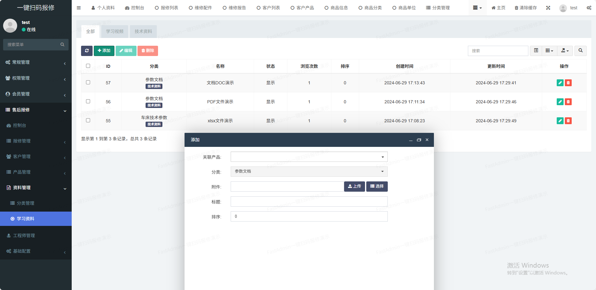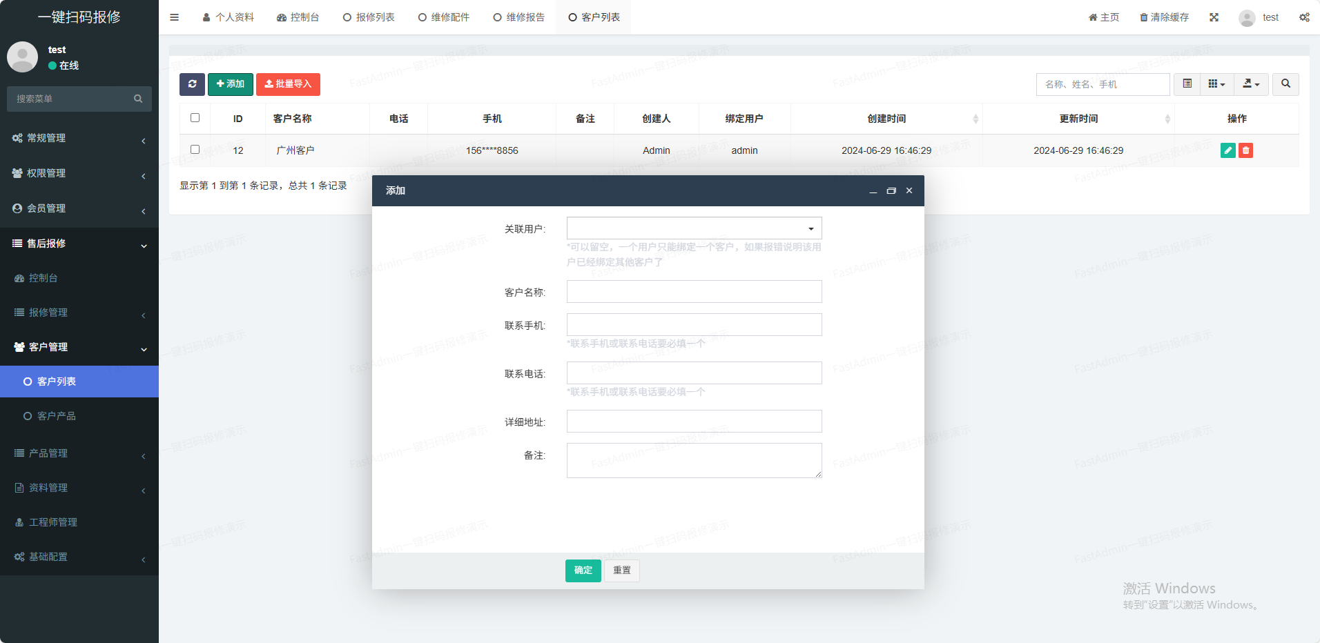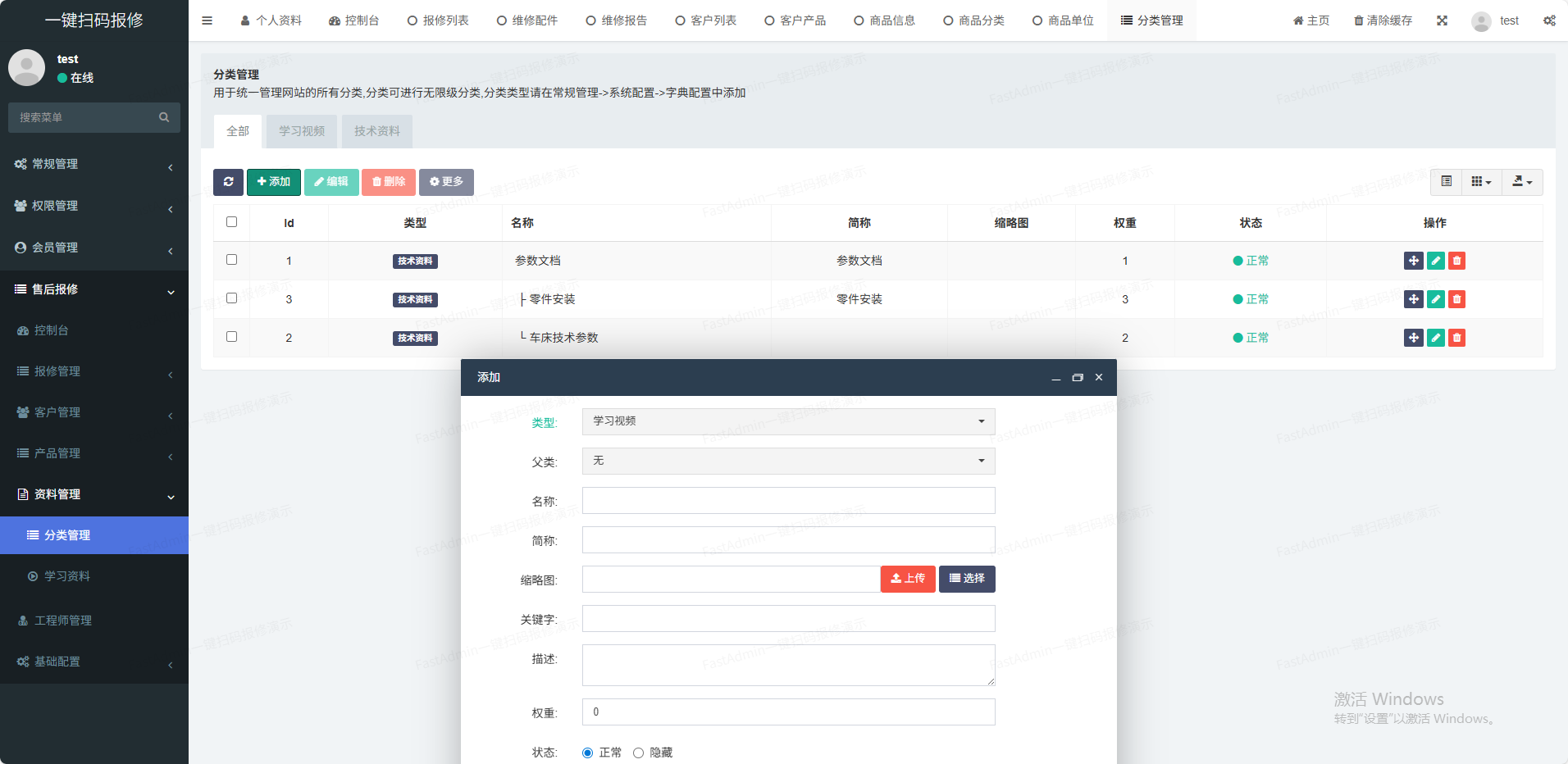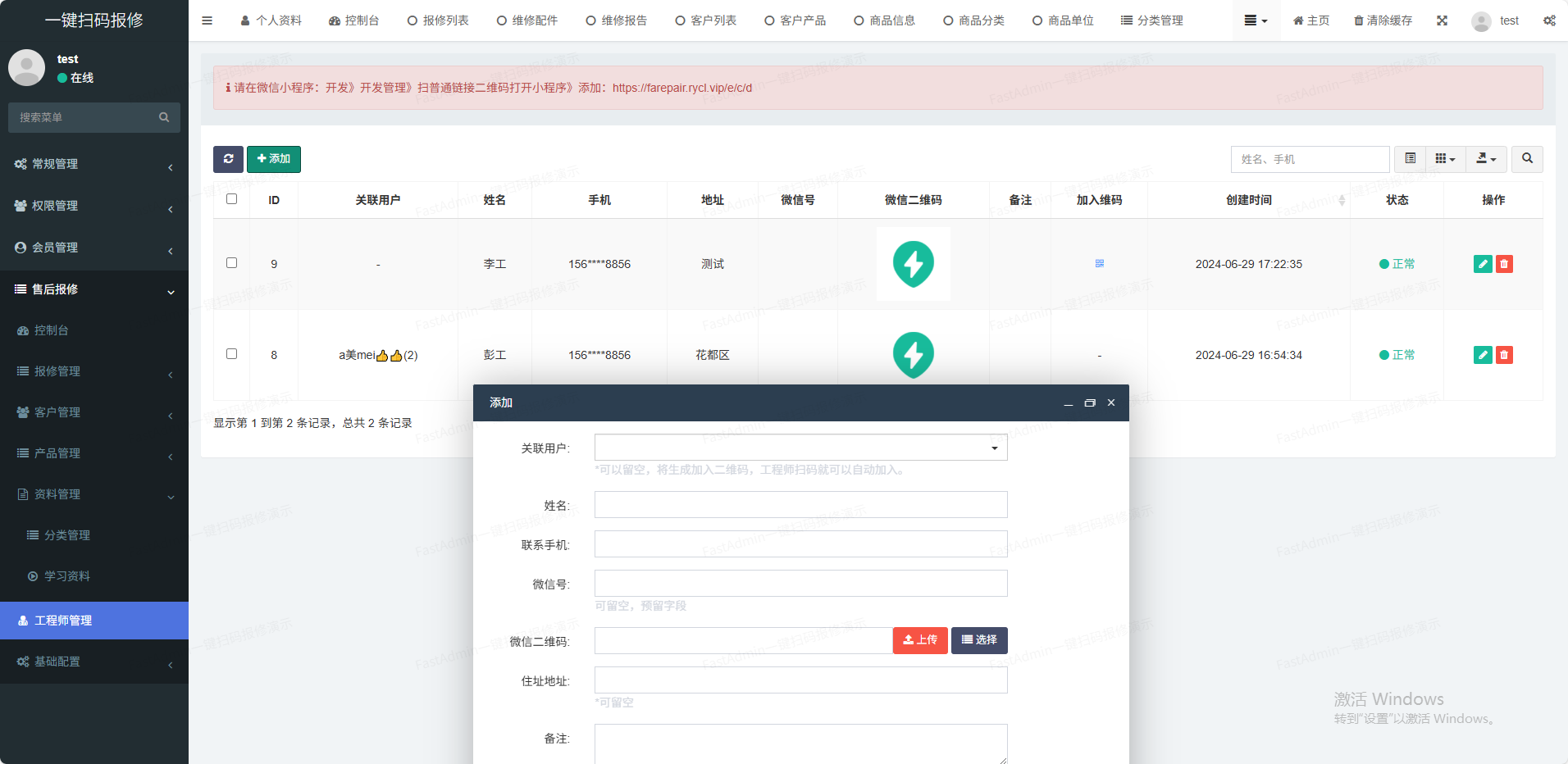 (1)产品管理支持后台添加商品分类、商品单位,录入商品信息等功能(2)客户管理客户的基本信息管理(3)工程师管理工程师负责维修并提交维修报告(4)技术资料管理支持多种技术资料格式在线浏览(如pdf,doc;xls、视频等)(5)维修管理客户报修,工程师维修并报告(6)通知管理支持故障通知和维修报告通知(7)一物一码一键批量生成产品唯一码,一个产品对应一个码