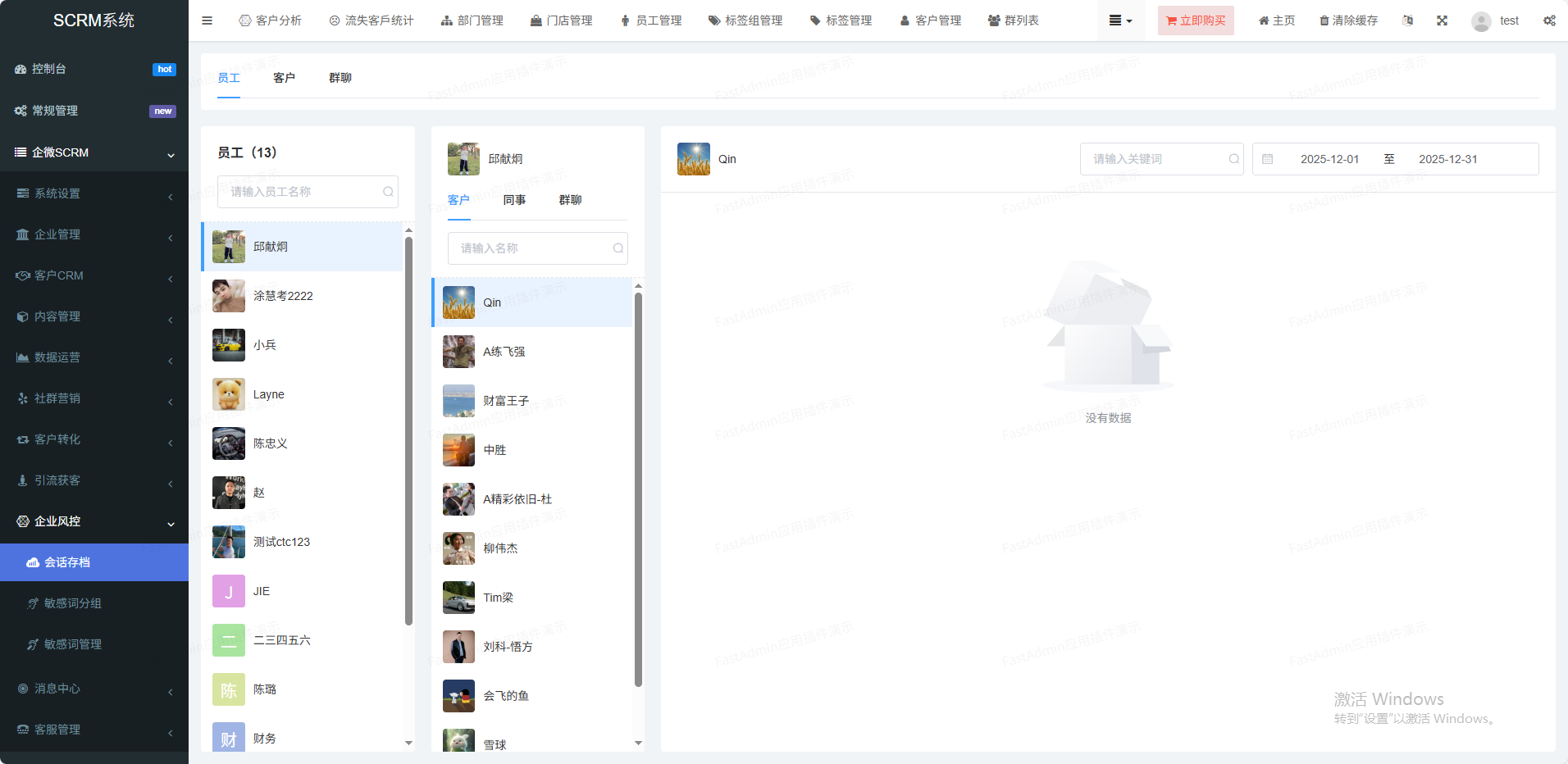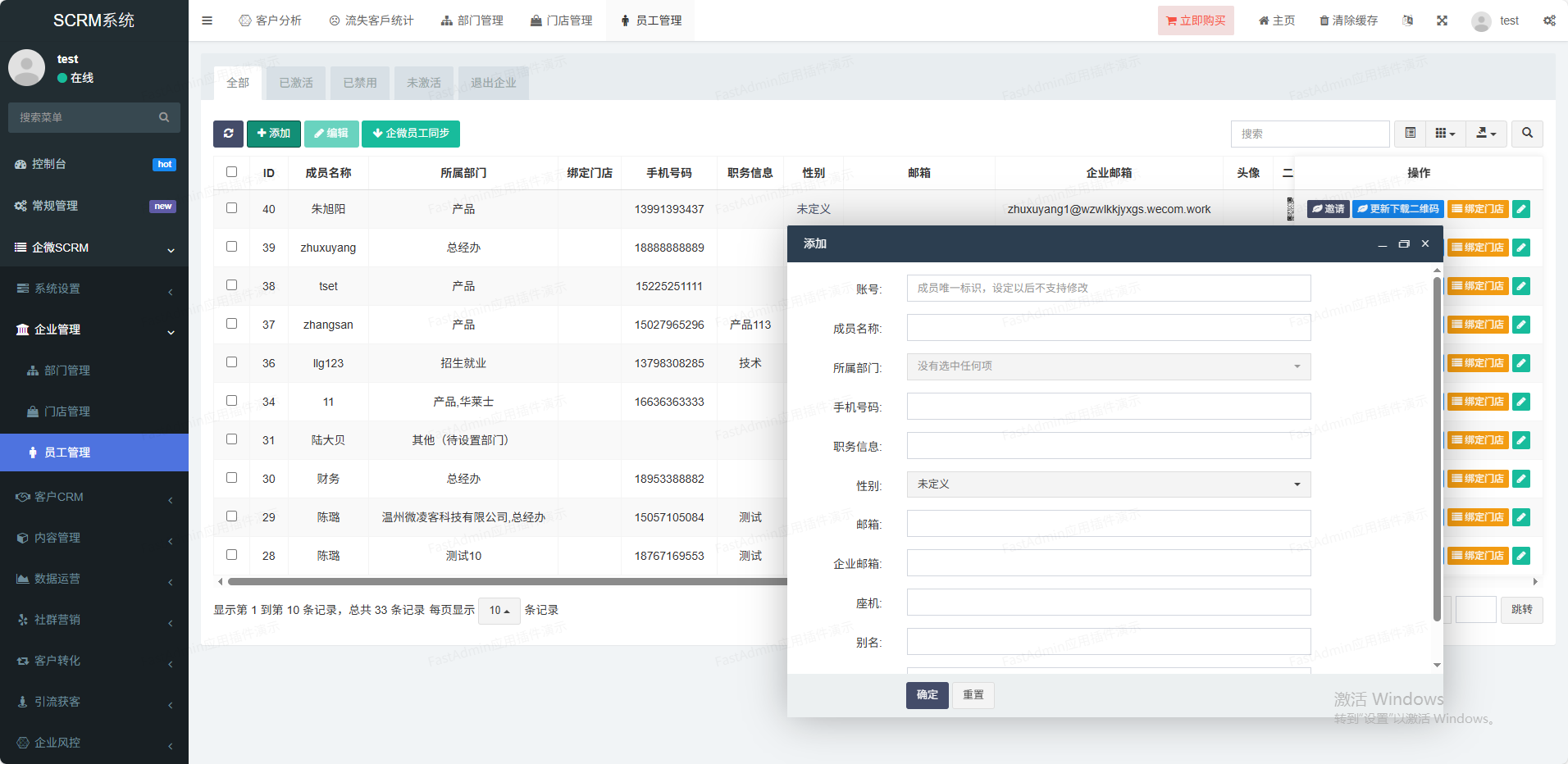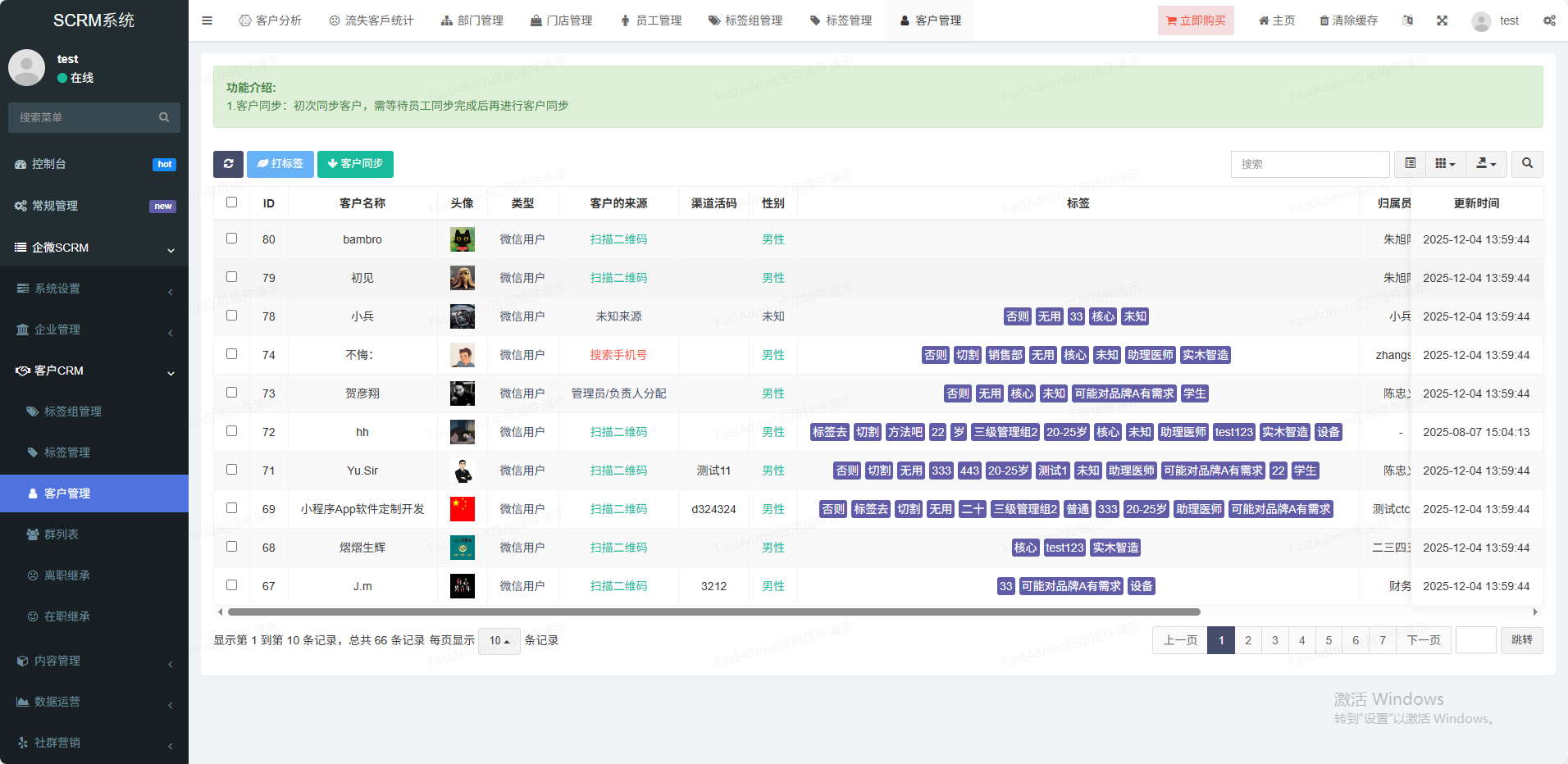 支持企微端以及插件端增删改部门、客户、员工等信息实时同步