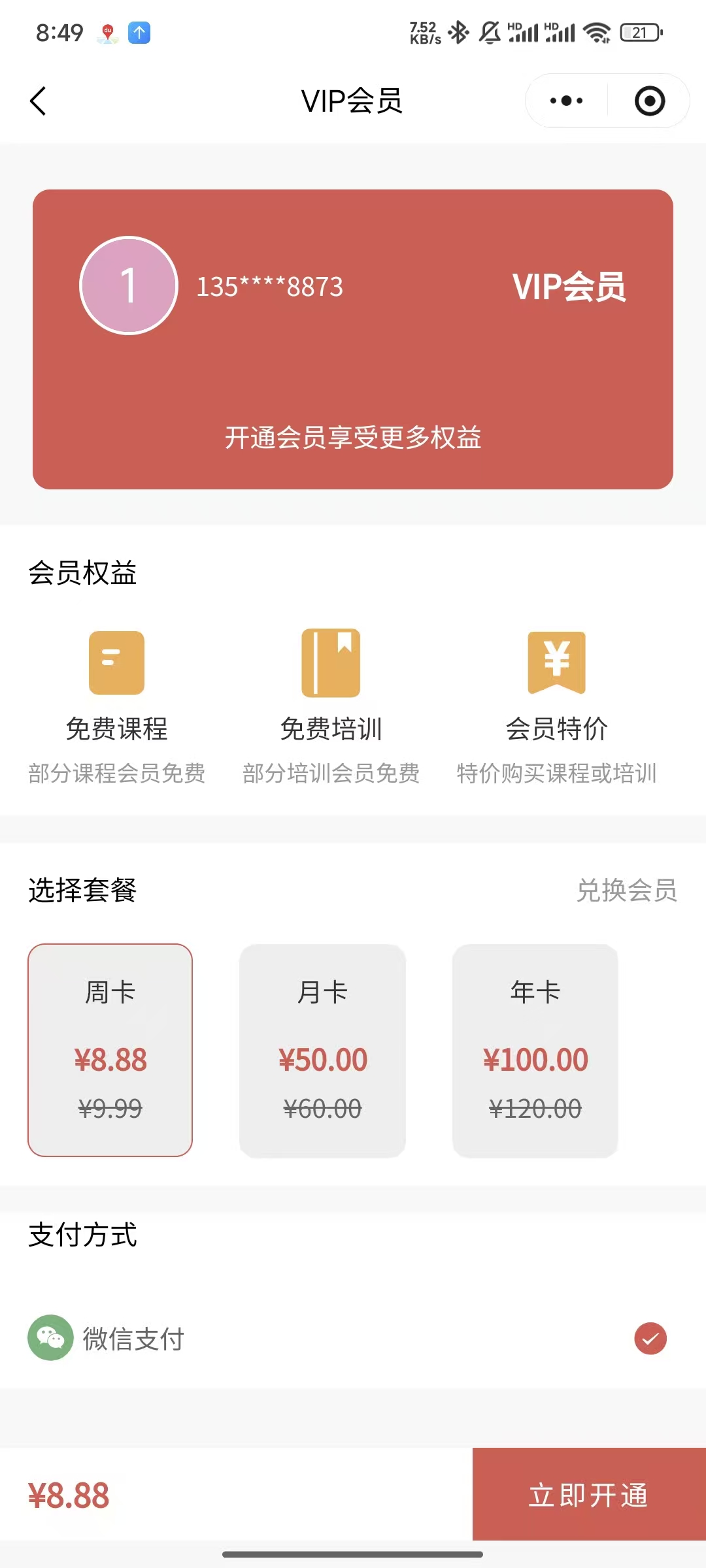 可以设定月卡、季卡、年卡,成为会员可以免费学习限定的课程或培2
