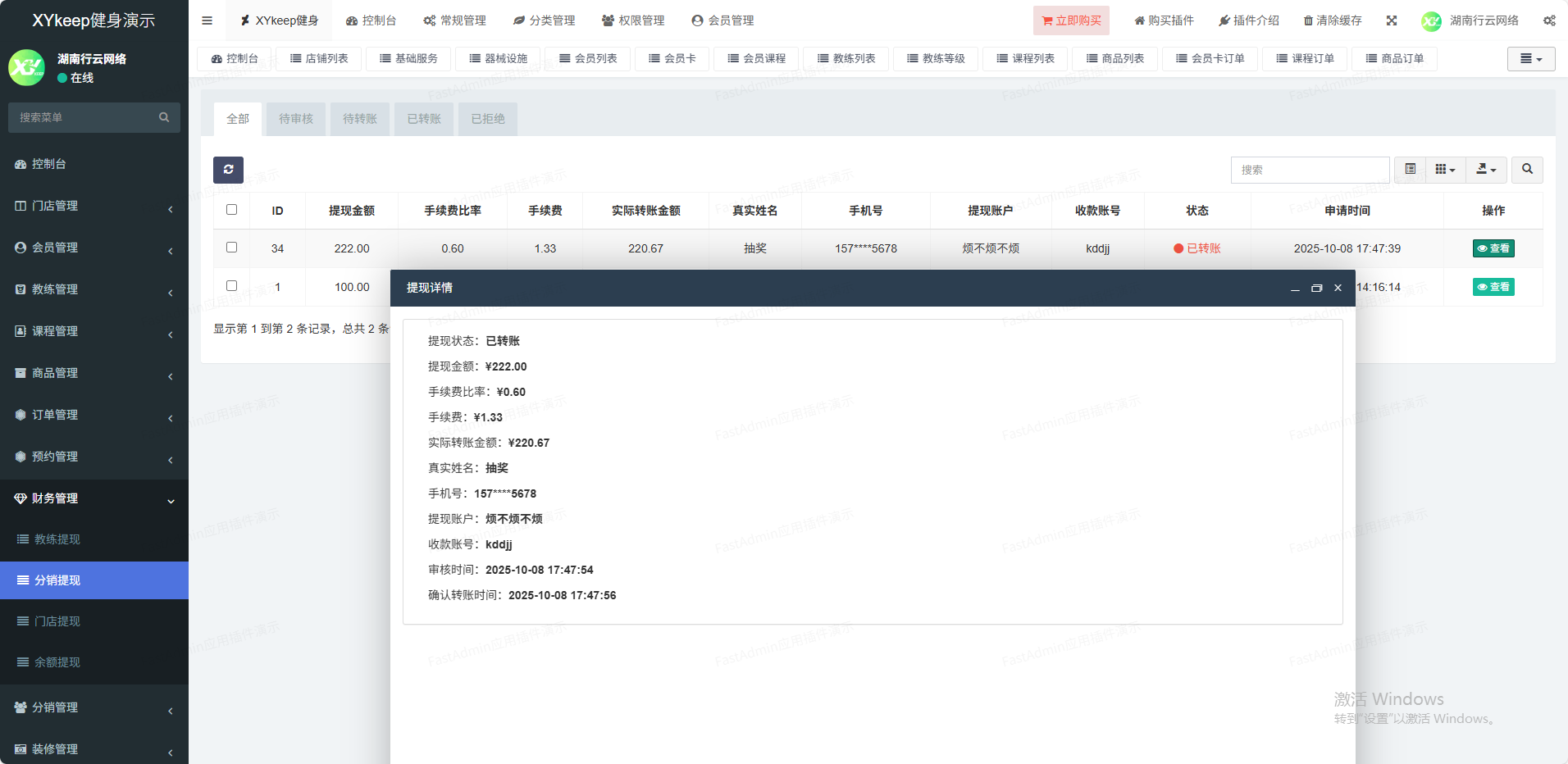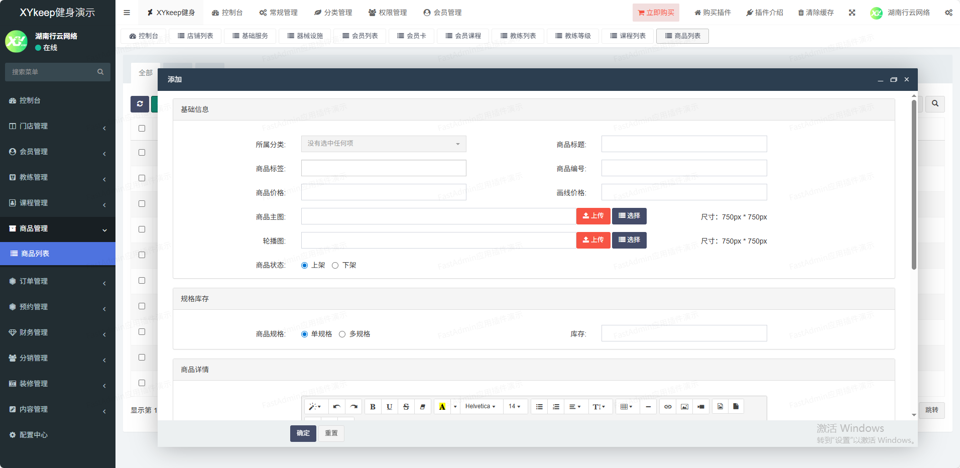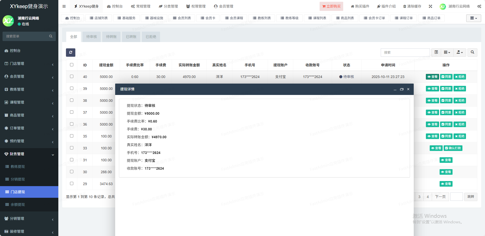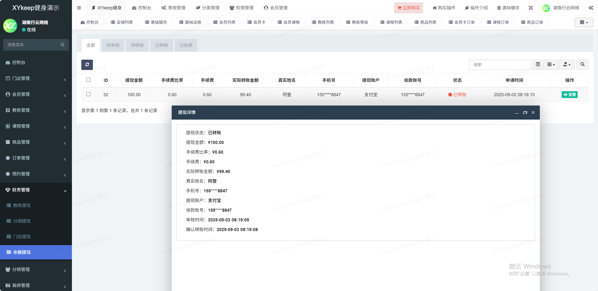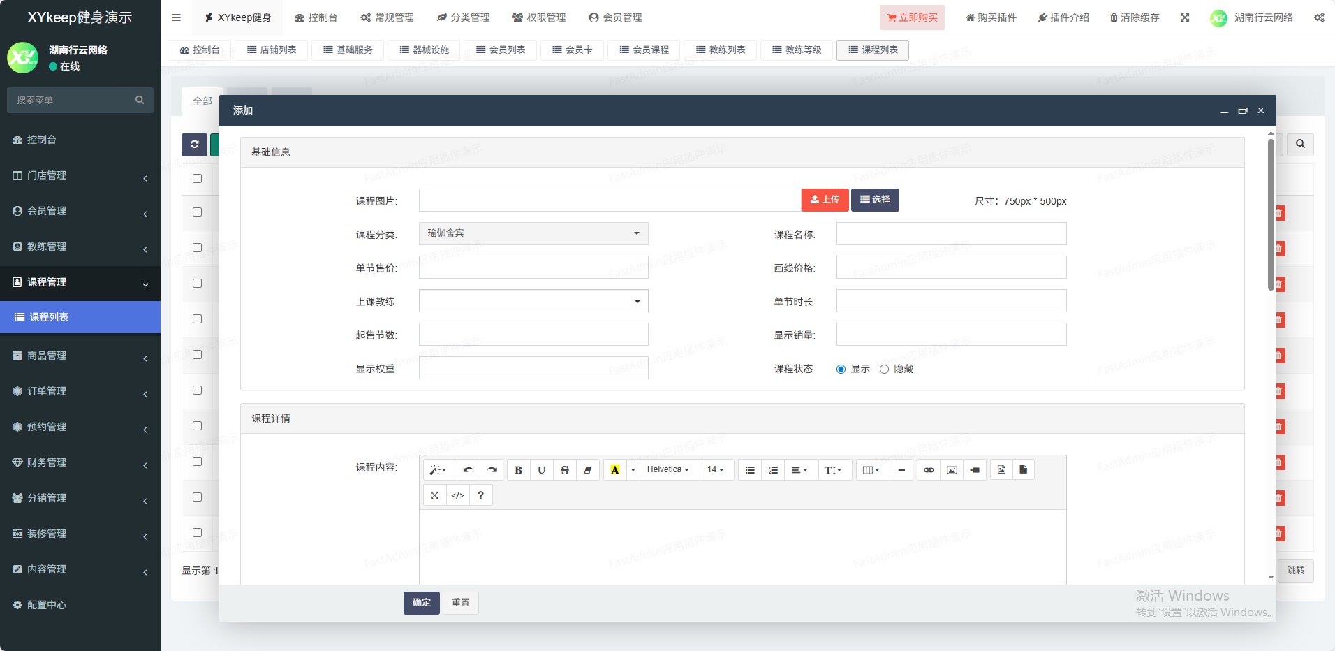 (1)装修模块可自定义小程序端首页、商城首页、用户中心排版,自定义整体色调。(2)门店模块可管理多个门店,门店均可售卖课程、办理会员卡。(3)会员卡模块用户可选择门店办理会员卡(4)教练模块教练可分等级设置课程佣金,可扫码核销预约课程。(5)课程模块可售卖私教课程,会员购买之后可预约上课。(6)商城模块可售卖健身周边产品、包含物流查询商品管理等功能。(7)订单模块包含会员卡、课程、商品订单。(8)预约模块会员可在小程序端预约门店和教练上课(9)财务模块后台可处理教练和分销商提现。(10)分销模块 二级分销、课程,会员卡,商品均可分销。