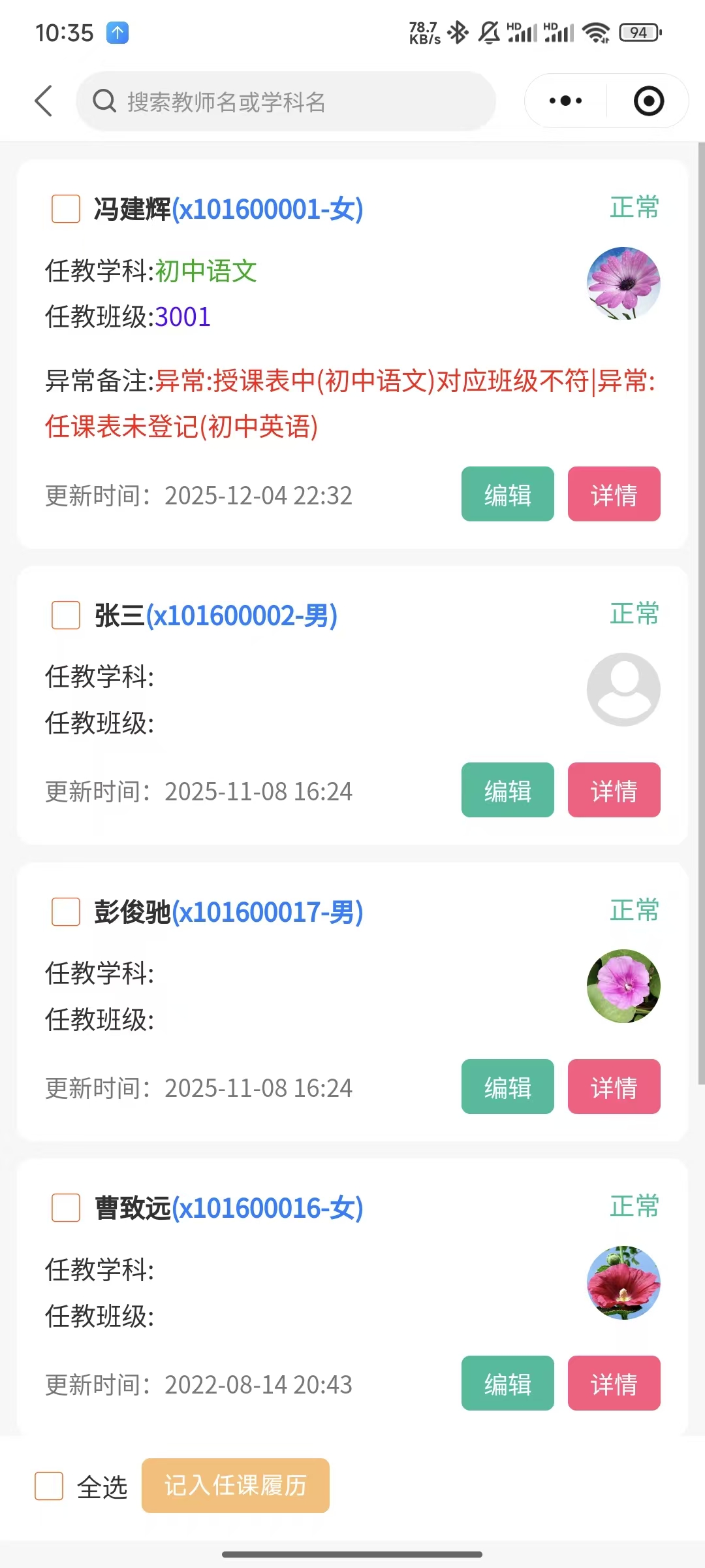 列出教师任课情况(教师可自己添加),并根据日常授课表判断是否存在异常。