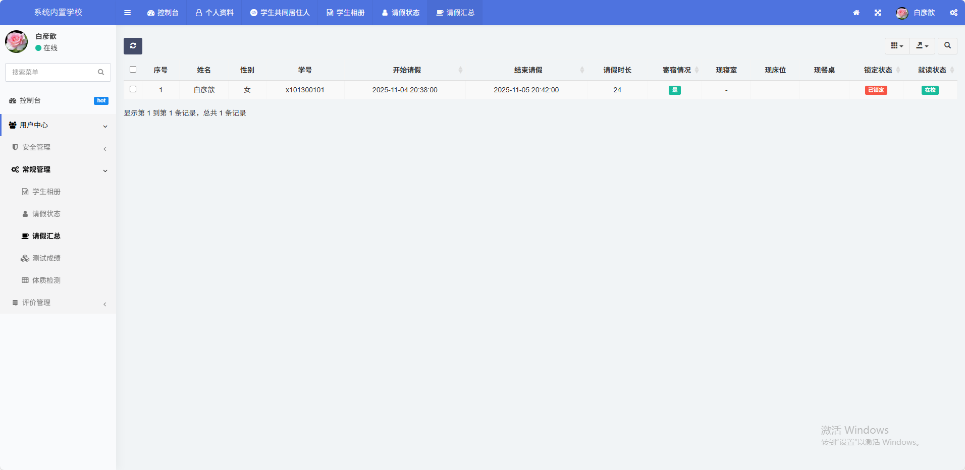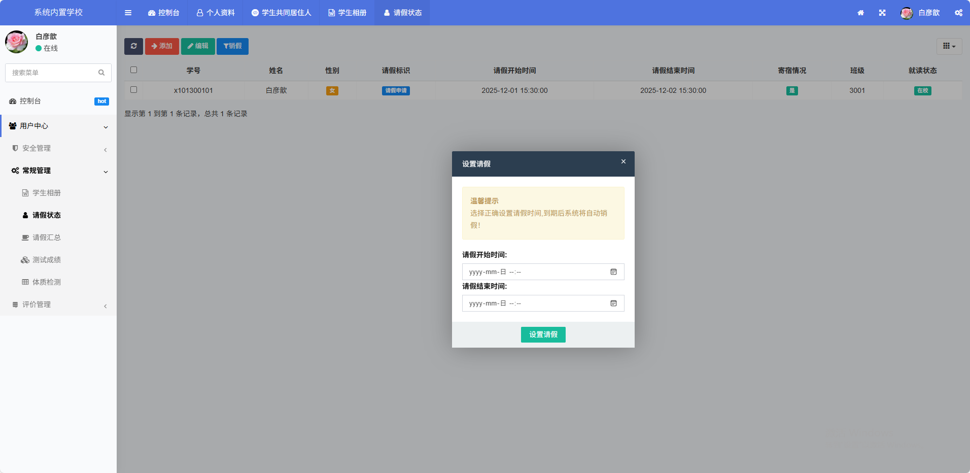 准确登记学生的请假时间,授权不同人员查看,加强请假管理,请假时间到后系统自动销假。