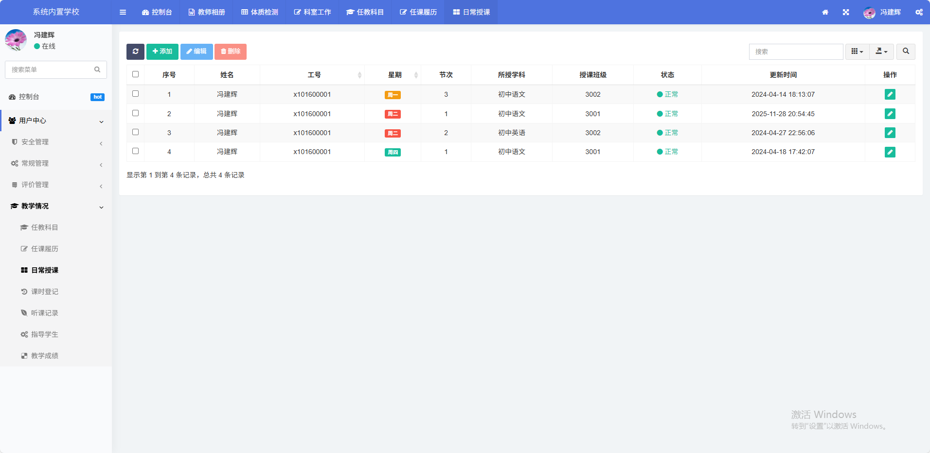 列出教师的日常授课表即教师课程表(教师可自己添加),实现日常课程的电子化管理,利于精细化管理。
