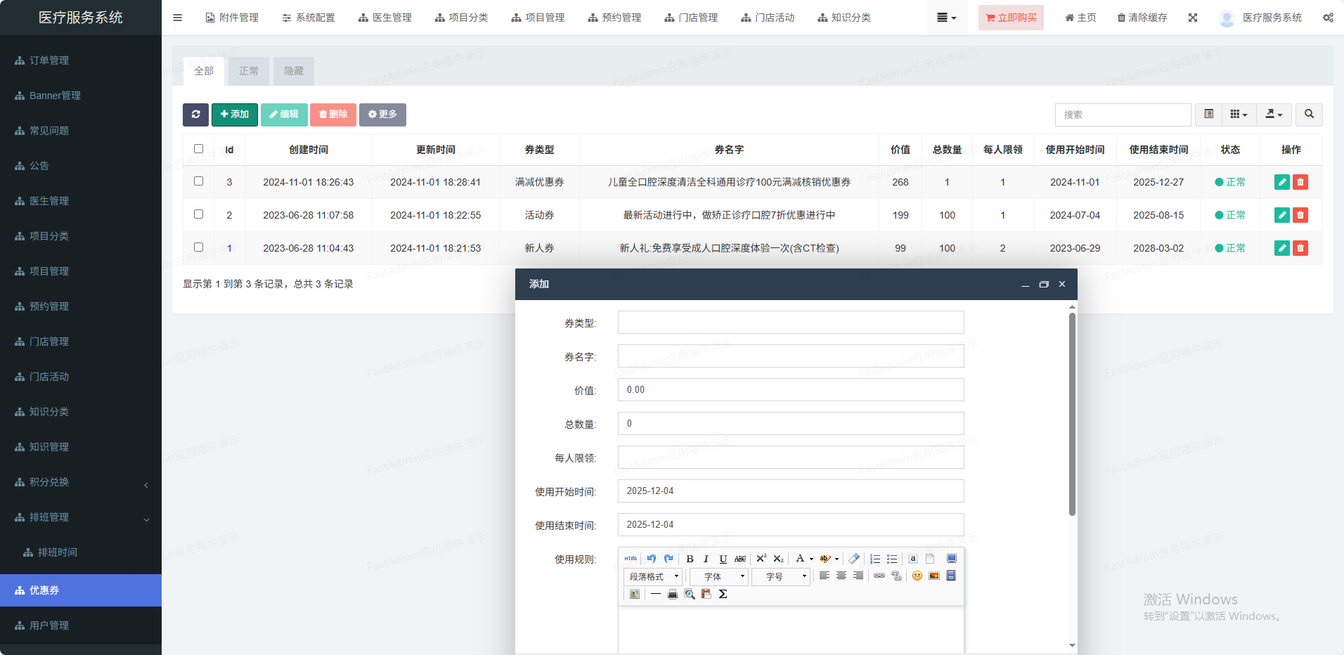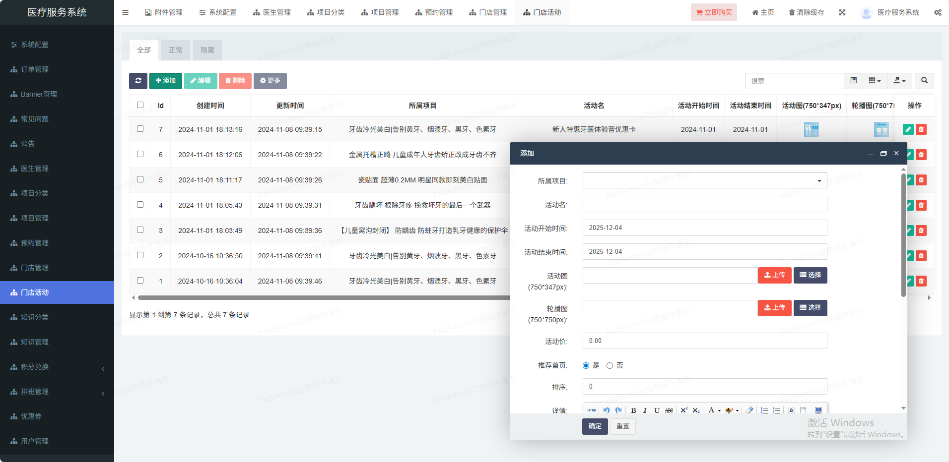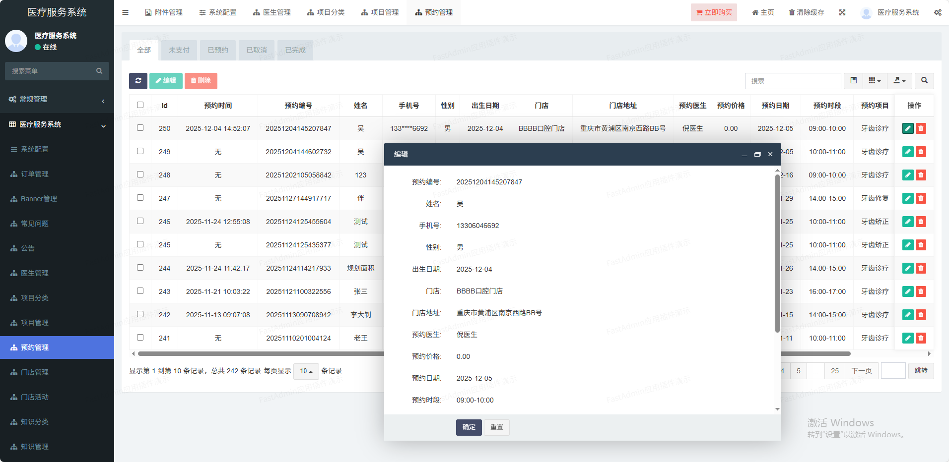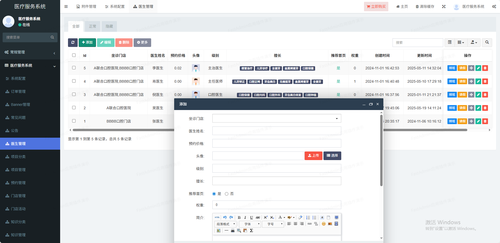 (1)门店管理可以设置多门店,也可单门店(2)核销功能管理员可以打开微信扫一扫核销码进行核销(3)系统配置设置小程序、公众号、短信等信息(4)会员管理多端会员统一,设置核销员(5)优惠券抵扣订单,单独到店核销(6)活动管理可以对某个项目设置多个活动(7)项目分类分类管理,可以推荐到首页(8)项目管理价格设置、店铺设置、坐诊医生等(9)医生管理姓名、头像、擅长领域、级别等(10)手机登录支持一键登录,:手机短信登录(11)排班功能排班自定义,多时段定义、请假功能(12)预约功能预约某家门店某个医生(13)分销功能支持分销赠送积分功能,积分可兑换礼品