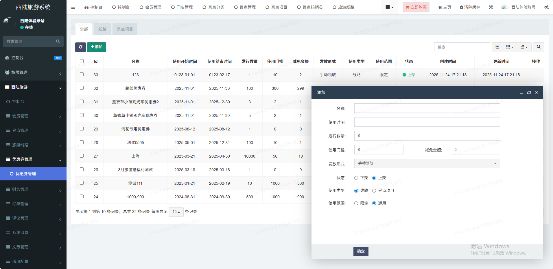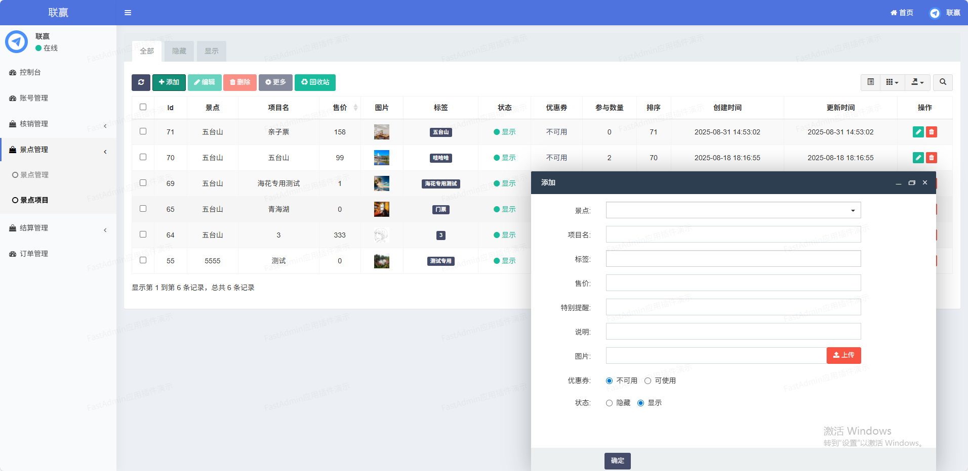 (1)机构入驻机构申请入驻,平台审核(2)旅游线路旅游机构发布全国线路,线路可以设置多个出行日期(3)景点项目景点机构发布景点项目,比如门票、项目票,支持在线购票(4)价格体系同个线路支持不同日期不同价格,支持儿童价(5)在线支付支持微信在线支付(6)退款价格支持3个时间段退款扣费标准(7)扫码核销每个景点订单都有独立的核销码(8)旅游攻略平台可以发布旅游攻略(9)机构结算机构在线申请提现,支付宝或银行卡线下转账(10)优惠券平台发放优惠券,支持指定机构使用。(11)二级分销二级分销,专属海报,佣金提现(12)佣金提现用户在线申请提现,支付宝或银行卡线下转账