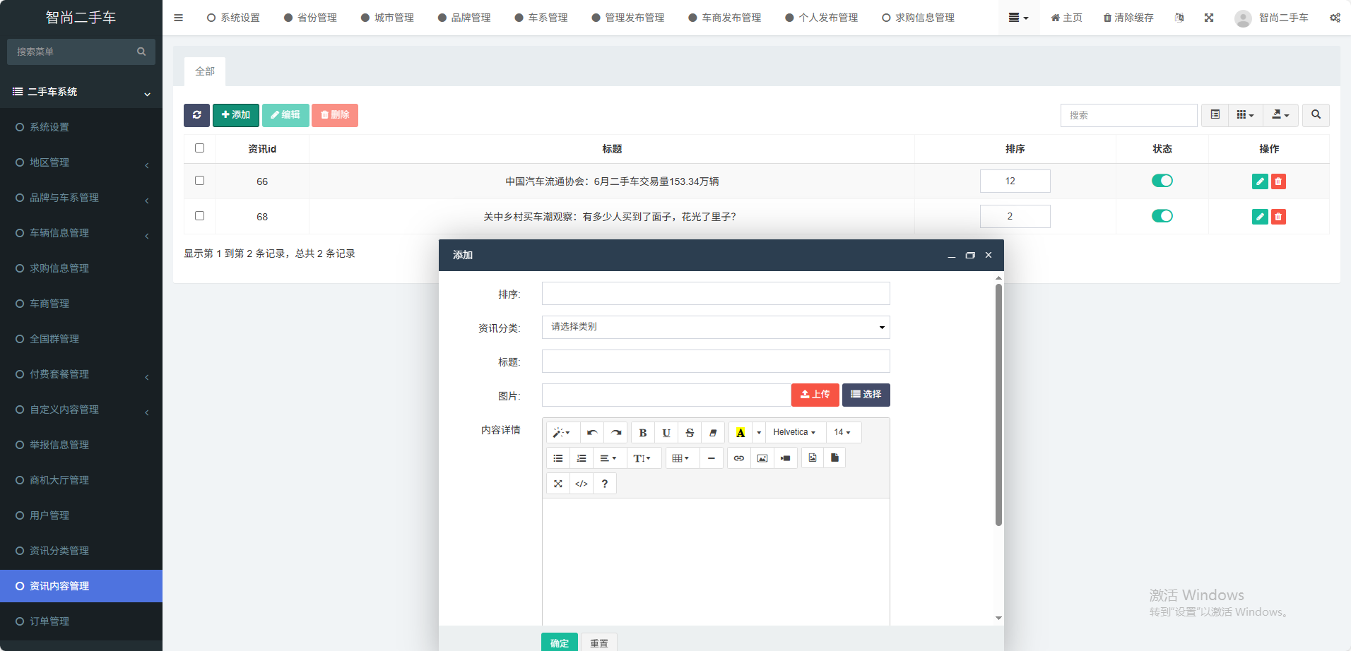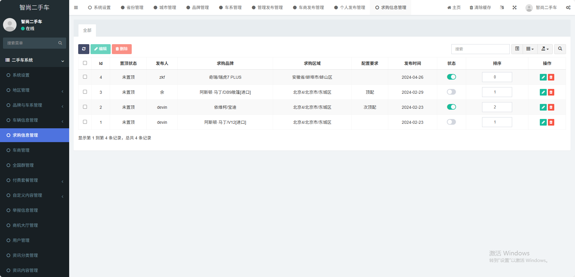支持用户一键发布二手车,平台审核上线,发布可编辑、删除等操作