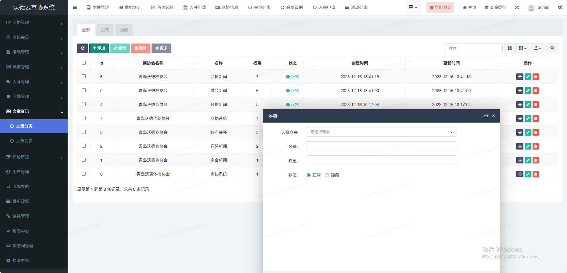 商会、协会自动生成小程序端,独立后台管理,栏目涵盖有:简介、新闻动态、会员风采、会员服务等。