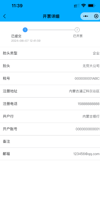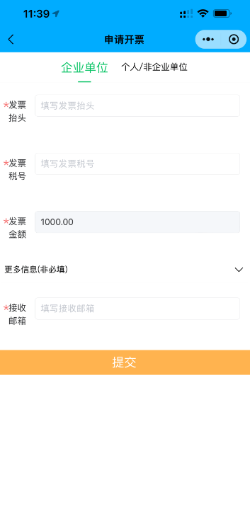 用户可在小程序直接申请开票,后台开票完成后将发送到用户预留的邮箱。