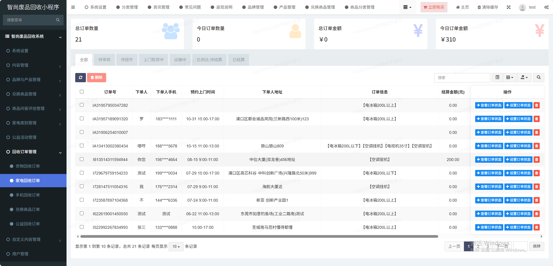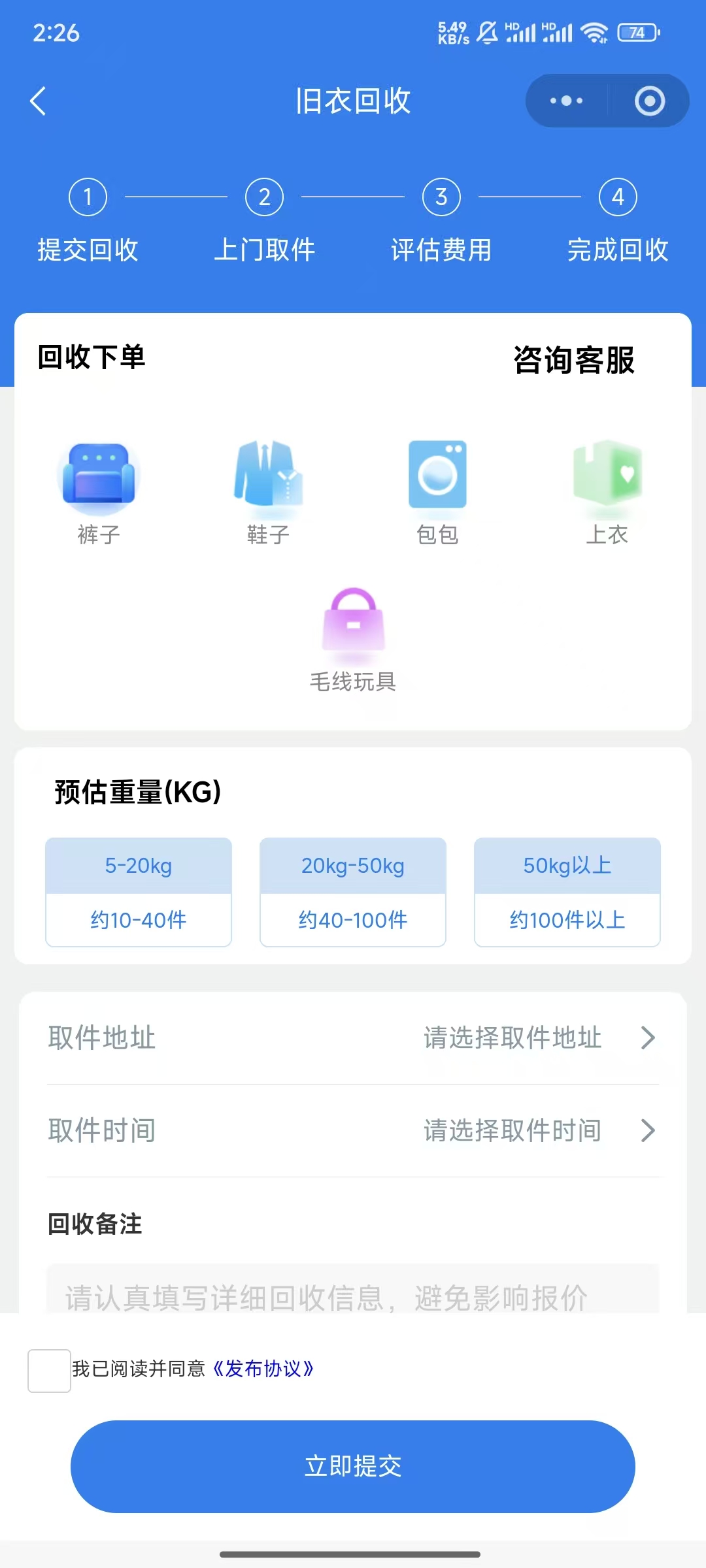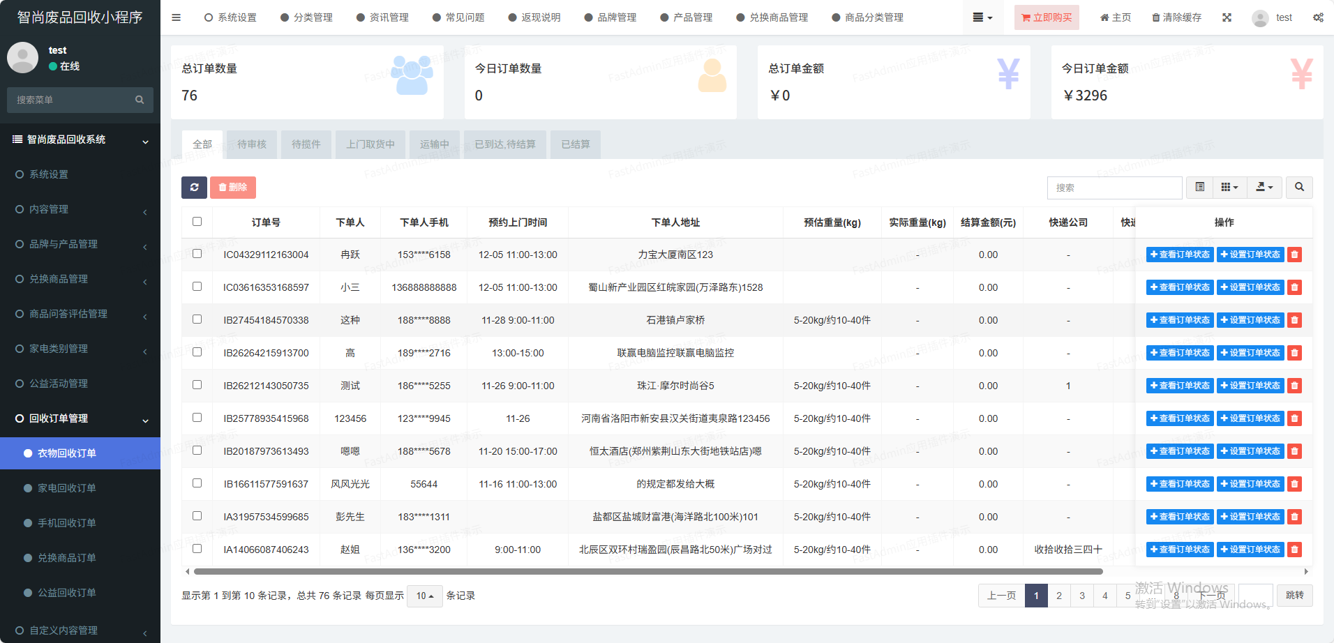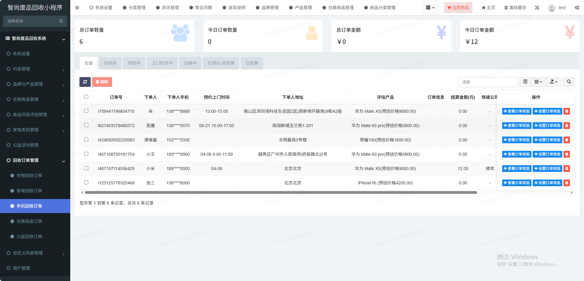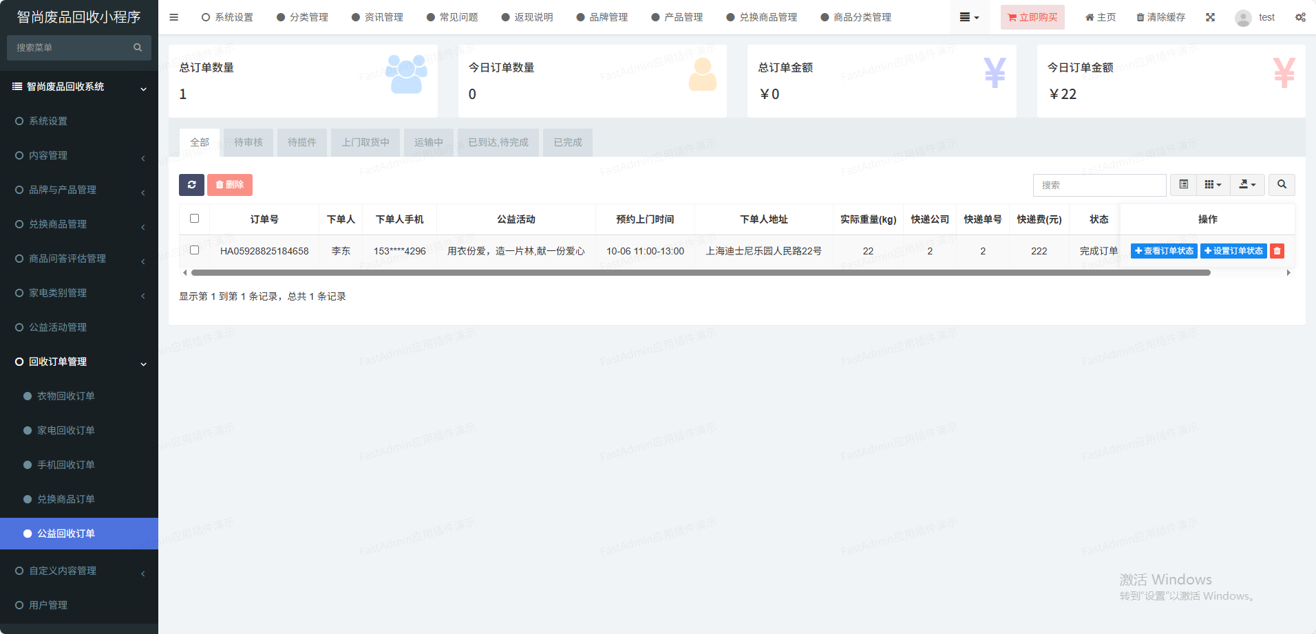 (1)旧衣物回收支持线上按旧衣重量预约评估(2)家电回收支持自定义家电类型预约评估(3)书籍回收支持线上按书籍重量预约评估(4)手机评估回收支持在线评估手机后预约上门取件(5)公益活动回收支持发起公益活动捐赠旧物(6)旧物兑换支持旧物线上兑换商品(7)后端订单支持后端订单审核、预约快递、收货评估、结算价格等功能(8)常见问题展示平台使用说明及注意事项