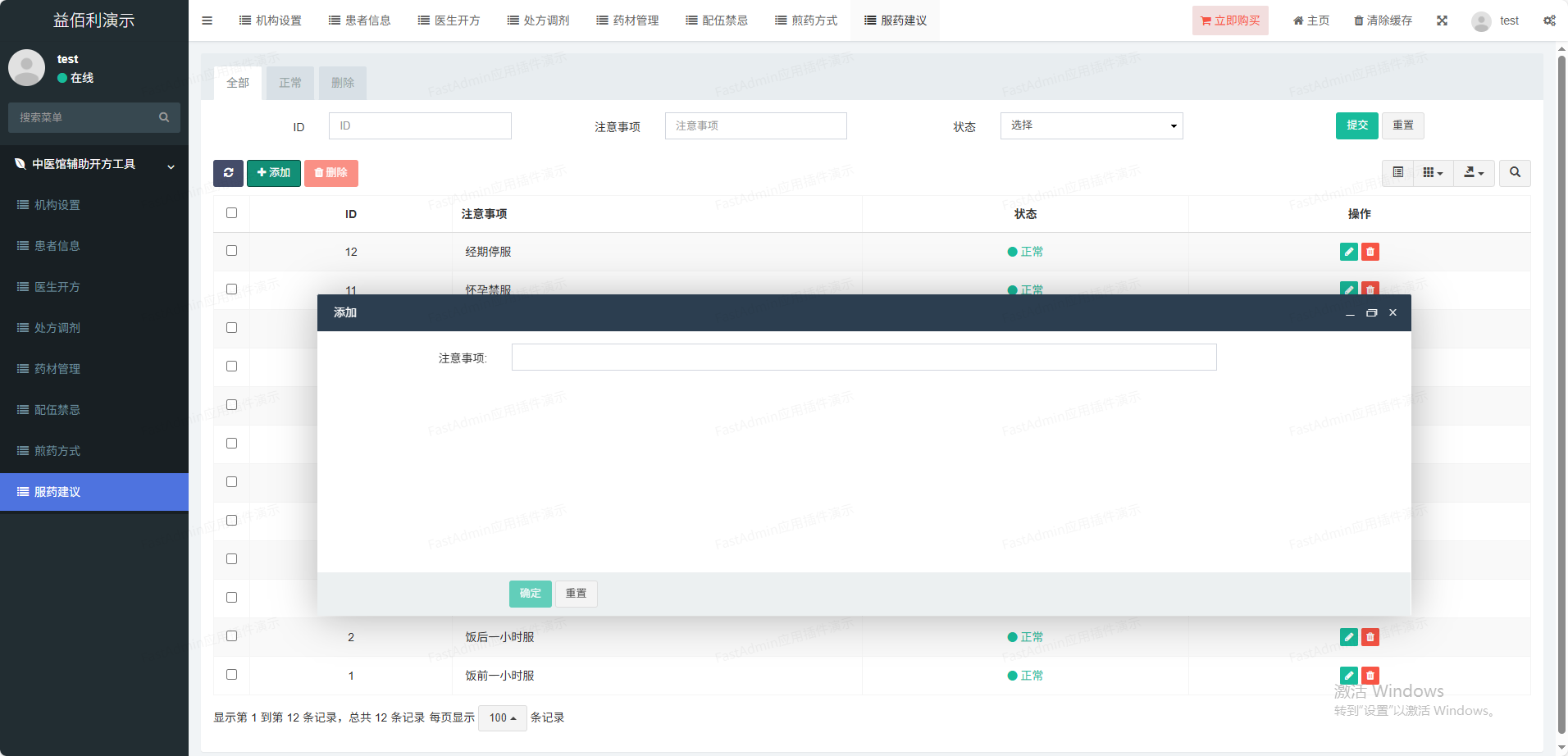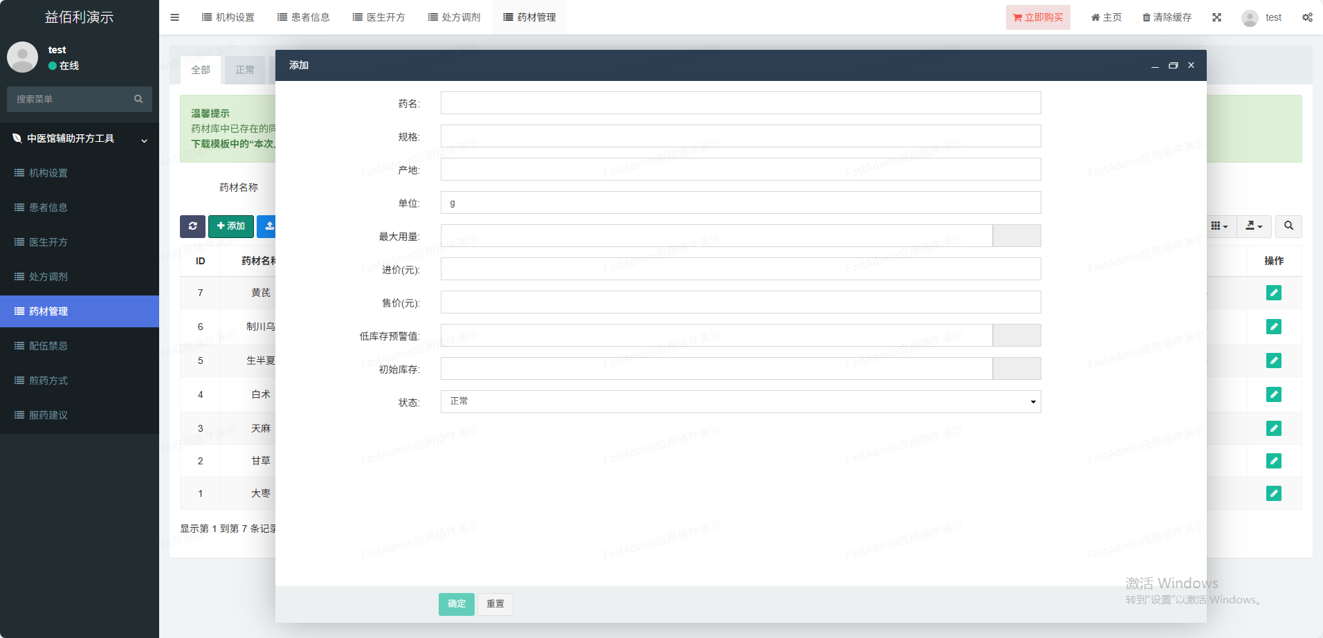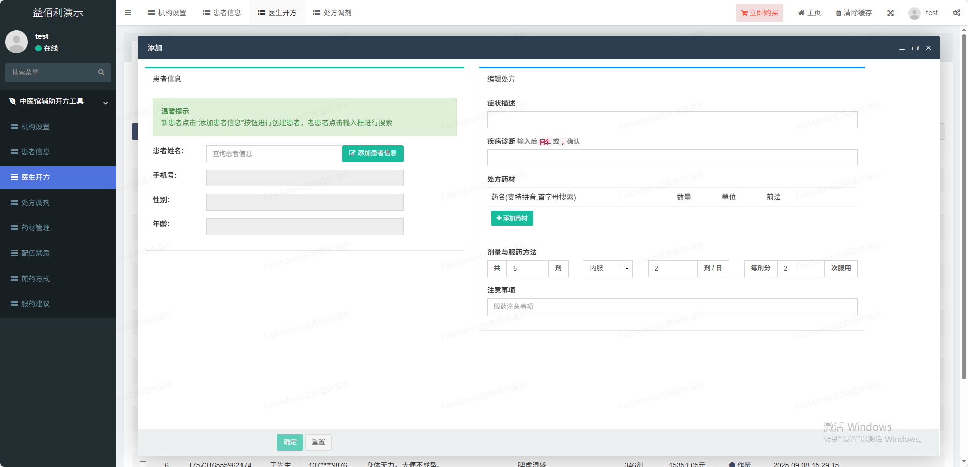 可通过汉字,拼音,简拼等方式录入处方药材。根据药材库存情况显示可开药材。通过预录入的服药建议,配伍禁忌,煎药方式辅助医生完善处方,并对超量药,禁忌药提供提示。根据药材绘制处方模板以供打印。