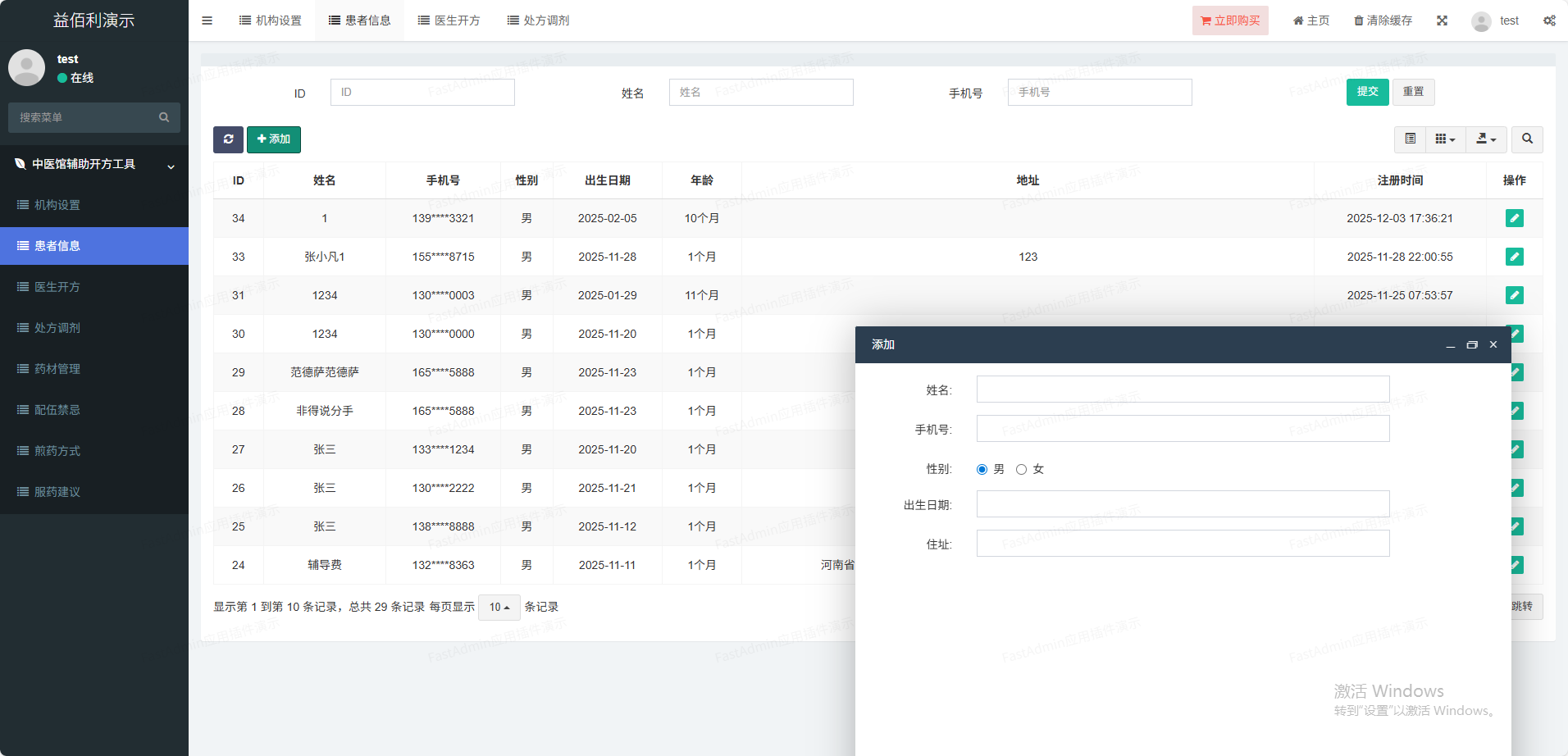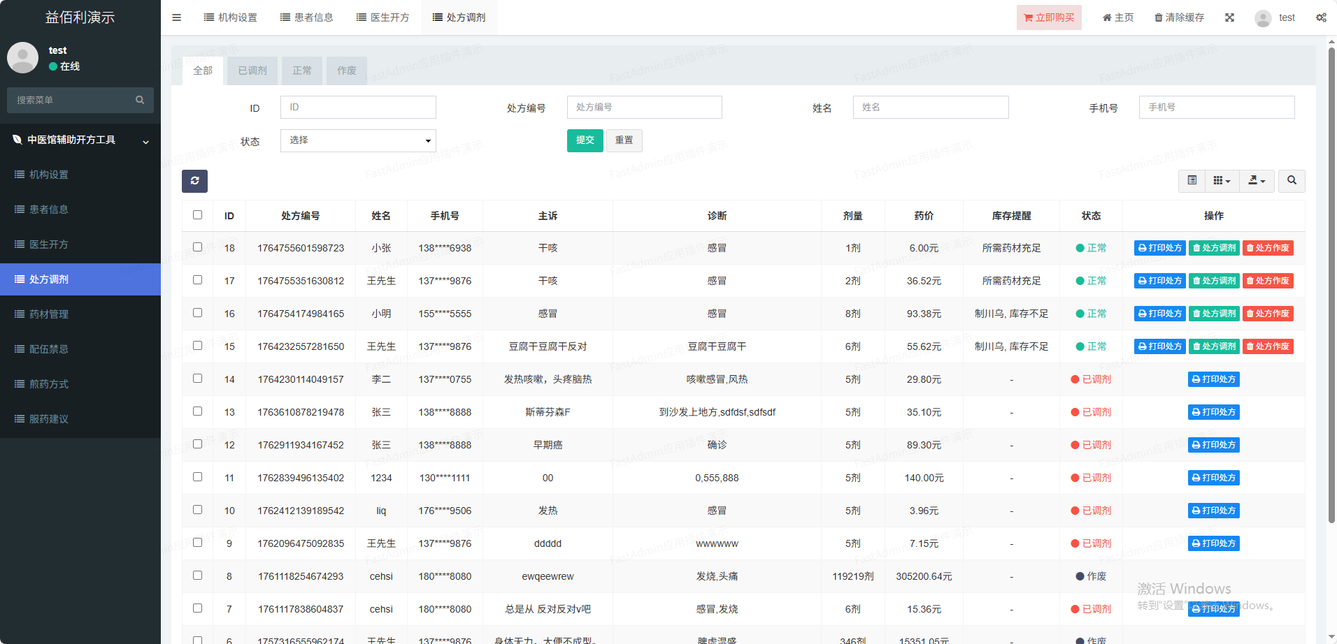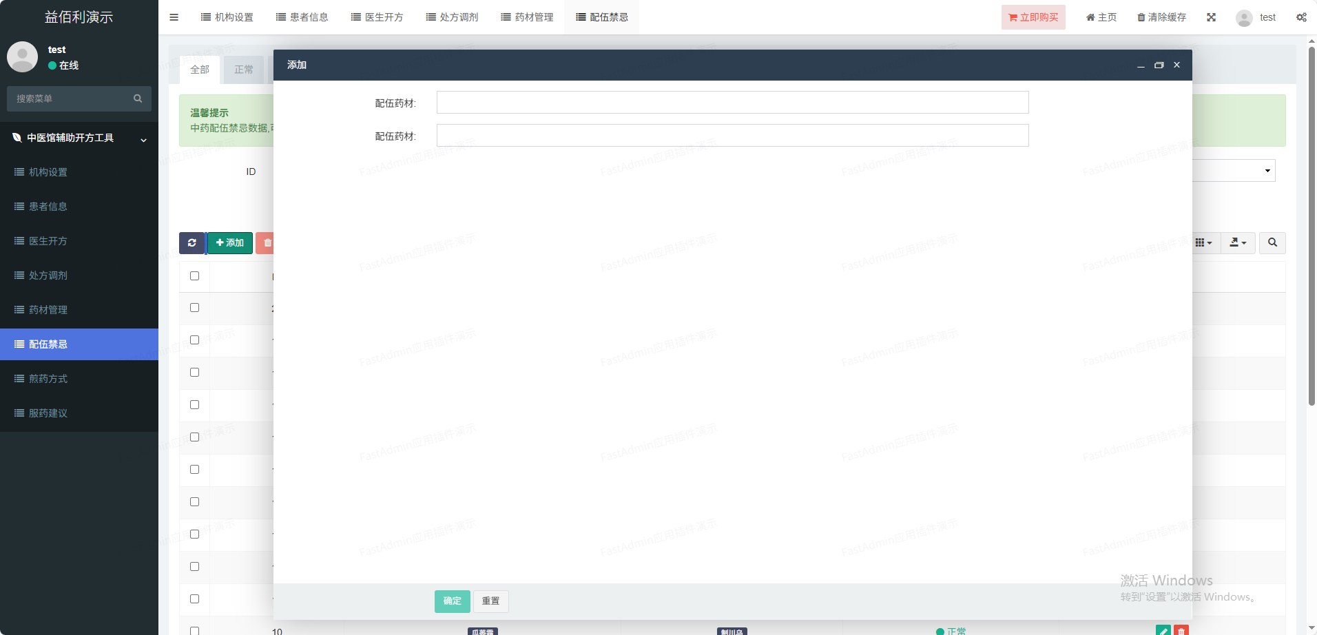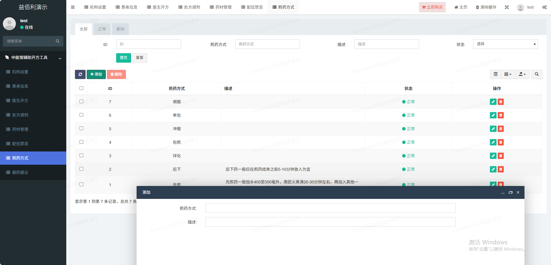 可通过汉字,拼音,简拼等方式录入处方药材。根据药材库存情况显示可开药材。通过预录入的服药建议,配伍禁忌,煎药方式辅助医生完善处方,并对超量药,禁忌药提供提示。根据药材绘制处方模板以供打印。