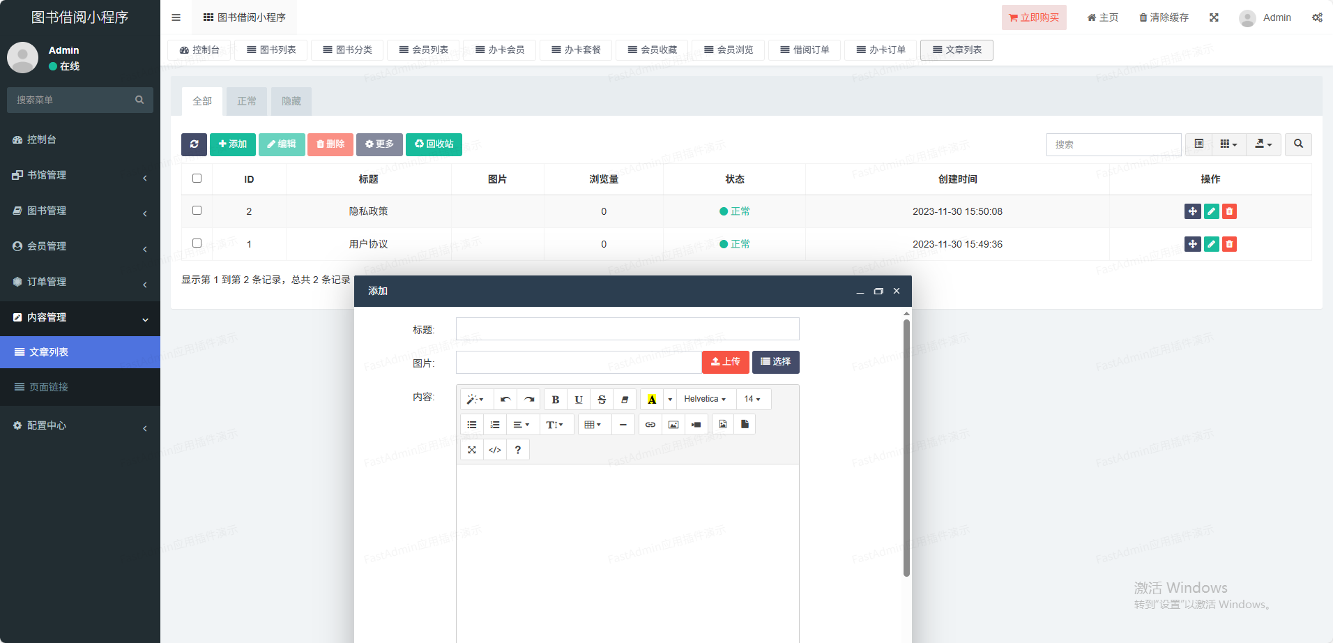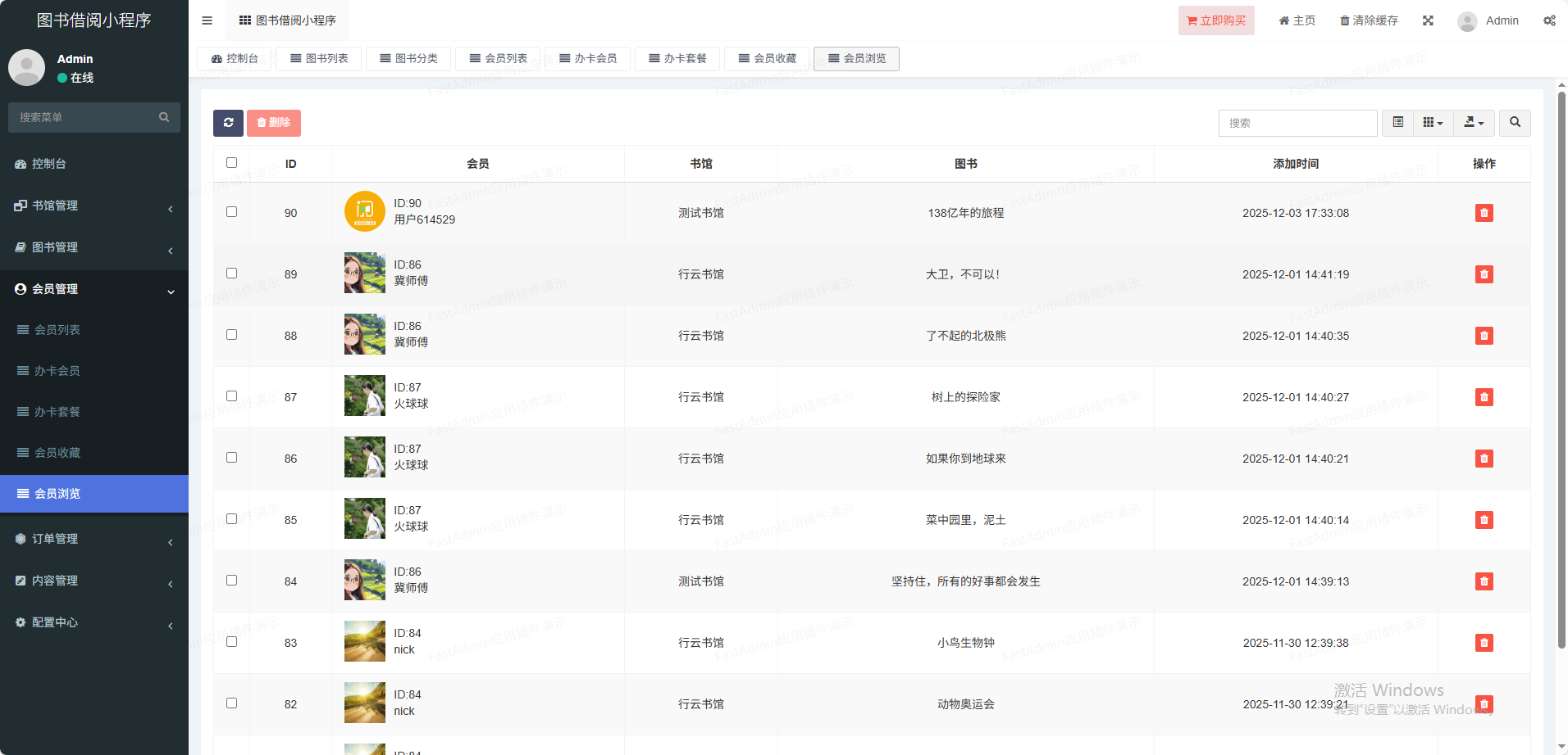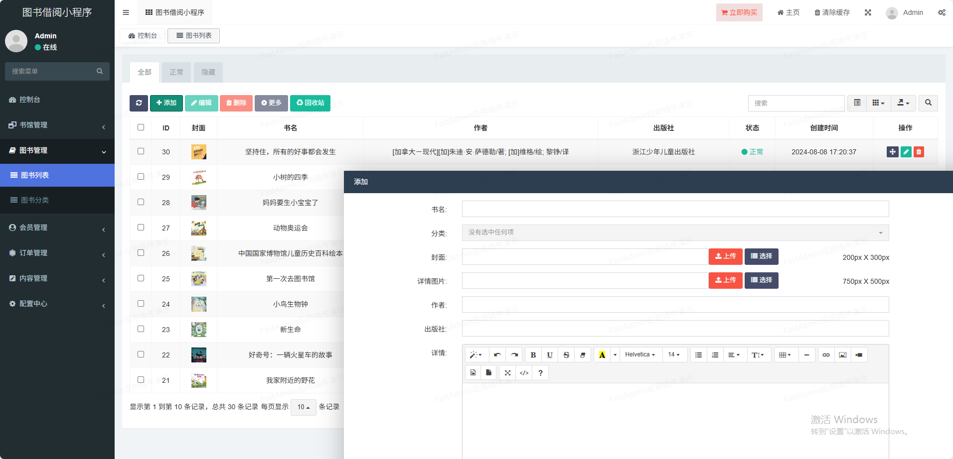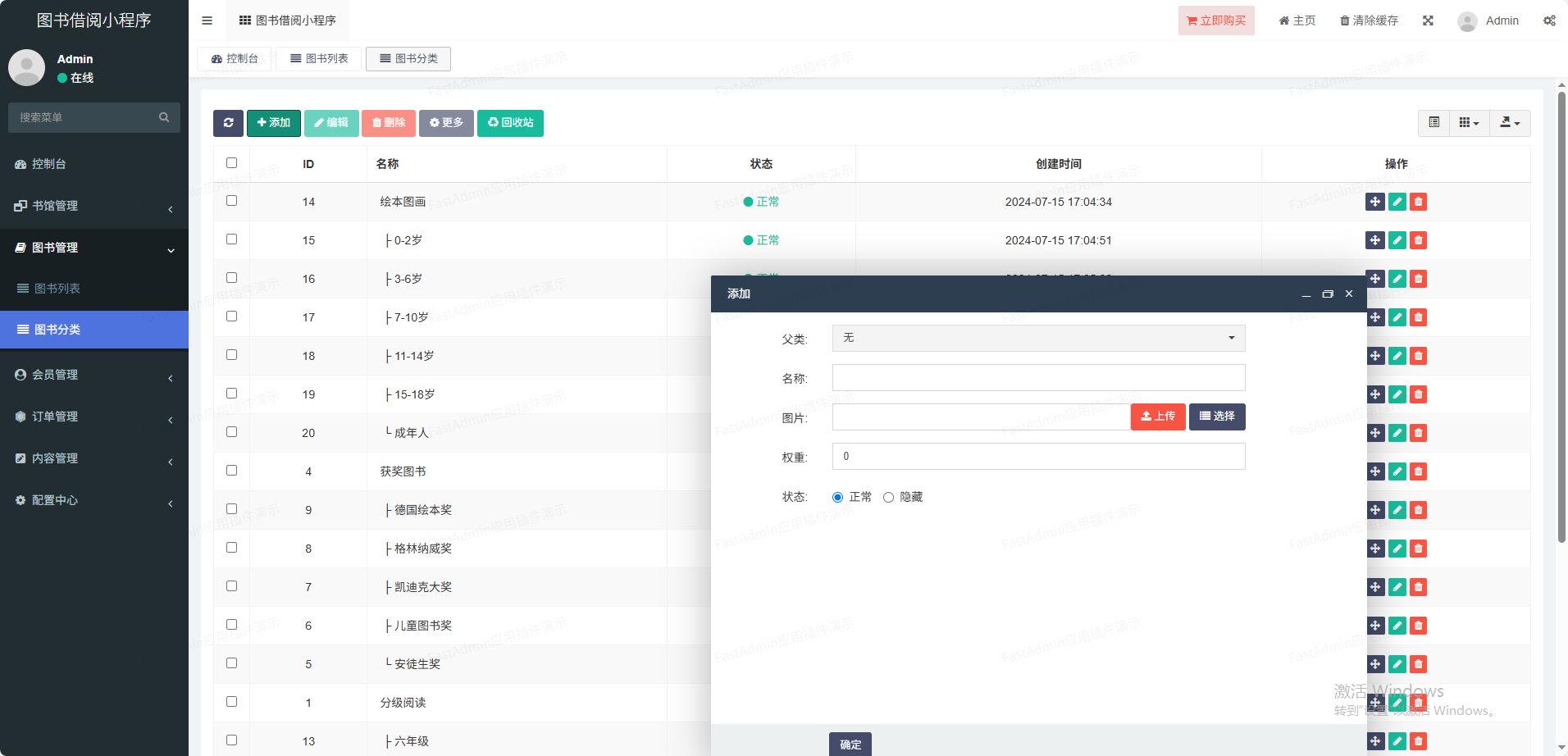 书馆管理模块包含书馆列表、书馆公告、书馆员工、基础服务