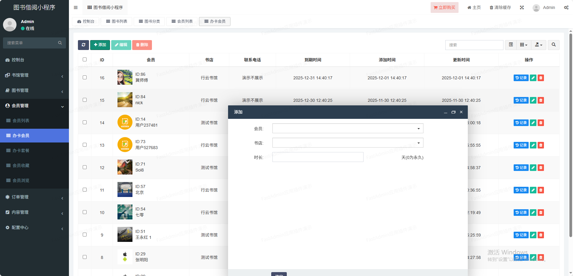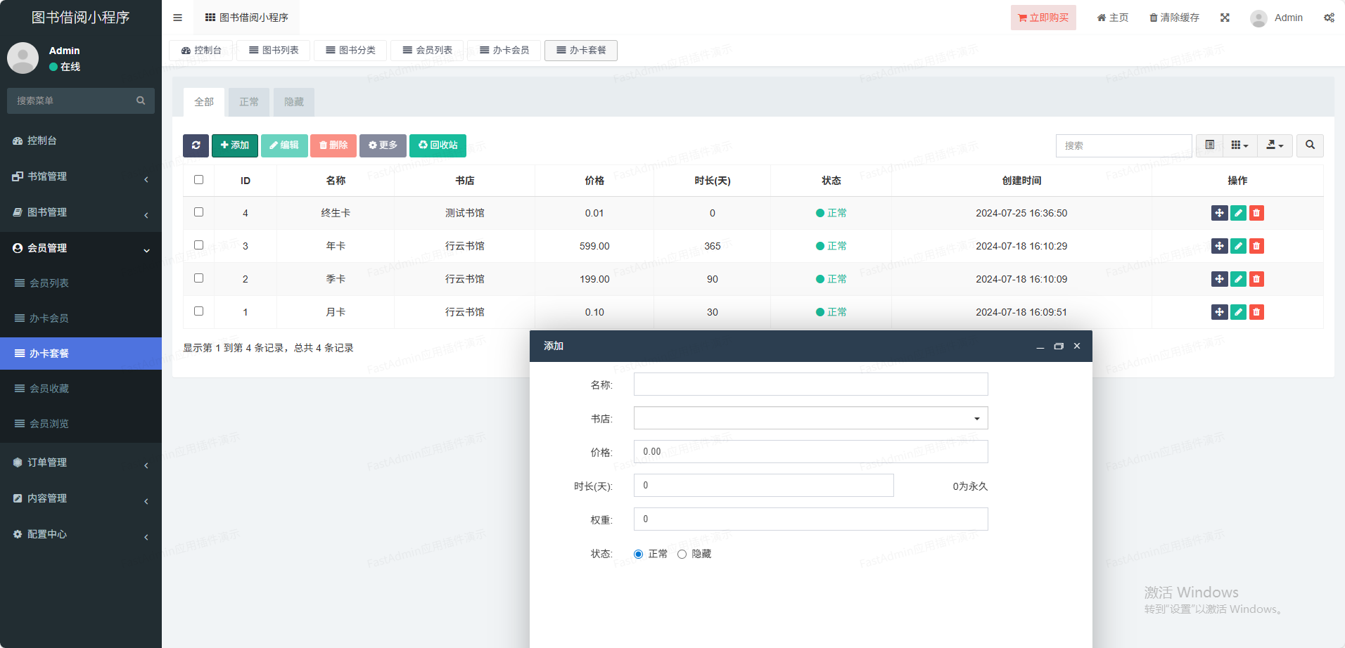 会员卡模块包含办卡会员列表可后台添加和编辑、办卡记录、办卡套餐