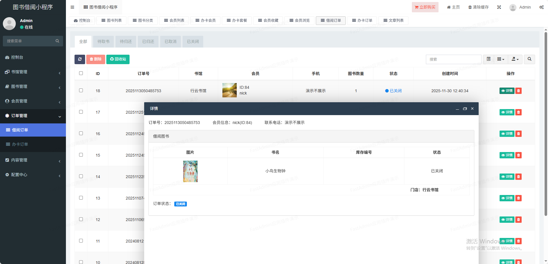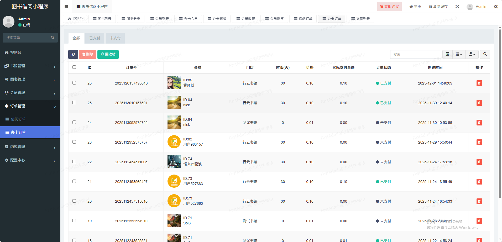统计上架图书、待还图书、办卡收入等数据和借阅订单、办卡订单增长趋势