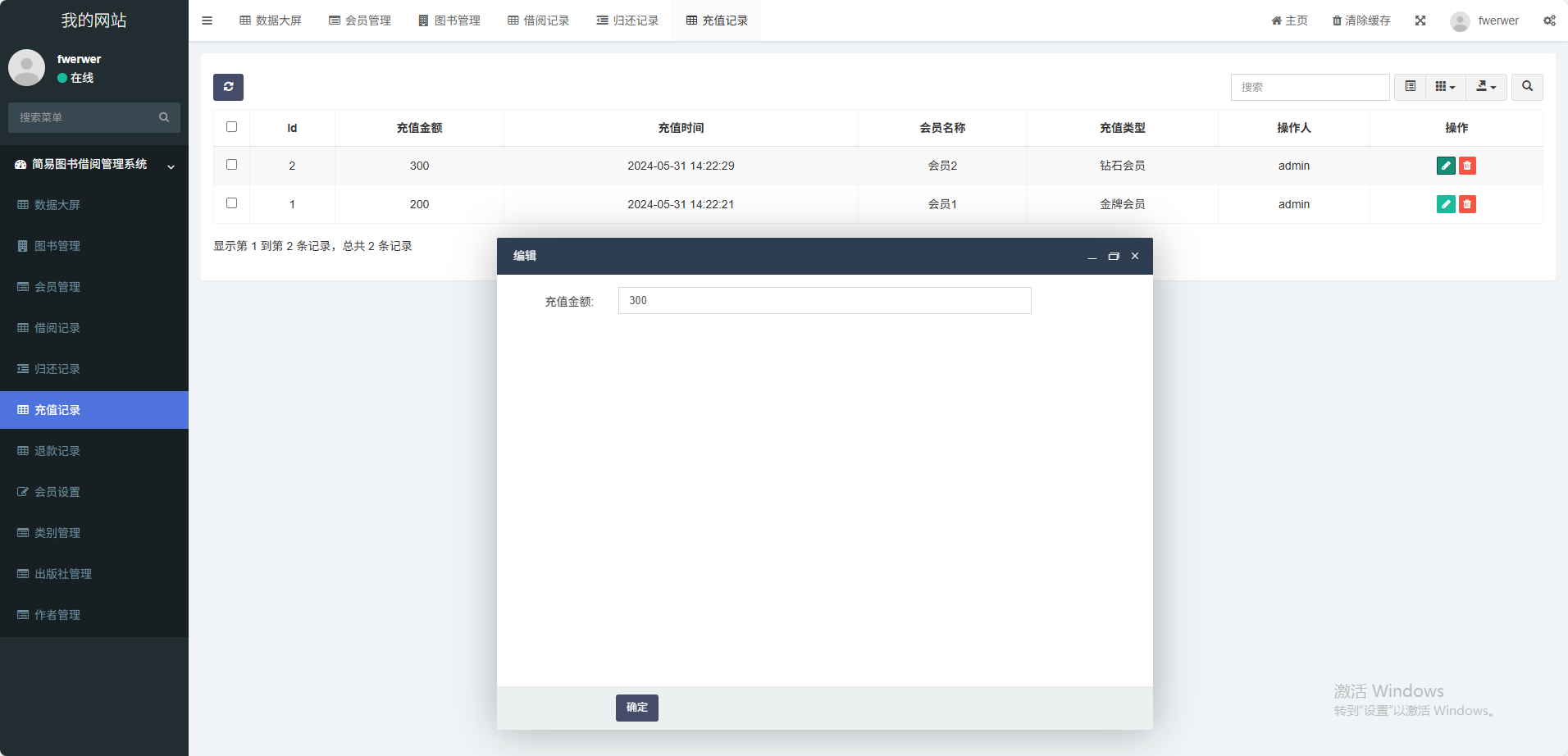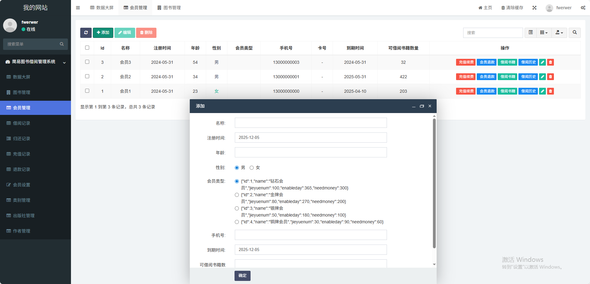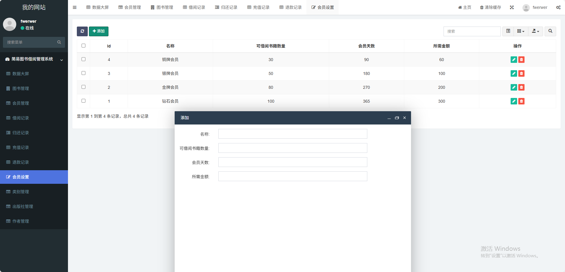 (1)图书管理图书名称、作者、出版社、类别、借阅状态、是否可借阅(2)会员管理会员名称、会员类型、手机号、会员到期时间、会员可借阅书籍数目(3)会员充值会员充值后可增加借阅时间和借阅书籍数目。(4)借阅书籍会员在借阅期内借阅书籍。分全部归还和部分归还及借阅中3种状态(5)归还书籍会员归还书籍,可单次归还也可全部归还。(6)借阅历史查询会员借阅书籍及归还记录(7)充值记录查询会员充值类型及历史(8)会员类别充值会员的类别,可自定义会员级别充值金额、到期时间、可借阅书籍数目(9)类别管理支持管理书籍类别(10)出版社管理支持管理出版社(11)作者管理支持管理书籍作者