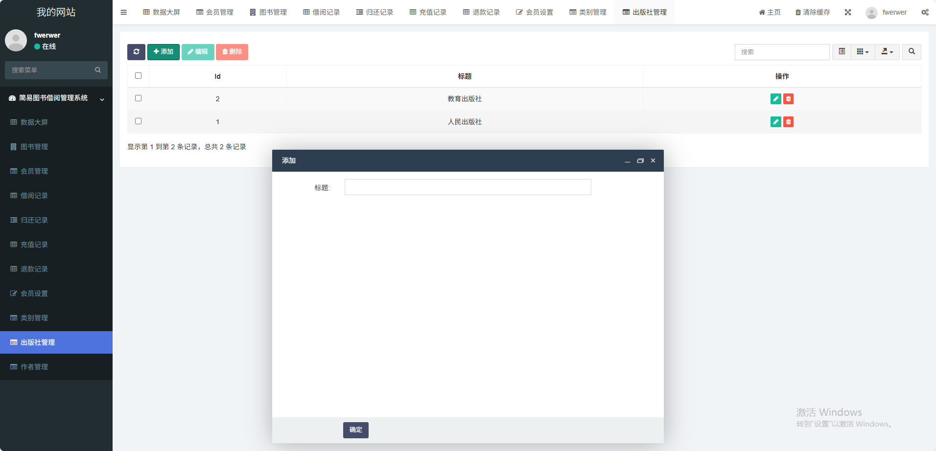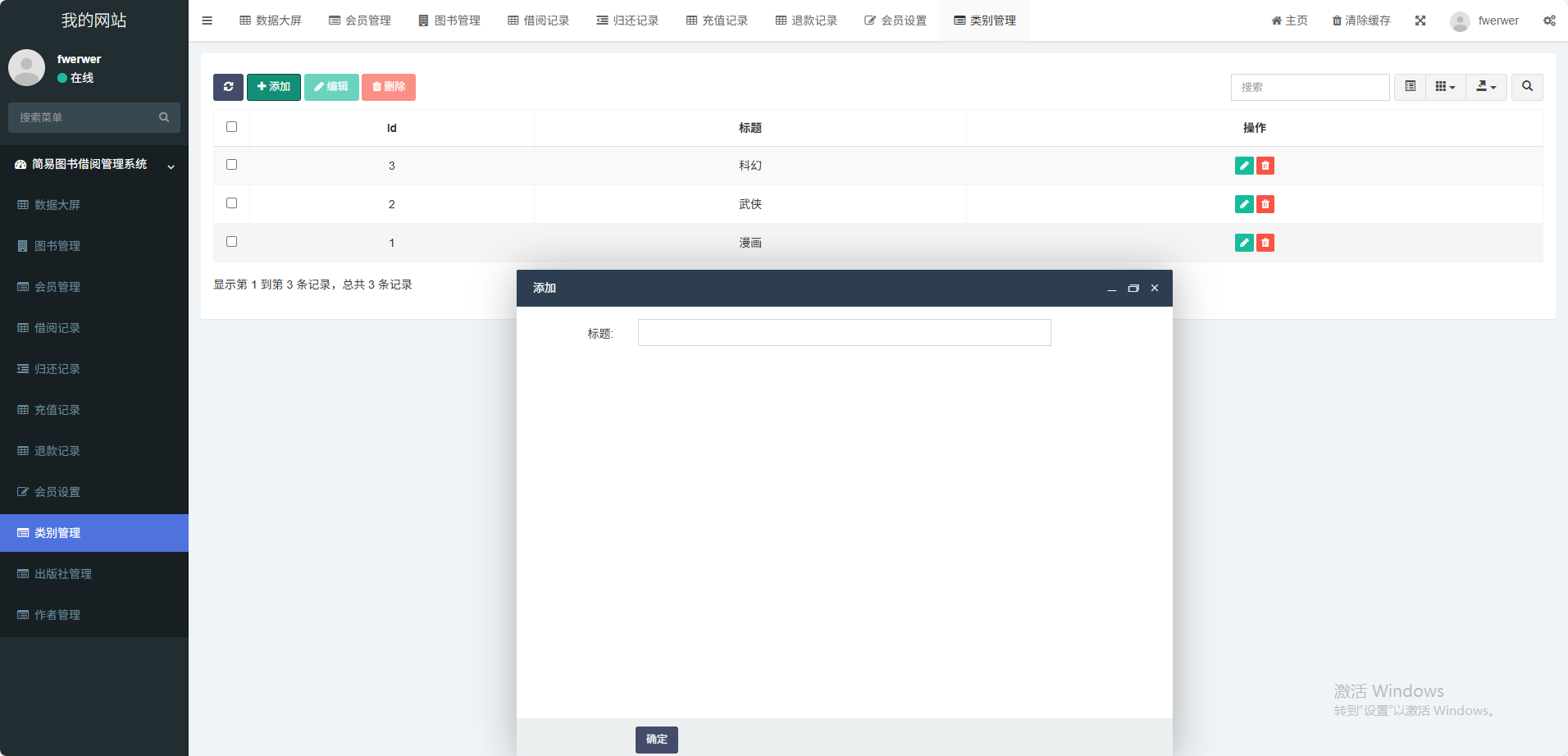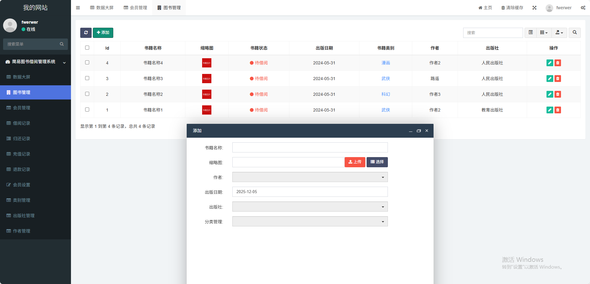 (1)图书管理图书名称、作者、出版社、类别、借阅状态、是否可借阅(2)会员管理会员名称、会员类型、手机号、会员到期时间、会员可借阅书籍数目(3)会员充值会员充值后可增加借阅时间和借阅书籍数目。(4)借阅书籍会员在借阅期内借阅书籍。分全部归还和部分归还及借阅中3种状态(5)归还书籍会员归还书籍,可单次归还也可全部归还。(6)借阅历史查询会员借阅书籍及归还记录(7)充值记录查询会员充值类型及历史(8)会员类别充值会员的类别,可自定义会员级别充值金额、到期时间、可借阅书籍数目(9)类别管理支持管理书籍类别(10)出版社管理支持管理出版社(11)作者管理支持管理书籍作者