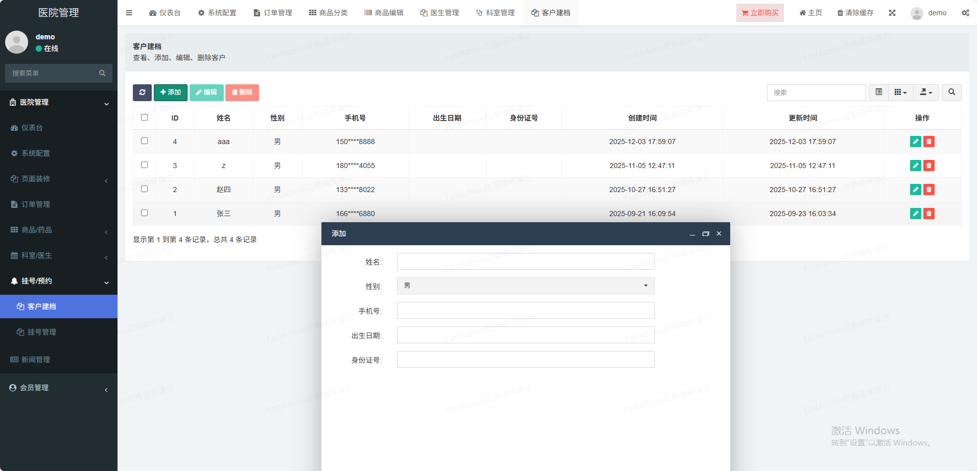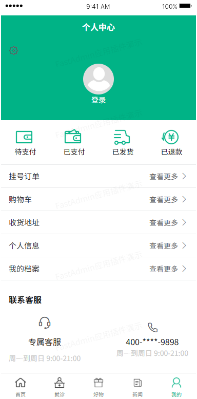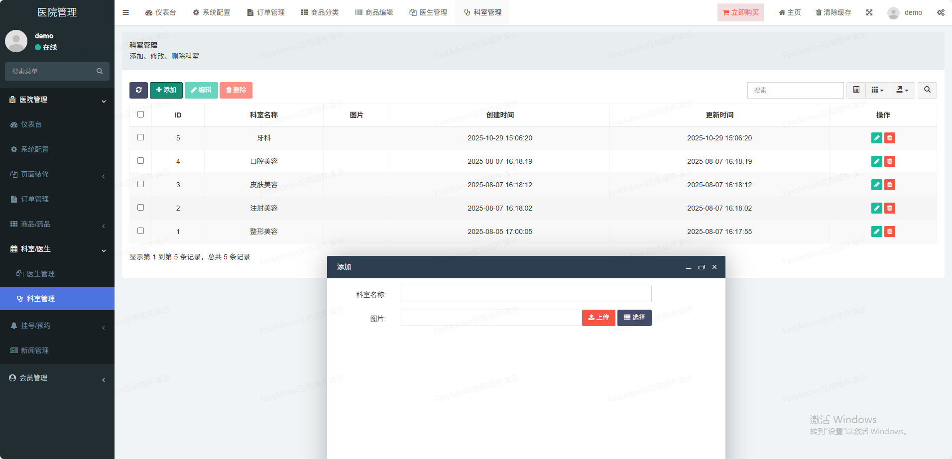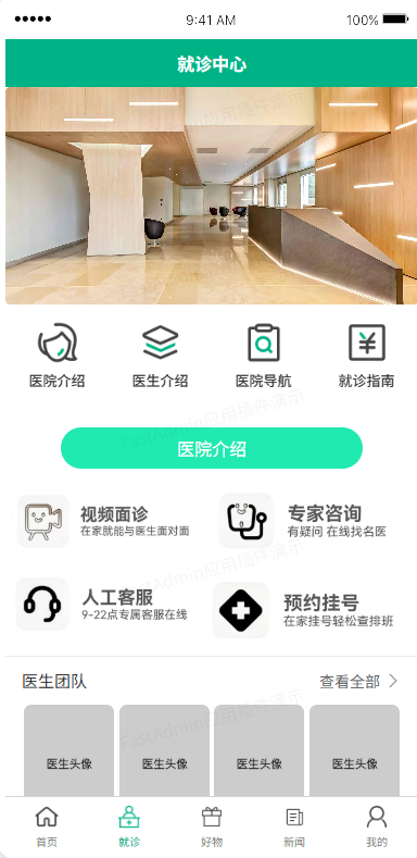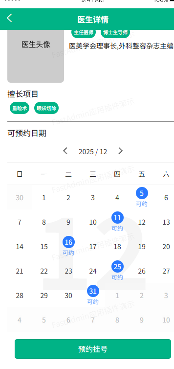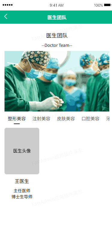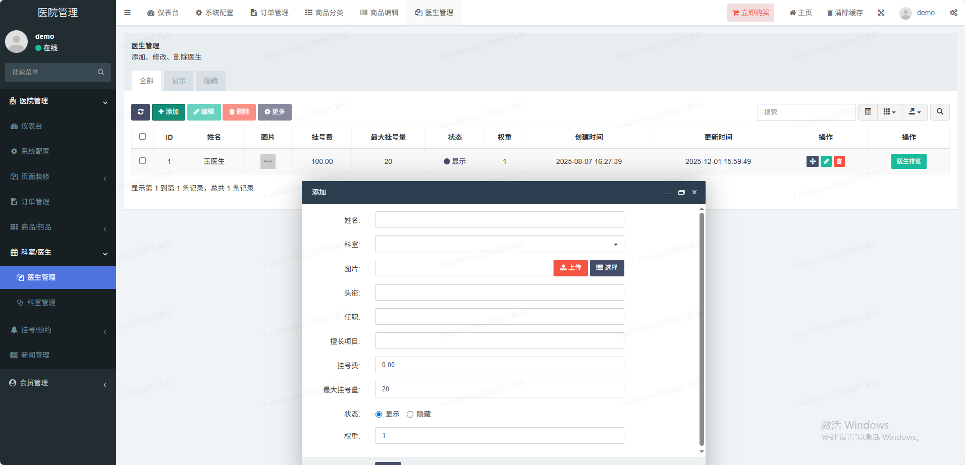 可自由添加、删除、修改科室和医生,医生可展示荣誉、头衔、经历、擅长项目,可针对不同医生设置挂号费。