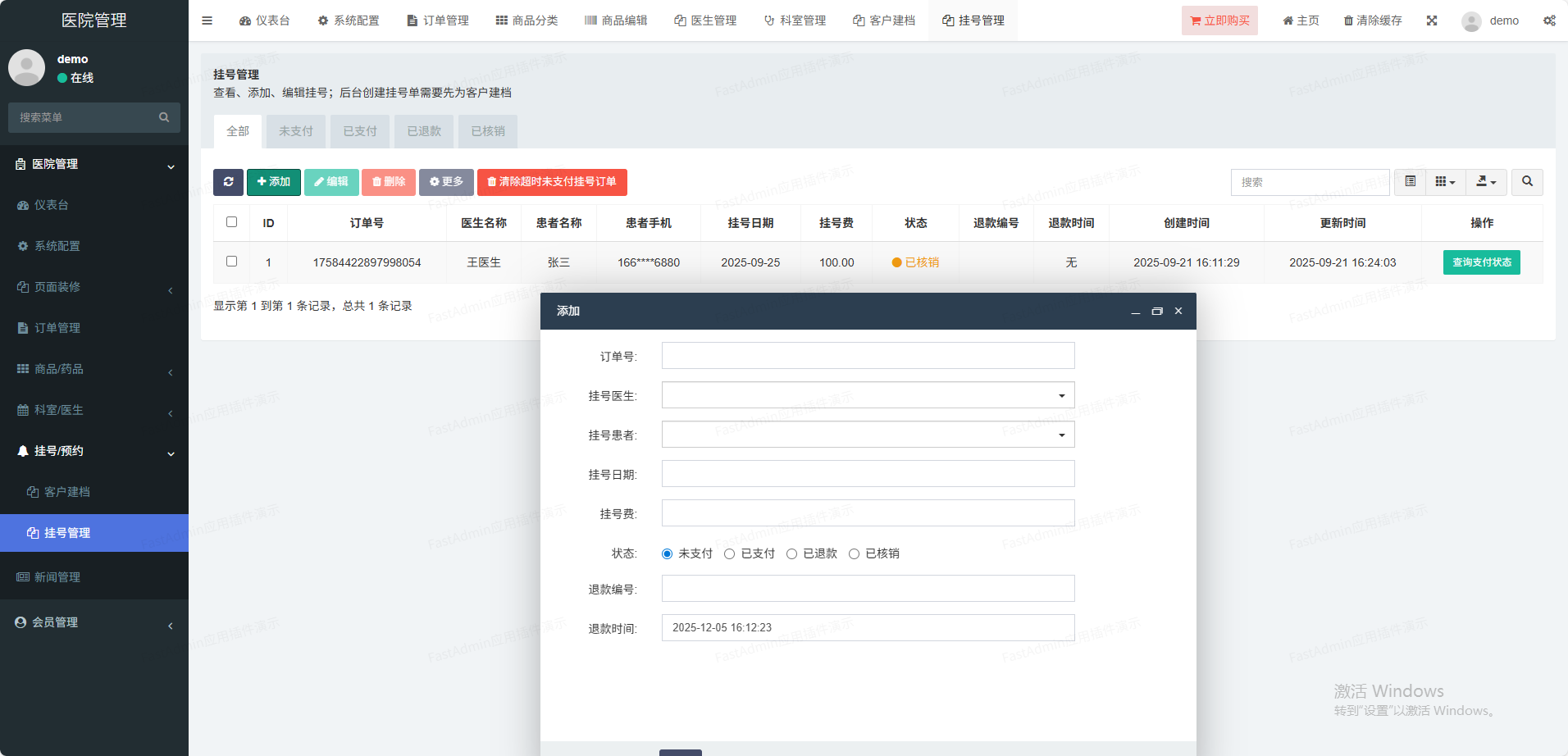 针对已排班医生,患者可手机自助挂号并支付;如未就诊,可手机申请退号,挂号费自动到账。后台可修改退号退费条件。