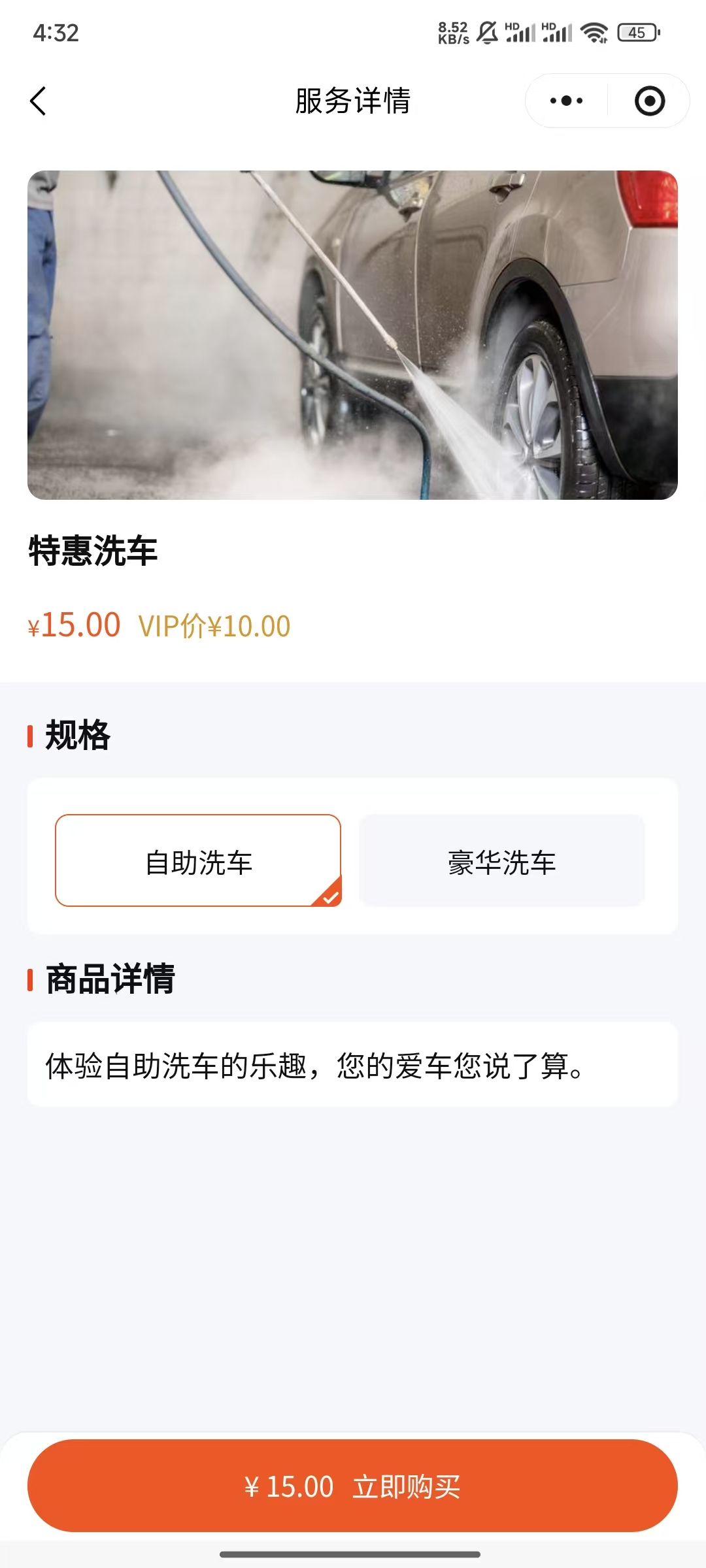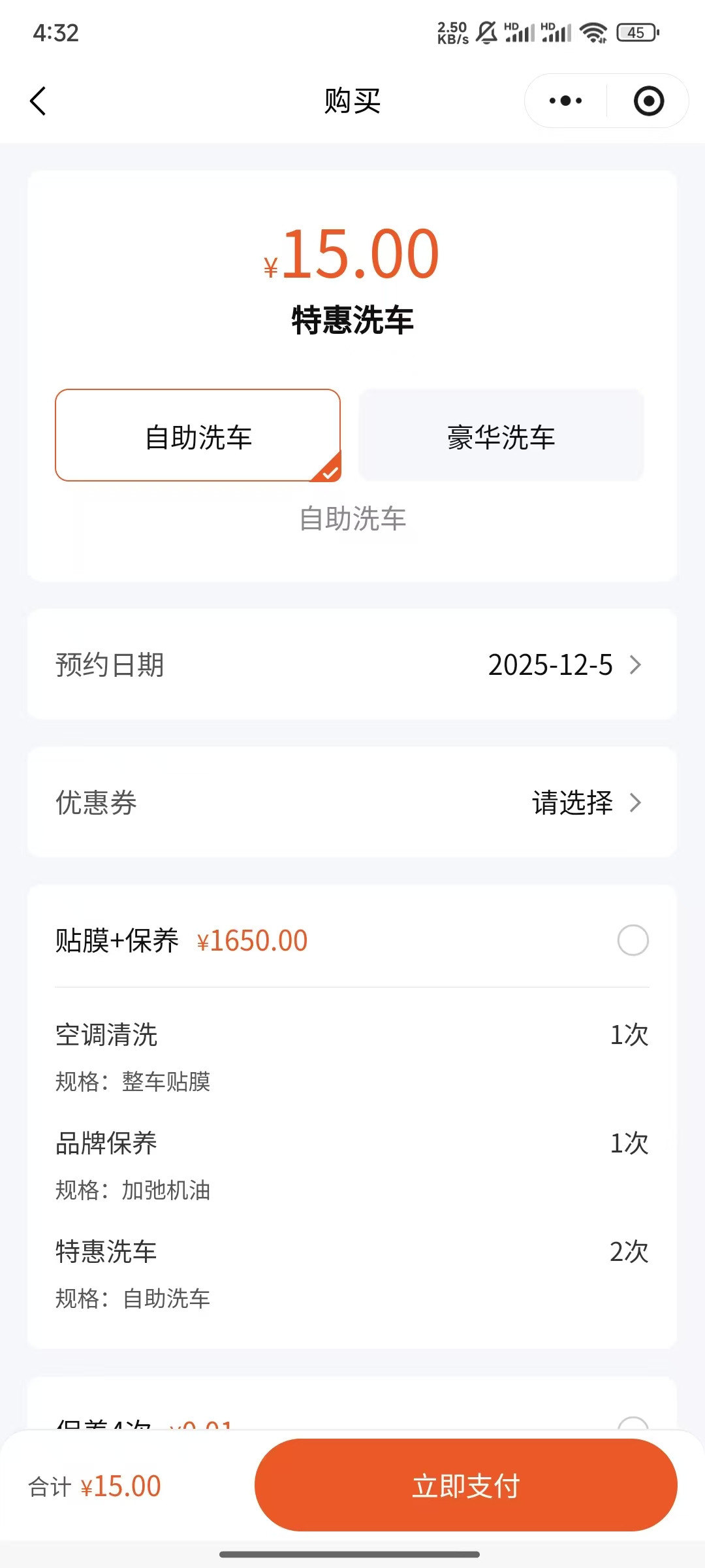 用户现在预约服务,可微信支付或使用套餐卡抵扣