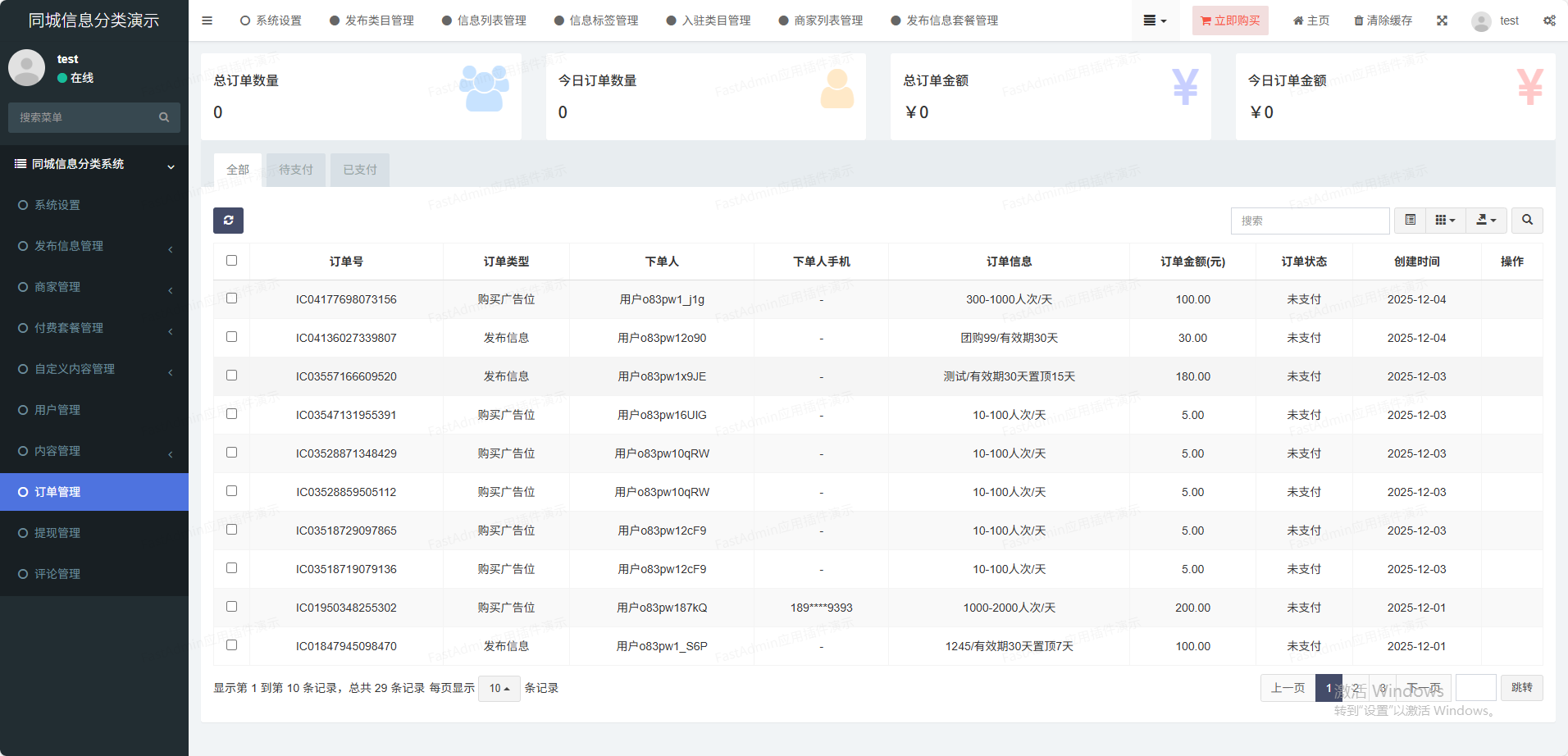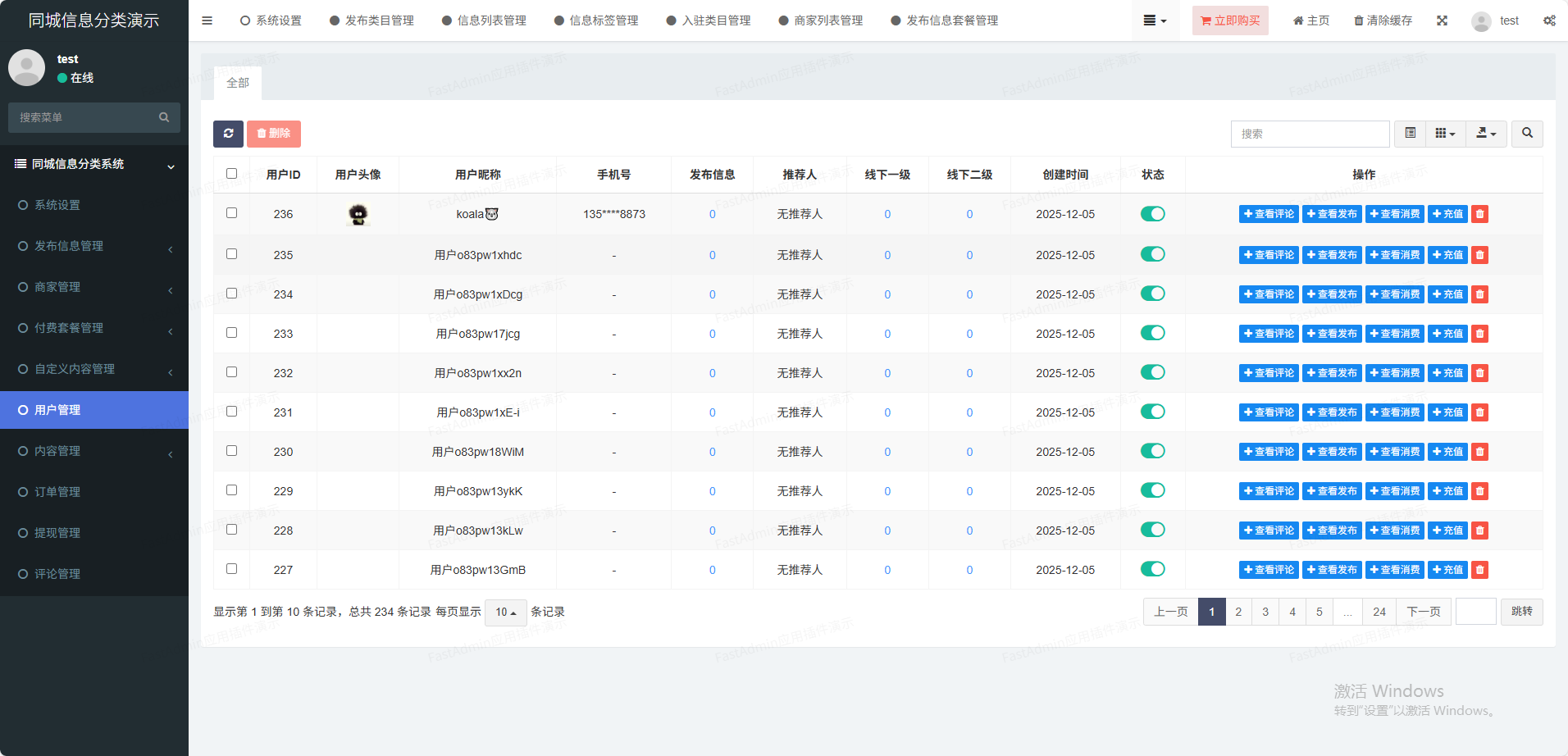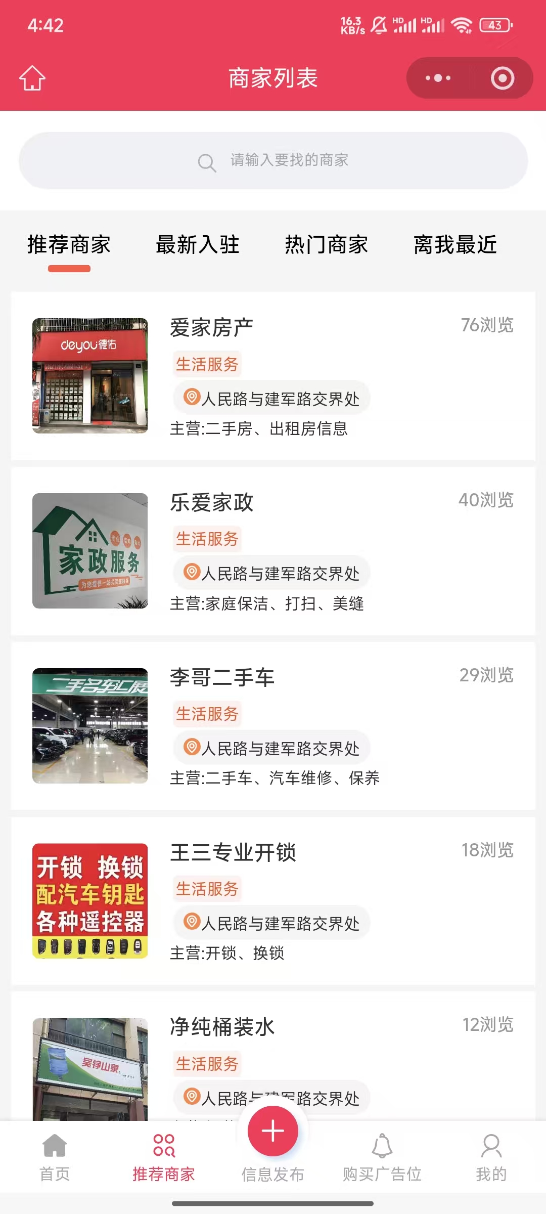 (1)信息分类支持后台自定义信息类别(2)信息发布支持前端按分类发布信息内容(3)付费套餐支持按有效日期发布信息付费、广告付费、商家入驻付费(4)信息置顶支持发布信息按时间付费置顶功能(5)商家入驻支持商家入驻提交信息并展示及入驻付费(6)广告管理支持线上付费购买广告位(7)评论管理支持用户对信息评论及按类目开启评论功能(8)后端订单支持后端信息、置顶、广告、商家入驻付费订单列表(9)分销推广支持生成海报推广用户进入平台消费获得佣金分成(10)常见问题