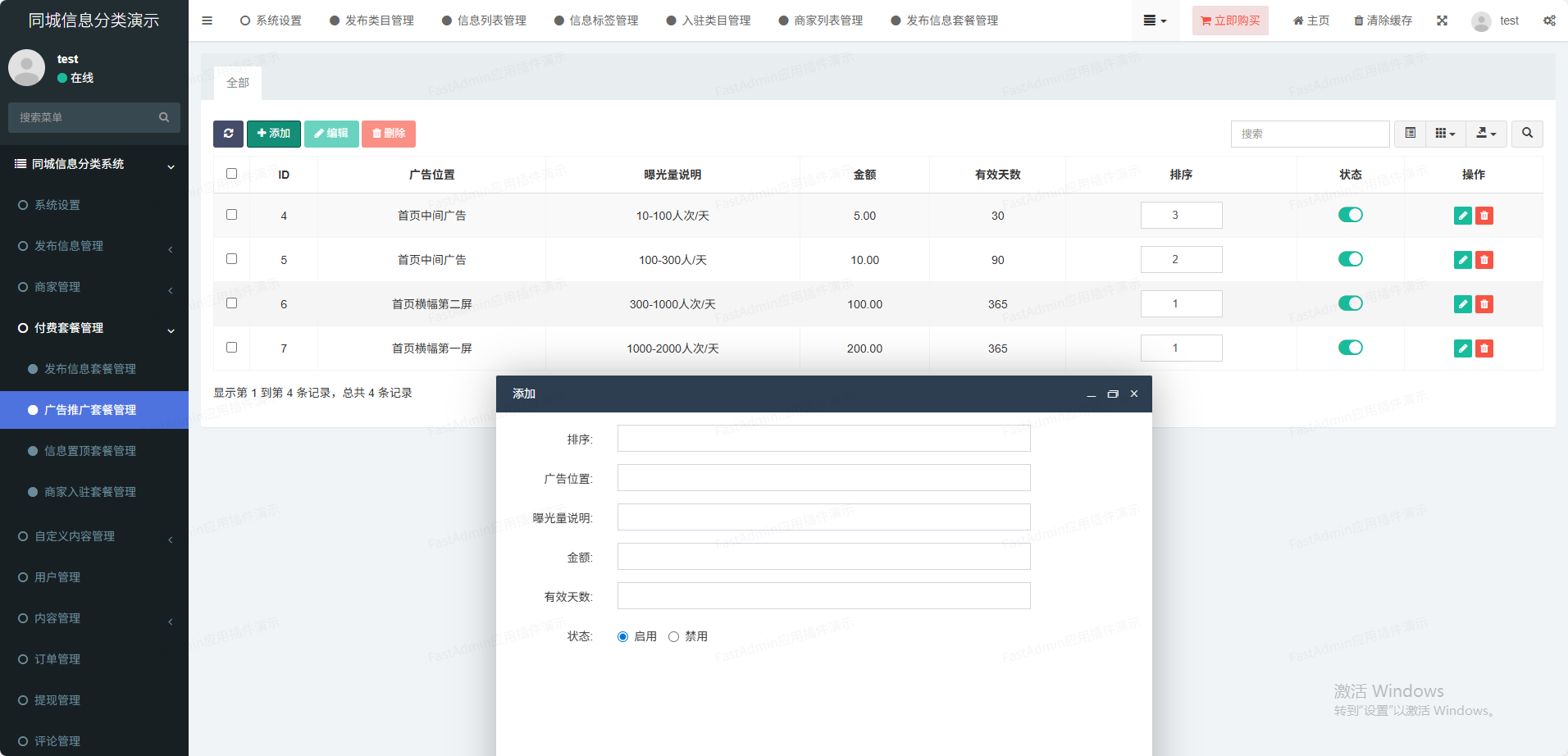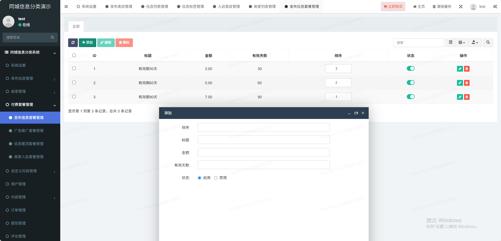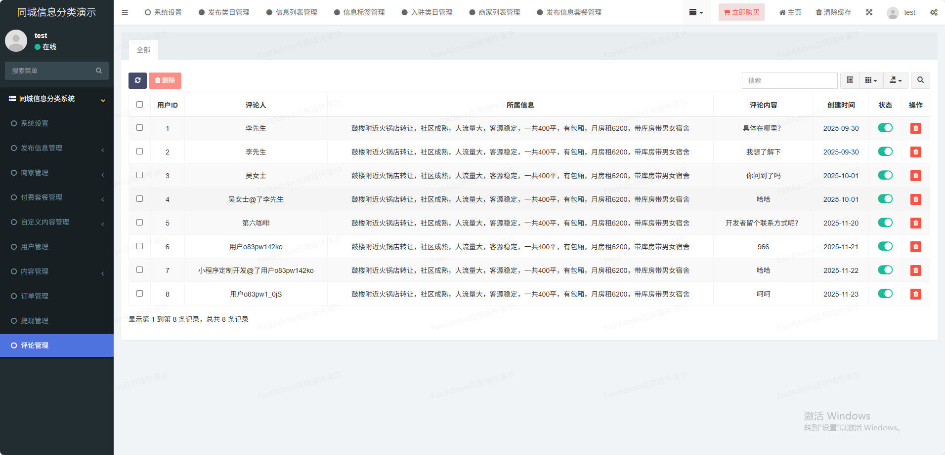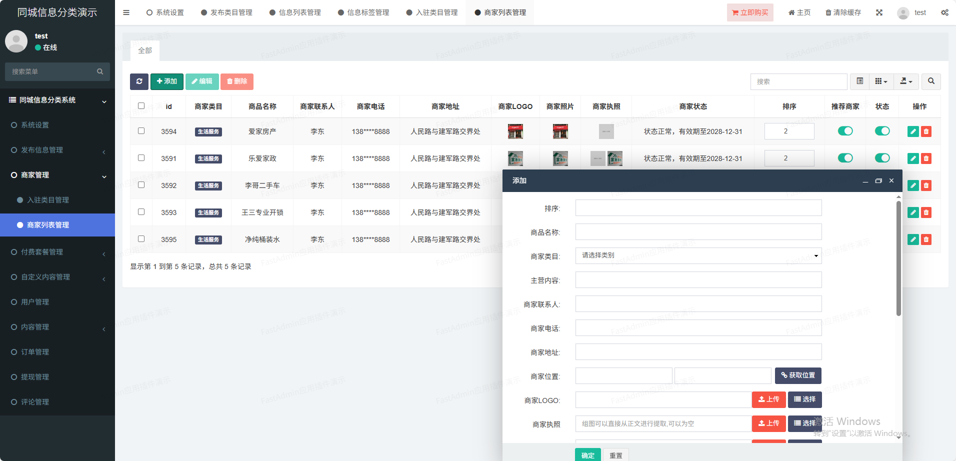 (1)信息分类支持后台自定义信息类别(2)信息发布支持前端按分类发布信息内容(3)付费套餐支持按有效日期发布信息付费、广告付费、商家入驻付费(4)信息置顶支持发布信息按时间付费置顶功能(5)商家入驻支持商家入驻提交信息并展示及入驻付费(6)广告管理支持线上付费购买广告位(7)评论管理支持用户对信息评论及按类目开启评论功能(8)后端订单支持后端信息、置顶、广告、商家入驻付费订单列表(9)分销推广支持生成海报推广用户进入平台消费获得佣金分成(10)常见问题