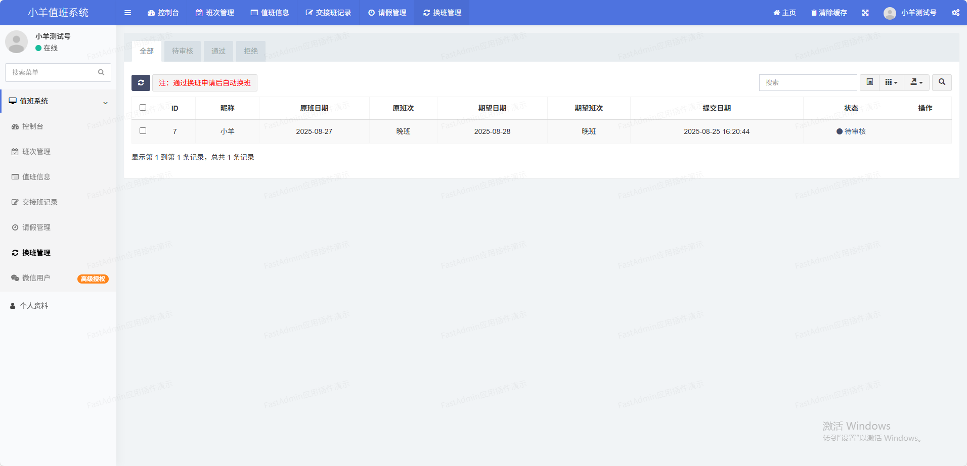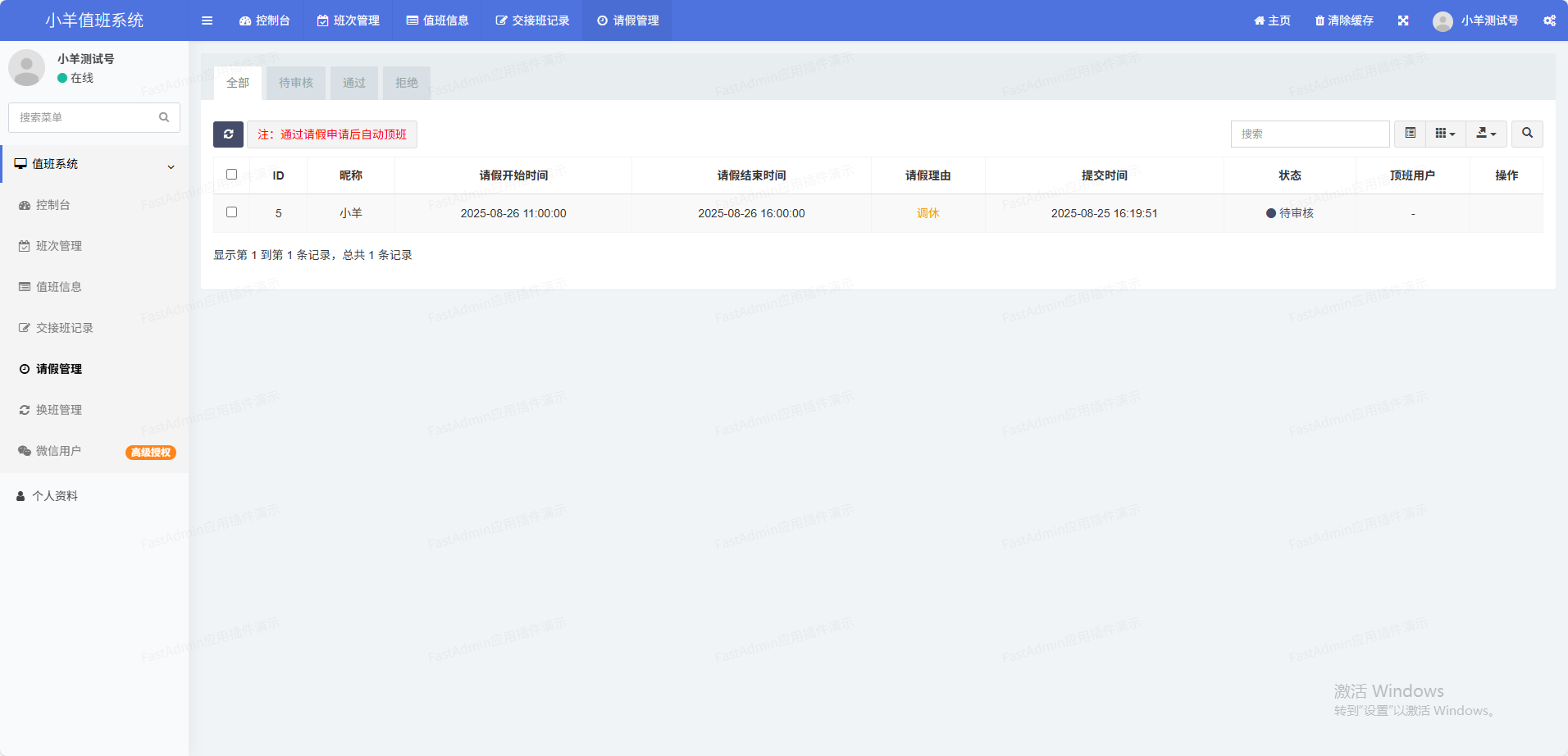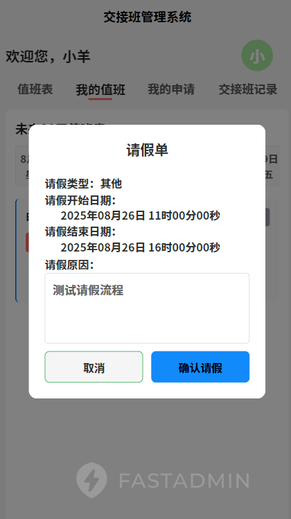 后台接收请假 / 换班申请,可查看详情并审批,审批结果同步至申请人。