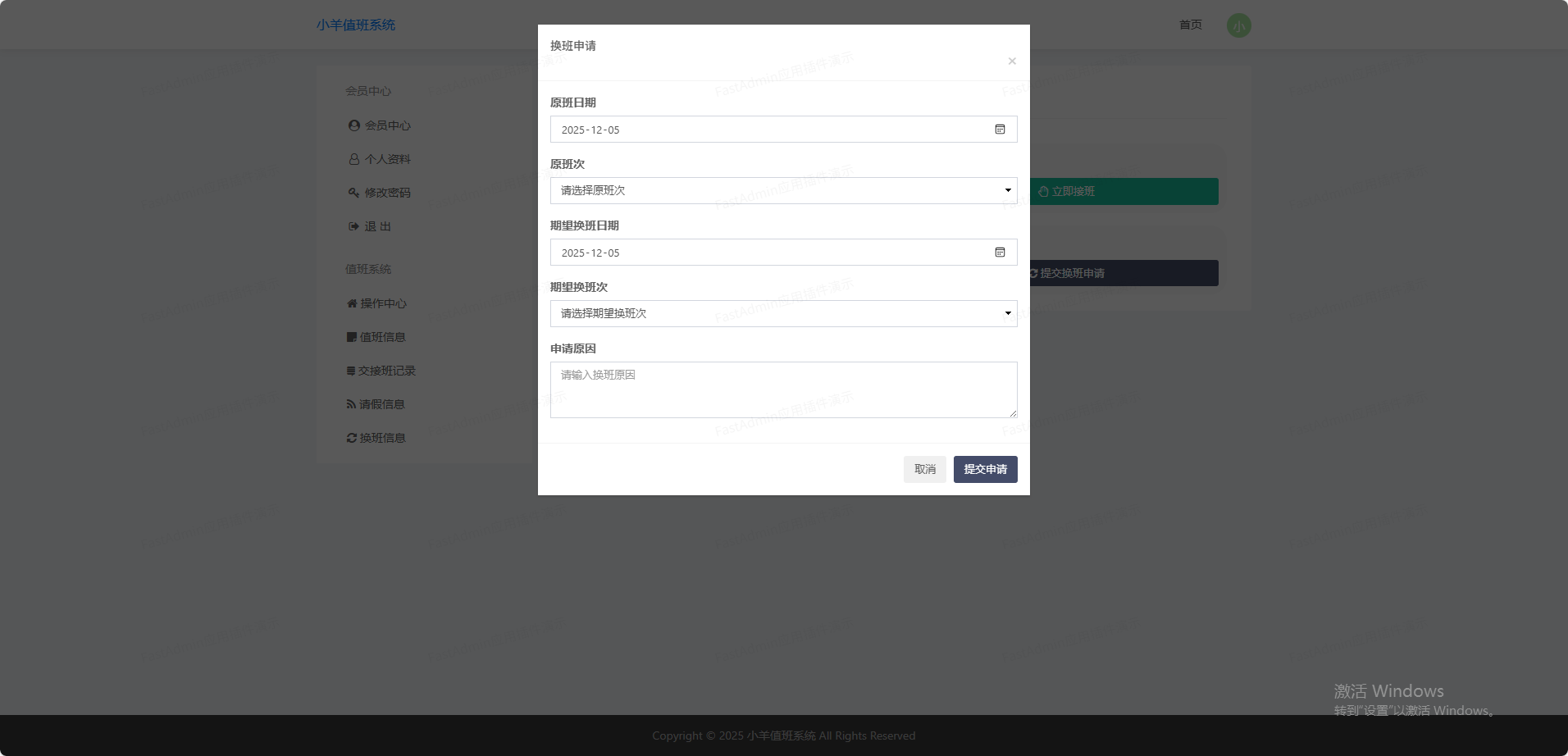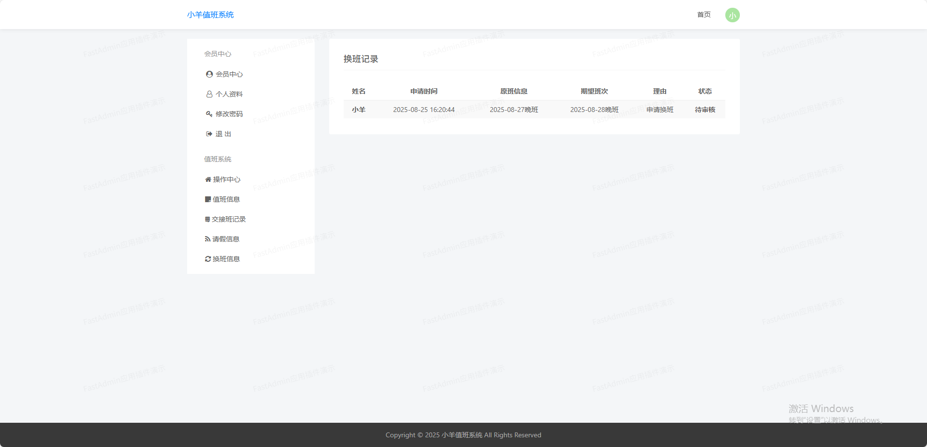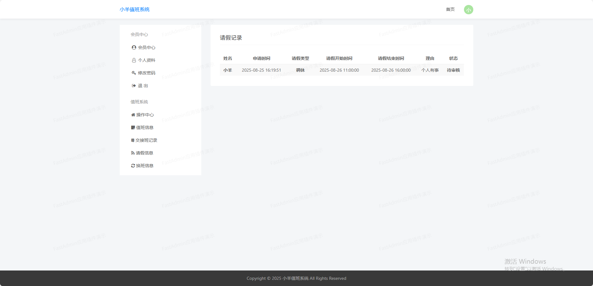 后台接收请假 / 换班申请,可查看详情并审批,审批结果同步至申请人。