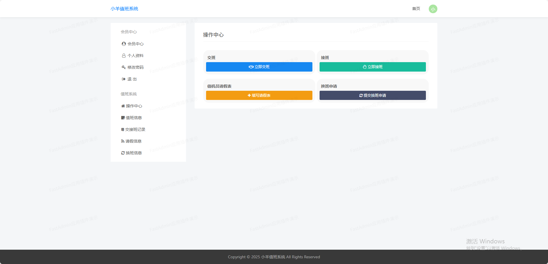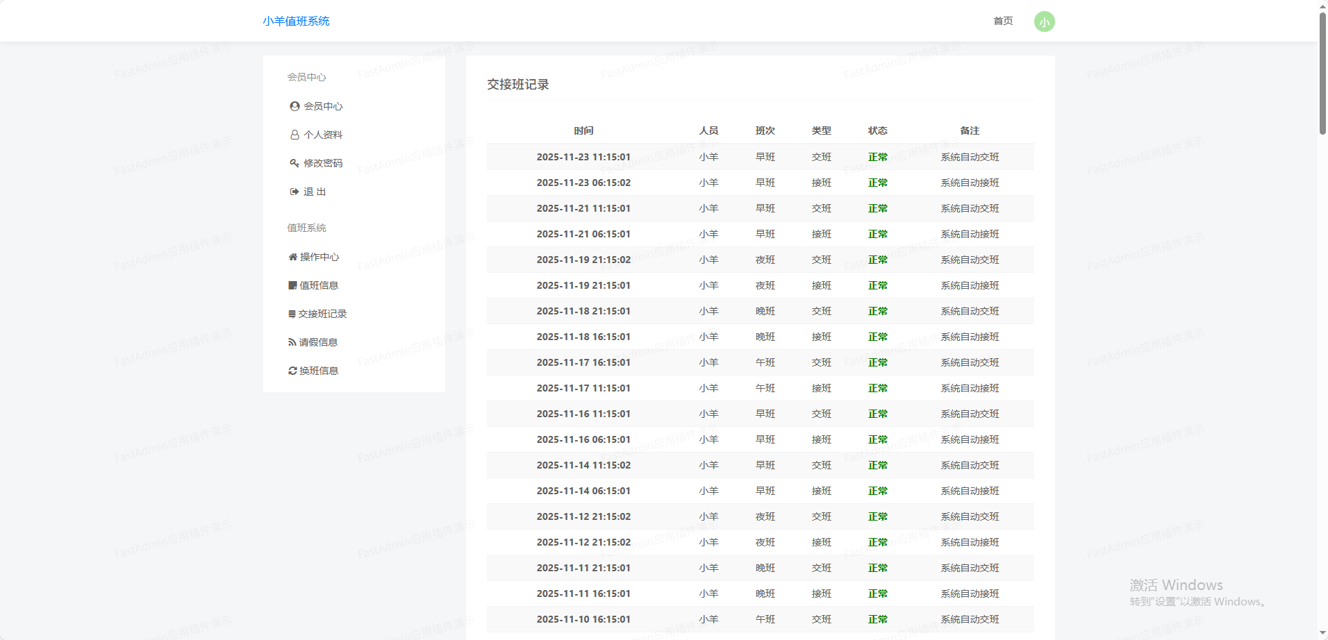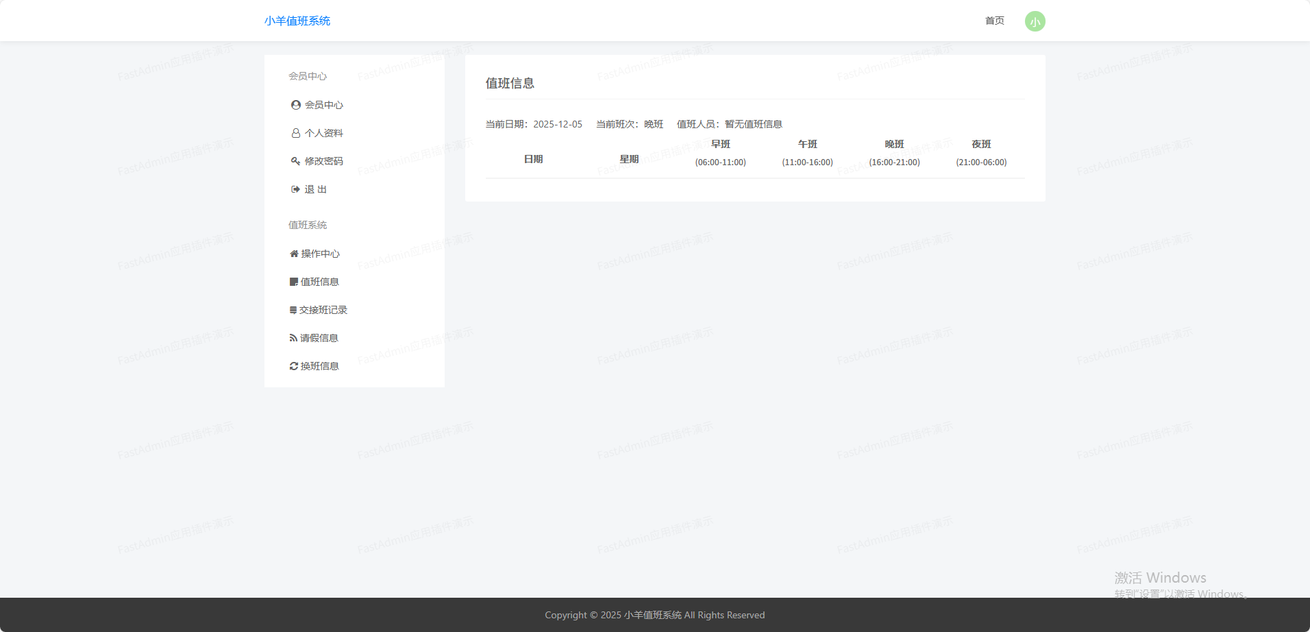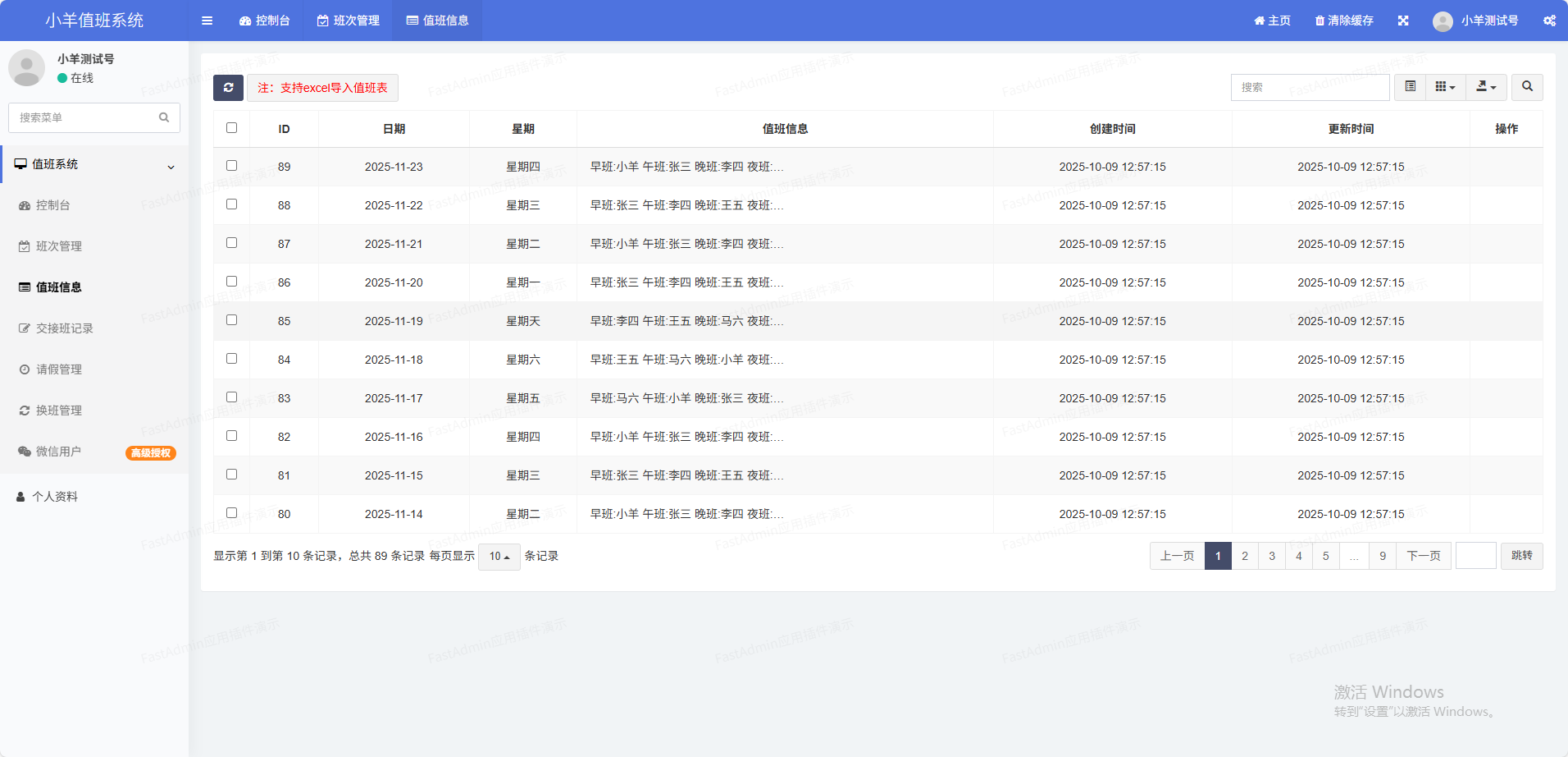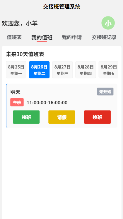 前台可查看实时值班表,清晰显示当日 / 未来班次、值班人员,方便提前规划。