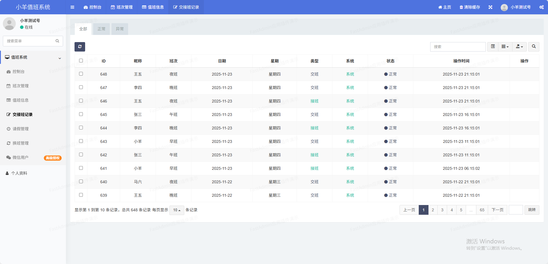 前台登录后,交班人可选填异常内容提交,接班人确认完成交接,系统记双方信息与时间。