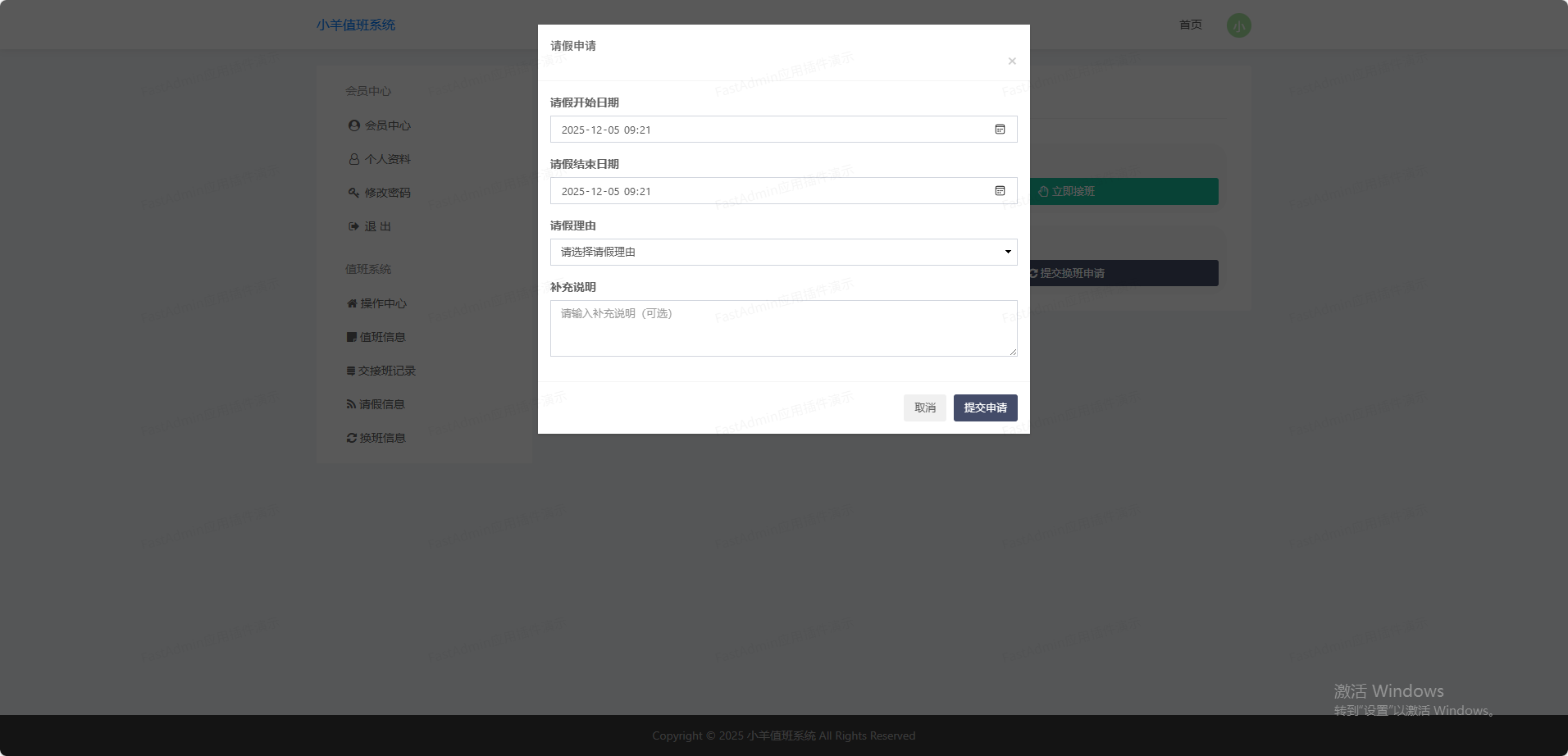 前台发起请假,选日期、类型填理由,提交后待管理员审批。