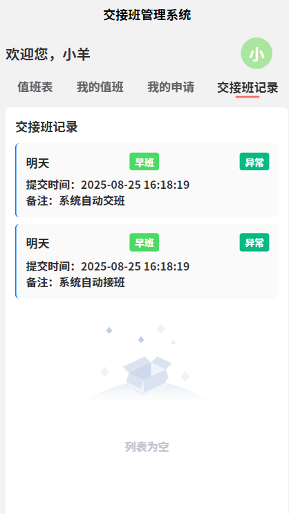 查值班记录(时段、交接对象等)、请假换班记录(状态、审批意见等),支持日期筛选。