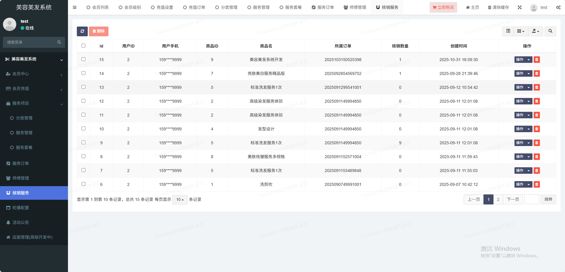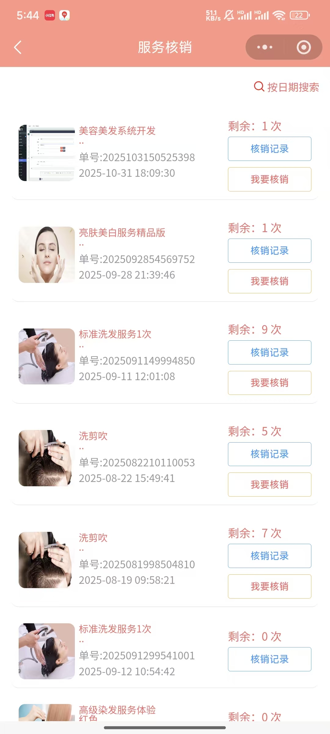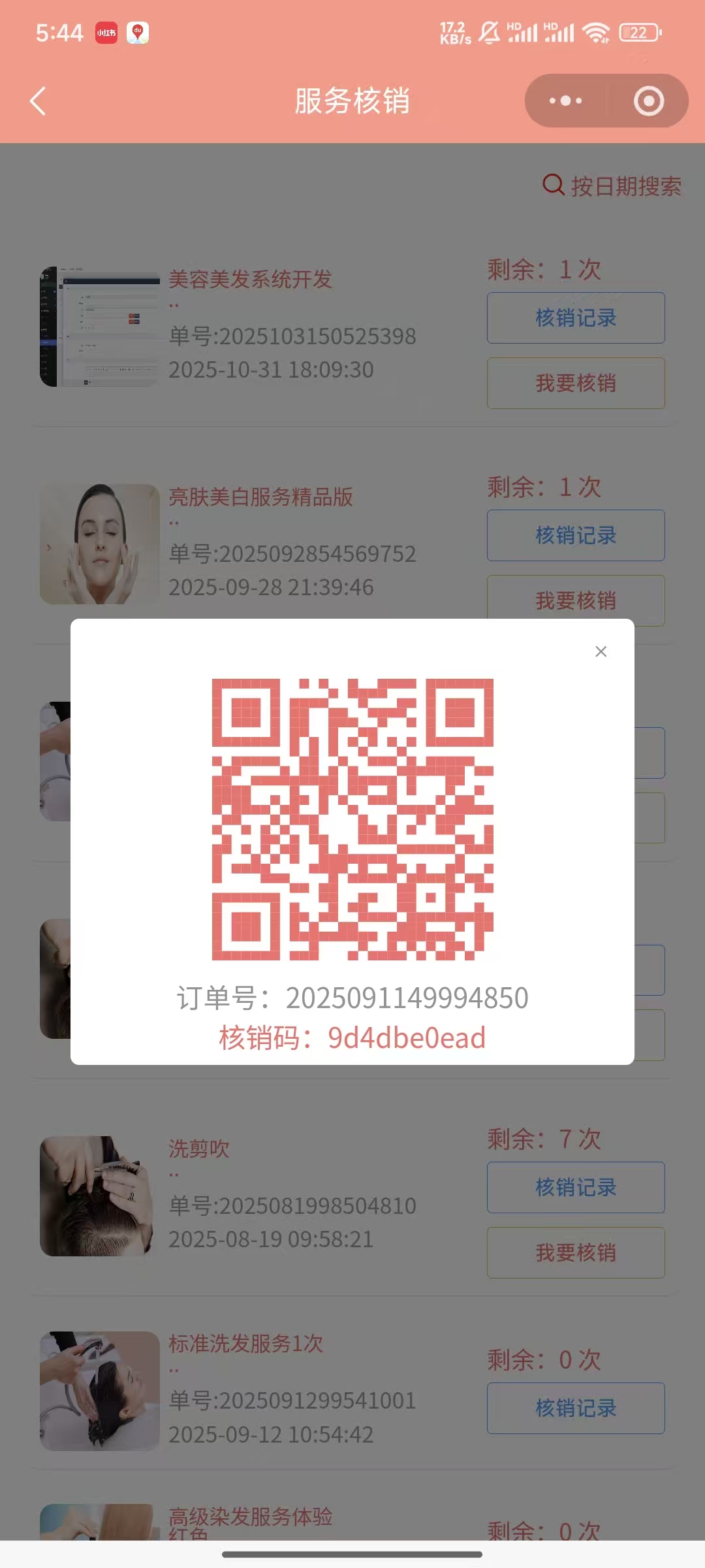 根据服务订单,生成核销码和二维码,套餐服务(包括多个服务)按服务个数生成多个核销单分别进行核销。
