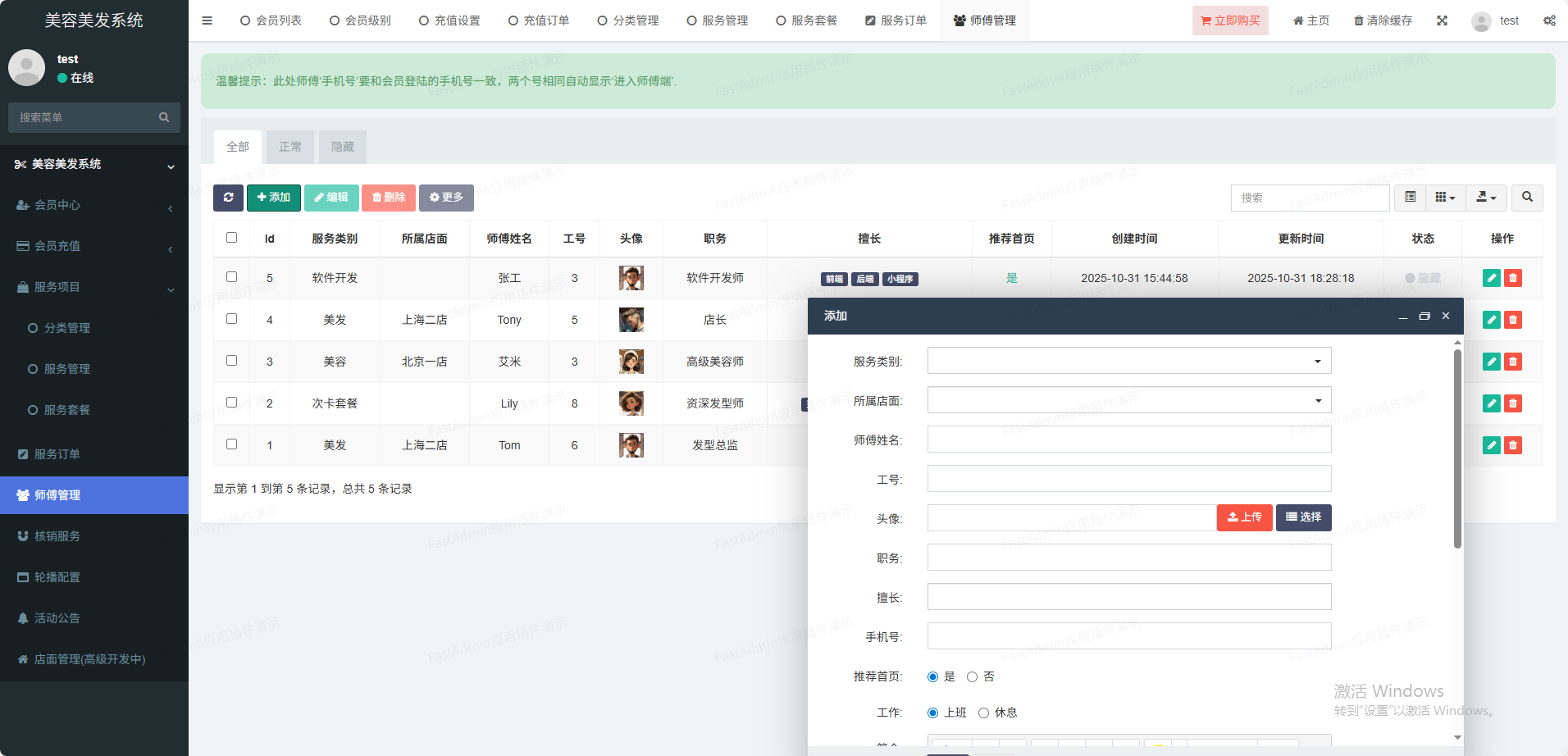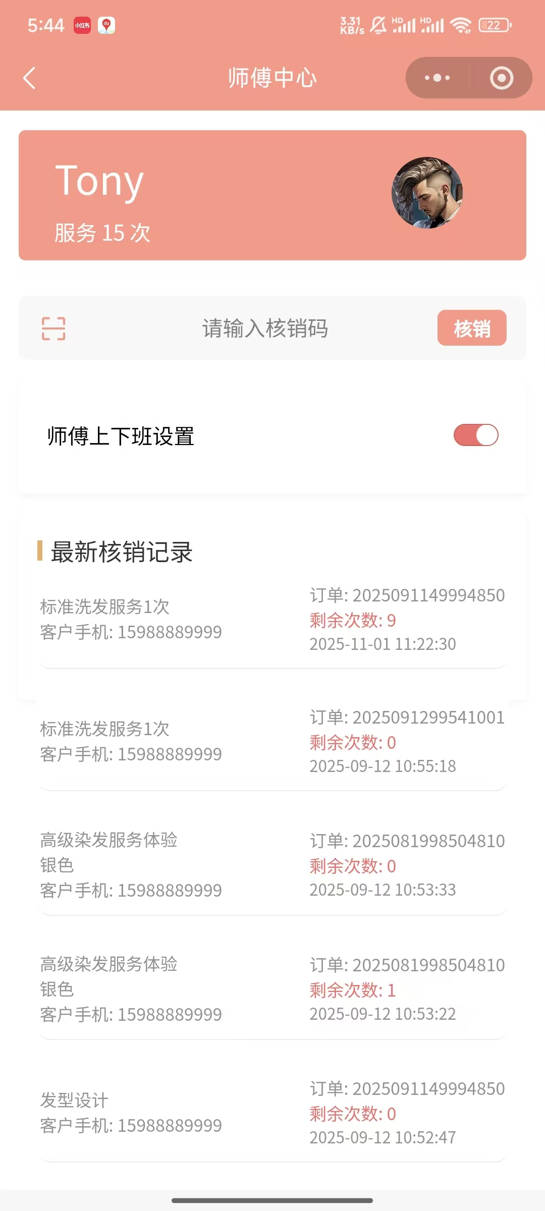 师傅手机号来判断登陆师傅管理中心,师傅可以在小程序内进行核销服务,可设置上下班。显示自己的累积服务次数。